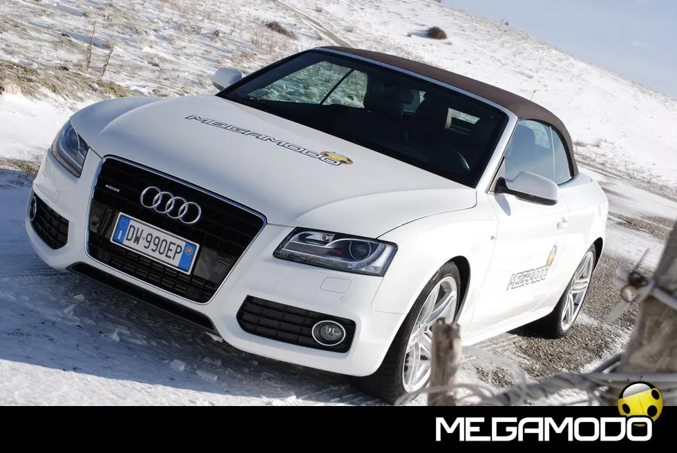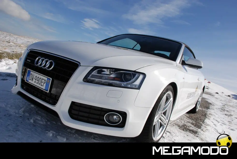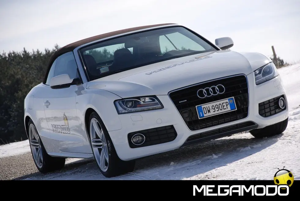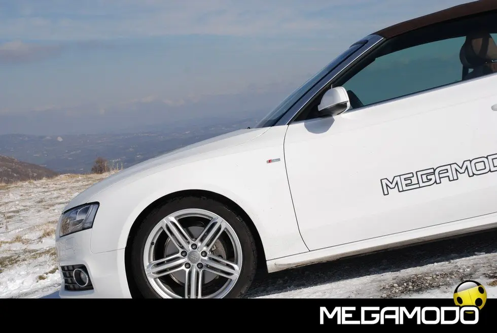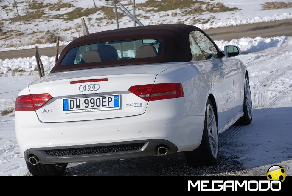 A richiesta è disponibile come primo equipaggiamento una sacca portasci, mentre si trova di serie nel vano bagagli una presa di corrente da 12 Volt. Il cofano posteriore con serratura elettrica ha un’apertura che consente di caricare due sacche da golf. Anche la soglia di carico bassa facilita lo sfruttamento del bagagliaio. Il frangivento di serie viene fissato sopra i sedili posteriori, se inutilizzato può essere comodamente ripiegato nel vano bagagli. Come ogni Audi, anche la A5 Cabriolet ha una carrozzeria estremamente rigida, presupposto essenziale per un handling preciso e sportivo, un comfort di rotolamento superiore e un’elevata sicurezza in caso di impatto. Nella A5 scoperta quasi non si percepiscono oscillazioni e vibrazioni; nemmeno sul volante e sui sedili.Per la carrozzeria grezza sono state utilizzate tecnologie innovative. Un esempio paradigmatico è dato dagli acciai ultra-altoresistenziali, per la maggior parte prodotti direttamente dalla Audi con processo di formatura a caldo. Vengono utilizzati nei sottoporta, nei longheroni, nel tunnel centrale, nei montanti centrali e nella traversa del frontale e conciliano il peso contenuto con una resistenza alla trazione estremamente elevata. Una serie di elementi di rinforzo supplementari compensa ampiamente la mancanza di un tetto fisso.