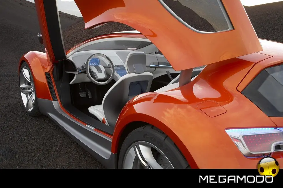 Altri dettagli di design sono le portiere con apertura a libro, i gruppi ottici anteriori e posteriori dalla forma plastica e la tonalità Orange Metallic della carrozzeria con inserti color argento scuro.