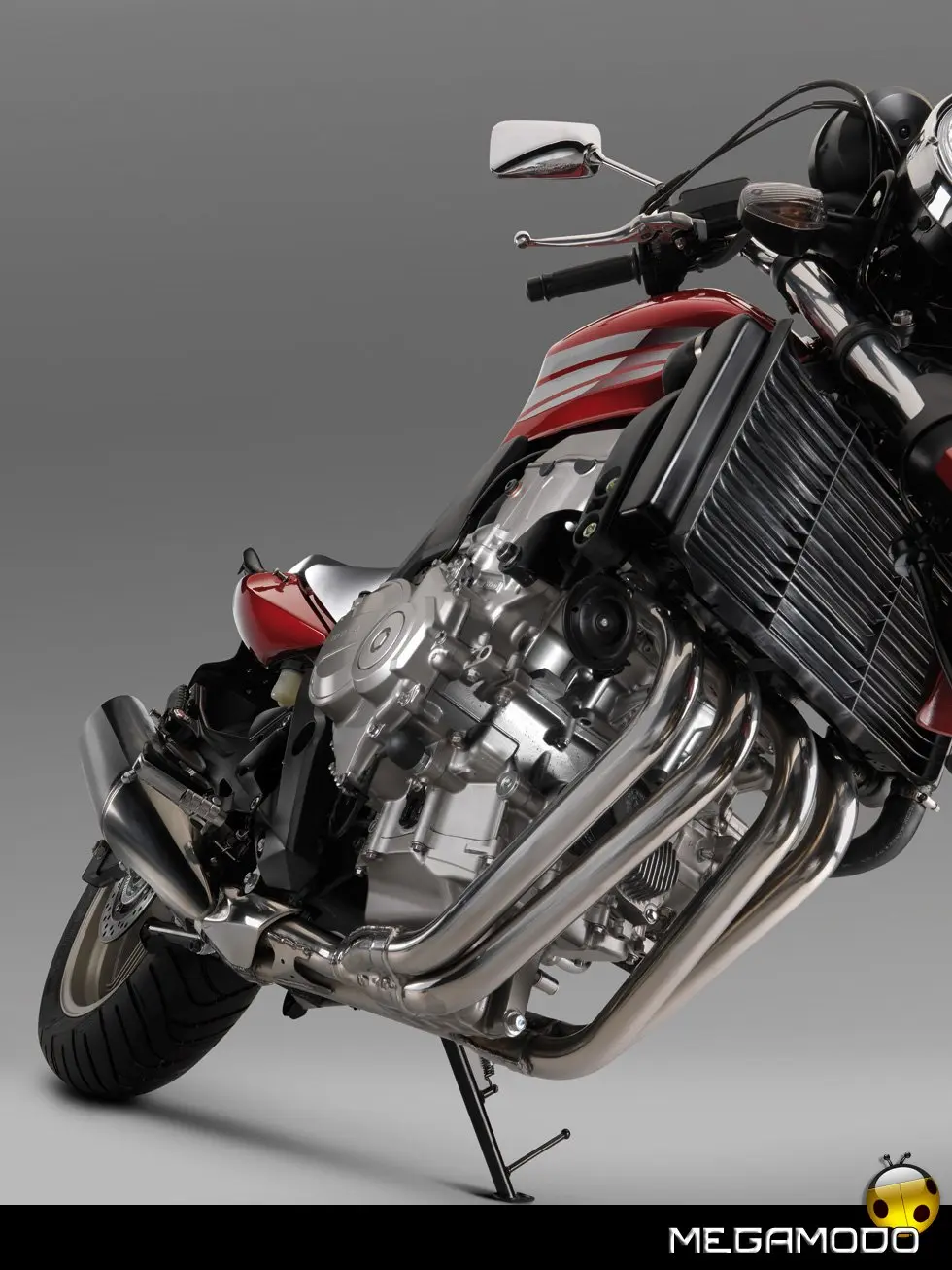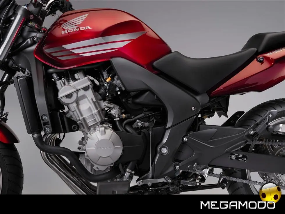 Nuovo Telaio Monotrave in Alluminio L'innovativo telaio monotrave in alluminio, realizzato con l’esclusivo procedimento della fusione gravitazionale, richiama quello già adottato sulla Hornet 600 del 2007. Le tre sezioni pressofuse (trave anteriore con cannotto di sterzo, trave dorsale ed area del perno del forcellone) sono ottimamente saldate, il che comporta una notevole riduzione del peso complessivo. Incastonato in questa semplice struttura, il motore funge da elemento stressato nella classica configurazione romboidale. L’ultraleggero telaio in alluminio migliora di molto la robustezza e la rigidità, garantendo una maggior precisione di guida ed una più spiccata reattività nei cambi di direzione. Robusto anche il telaietto sottosella –in acciaio con sezione a scatola - che può sopportare anche l’adozione delle borse rigide e del bauletto. Per una maggior comodità di guida, sui poggiapiedi sono stati installati dei contrappesi che di fatto eliminano ogni vibrazione. Il nuovo perno del cavalletto centrale e l’astina di richiamo più lunga agevolano il parcheggio della moto.