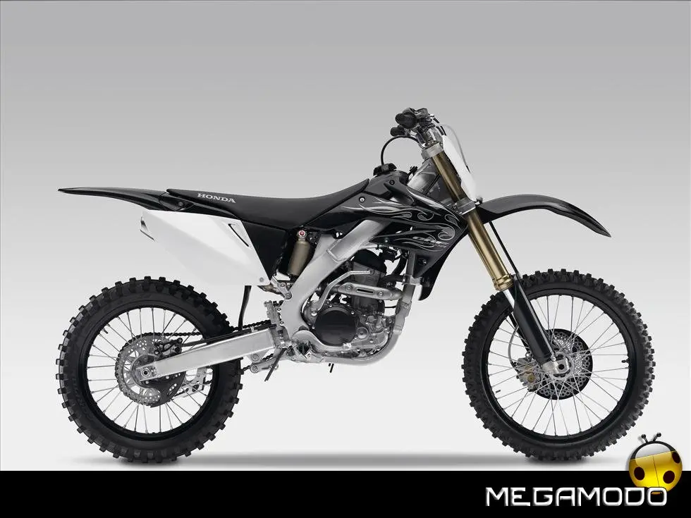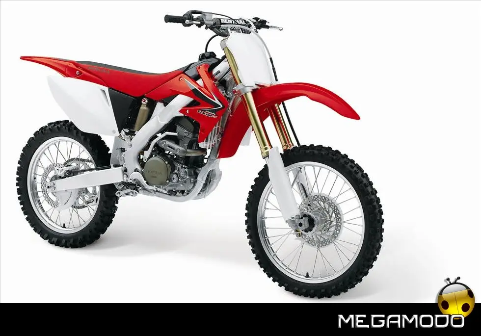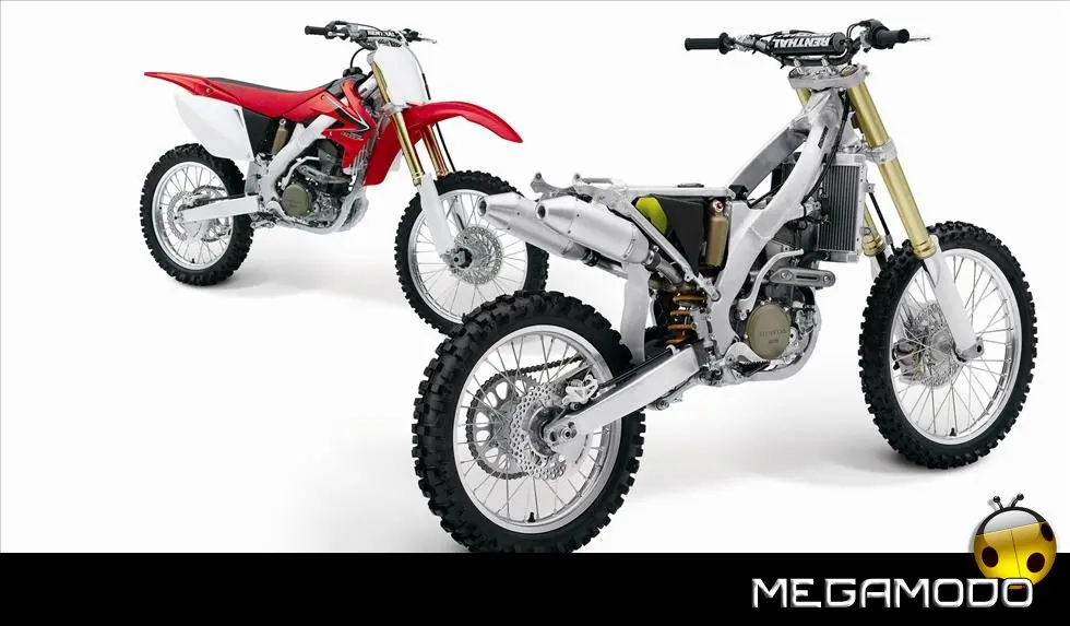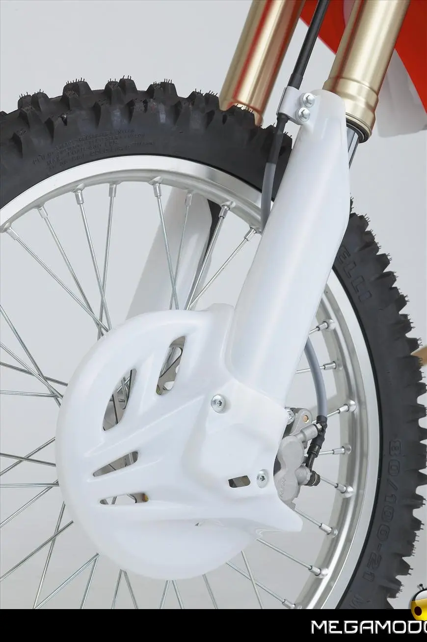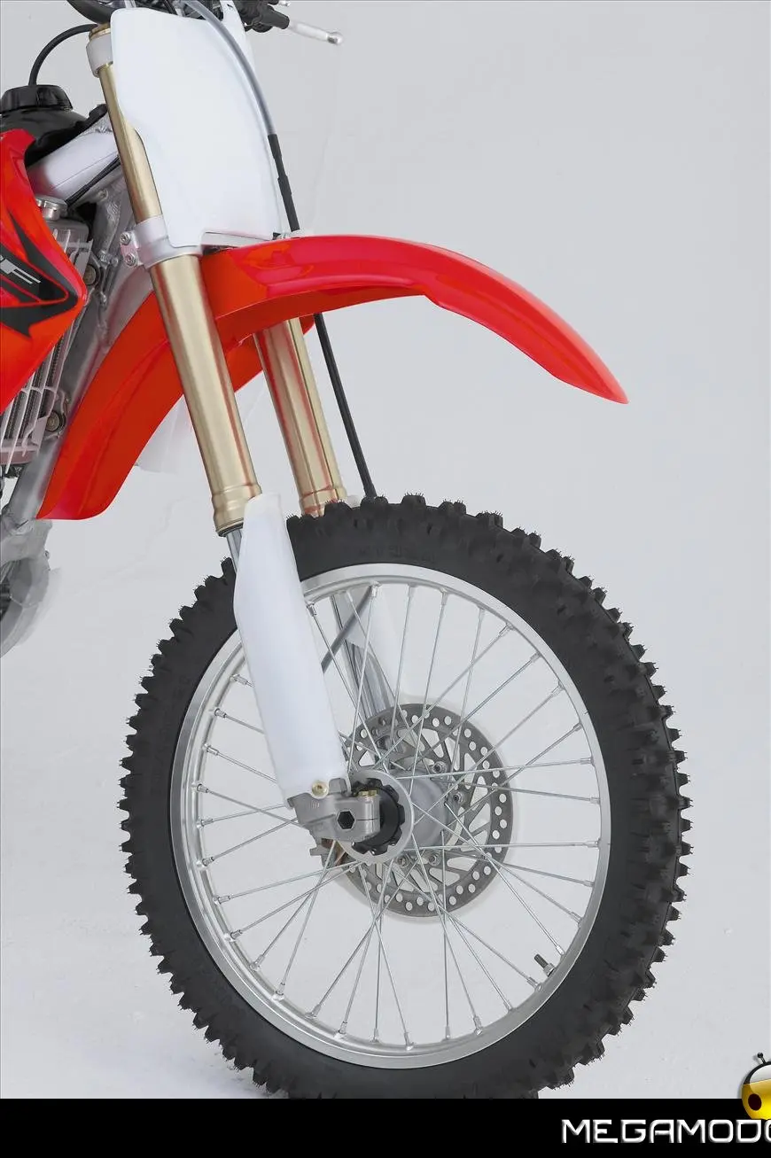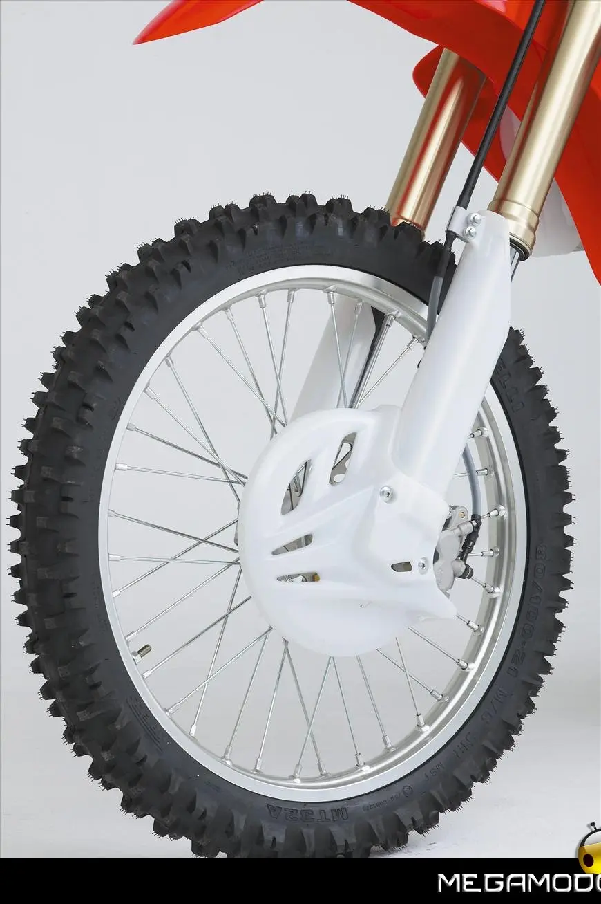 Telaio/Sospensioni - Nuovo telaio di IV generazione a doppia trave in alluminio, con piastra di sterzo in alluminio forgiato e sezione rastremata del tubo discendente, per una ottimizzata rigidezza del telaio. Le (alte) piastre del perno del forcellone e le sottili travi del telaio formano una sezione incrociata che migliora il comfort del pilota e la maneggevolezza complessiva. - Forcellone a due bracci rastremati, con ampia struttura incrociata in alluminio pressofuso. - Cerchio anteriore e posteriore con raggi in alluminio derivati dalle competizioni (HRC), per ridurre le masse alternate. - L’asse posteriore (diametro 25 mm), con cuscinetti di grande diametro, assicura rigidità e robustezza ottimali sui tracciati tortuosi. - Forcella rovesciata Showa con doppia camera da 47 mm, cartuccia interna con trattamento Kashima e nuovo settaggio. Escursione da 315 mm, regolabile nel ritorno (16 posizioni) e nella compressione. - Sospensione posteriore Pro-Link con monoammortizzatore Showa interamente regolabile; nuovo assetto, escursione da 314 mm, regolazione della compressione separata per le basse velocità (13 posizioni) e le alte velocità (3,5 giri), regolazione del ritorno in 17 posizioni. - Pistone dell'ammortizzatore posteriore da 50 mm di diametro, per prestazioni sempre ottimali anche nelle condizioni più difficili. - Pompa del freno anteriore “link type” con disco alleggerito, per una grande efficacia dell’impianto. - Pinza del freno anteriore con due pistoncini in alluminio anodizzato. Il disco anteriore alleggerito riduce le masse alternate, migliorando la maneggevolezza del mezzo. - Freno posteriore derivato dalle competizioni (HRC); integra la pompa secondaria ed il serbatoio del fluido, eliminando il classico serbatoio esterno ed il manicotto. - Freno a disco anteriore e posteriore da 240mm - Piastra forcella con offset di 22 mm, per facilitare l’ingresso e la percorrenza in curva. - L’assetto del “mono” posteriore è stato adeguato alle modifiche effettuate sulla forcella.