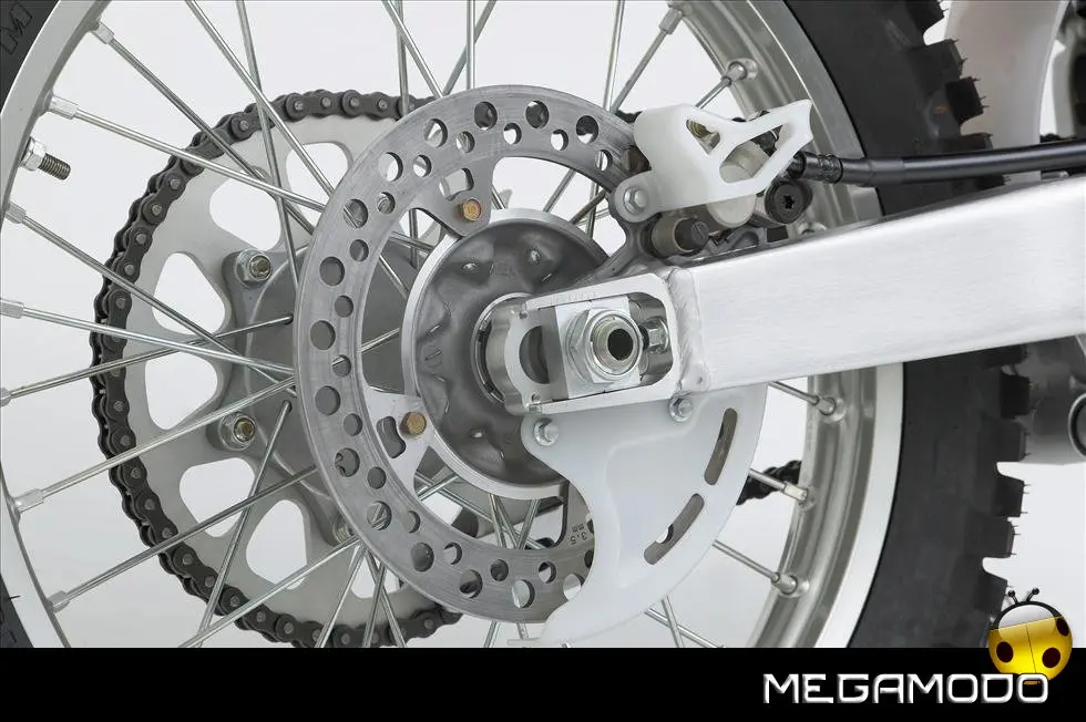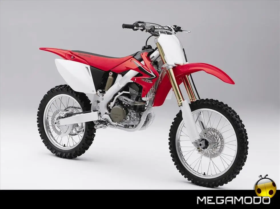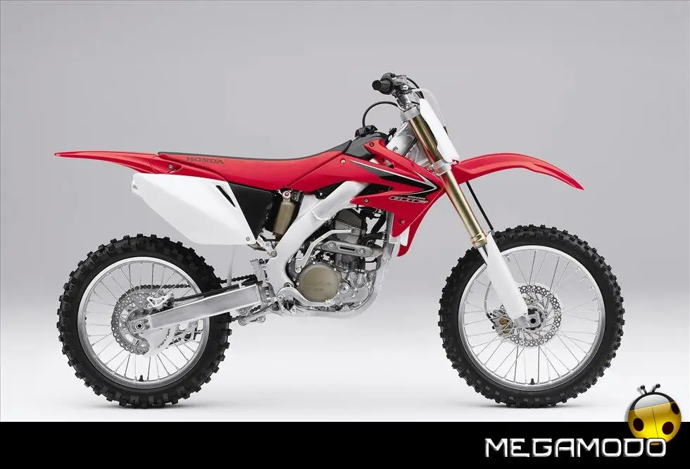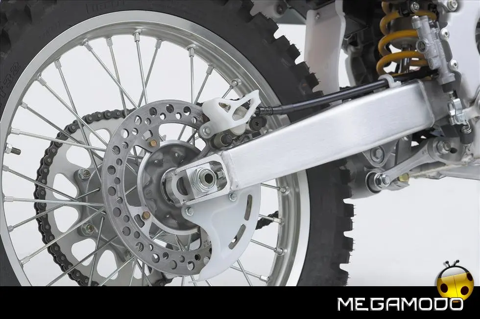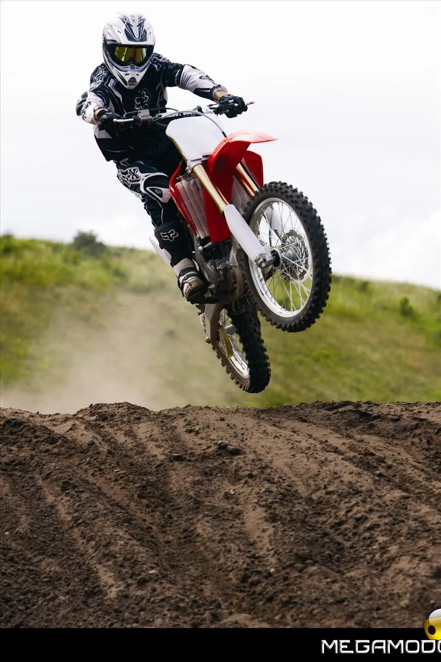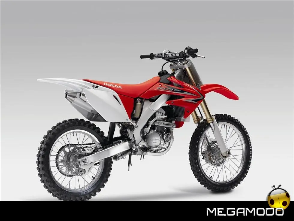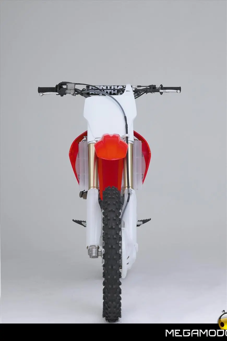 Telaio/Sospensioni - Nuovo telaio di IV generazione a doppia trave in alluminio, con piastra di sterzo in alluminio forgiato e sezione rastremata del tubo discendente, per una ottimizzata rigidezza del telaio. Le (alte) piastre del perno del forcellone e le sottili travi del telaio formano una sezione incrociata che migliora il comfort del pilota e la maneggevolezza complessiva. - Forcellone a due bracci rastremati, con ampia struttura incrociata in alluminio pressofuso. - Cerchio anteriore e posteriore con raggi in alluminio derivati dalle competizioni (HRC), per ridurre le masse alternate. - L’asse posteriore (diametro 25 mm), con cuscinetti di grande diametro, assicura rigidità e robustezza ottimali sui tracciati tortuosi. - Forcella rovesciata Showa con doppia camera da 47 mm, cartuccia interna con trattamento Kashima e nuovo settaggio. Escursione da 315 mm, regolabile nel ritorno (16 posizioni) e nella compressione. - Sospensione posteriore Pro-Link con monoammortizzatore Showa interamente regolabile; nuovo assetto, escursione da 314 mm, regolazione della compressione separata per le basse velocità (13 posizioni) e le alte velocità (3,5 giri), regolazione del ritorno in 17 posizioni. - Pistone dell'ammortizzatore posteriore da 50 mm di diametro, per prestazioni sempre ottimali anche nelle condizioni più difficili. - Pompa del freno anteriore “link type” con disco alleggerito, per una grande efficacia dell’impianto. - Pinza del freno anteriore con due pistoncini in alluminio anodizzato. Il disco anteriore alleggerito riduce le masse alternate, migliorando la maneggevolezza del mezzo. - Freno posteriore derivato dalle competizioni (HRC); integra la pompa secondaria ed il serbatoio del fluido, eliminando il classico serbatoio esterno ed il manicotto. - Freno a disco anteriore e posteriore da 240mm - Piastra forcella con offset di 22 mm, per facilitare l’ingresso e la percorrenza in curva. - L’assetto del “mono” posteriore è stato adeguato alle modifiche effettuate sulla forcella.