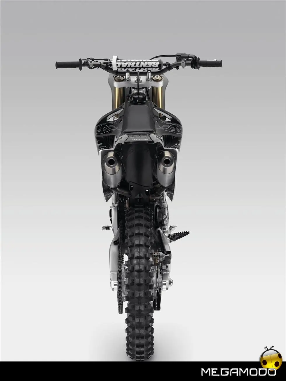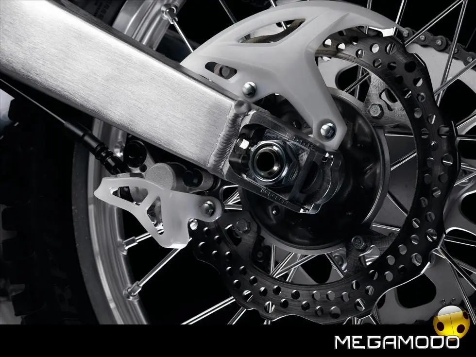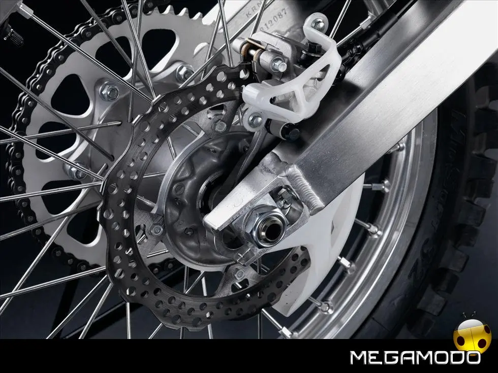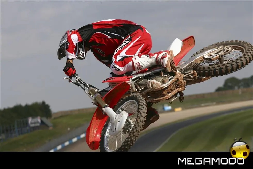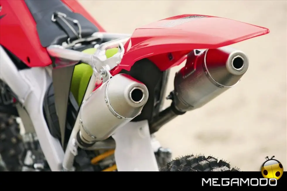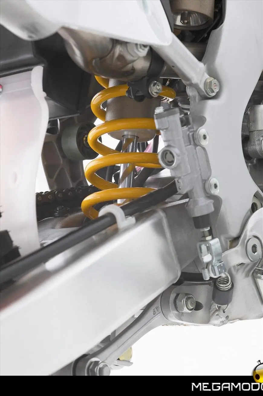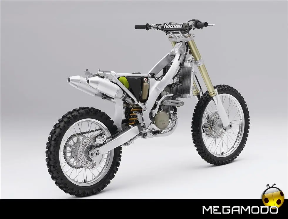 Telaio/Sospensioni - Nuovo telaio di IV generazione a doppia trave in alluminio, con piastra di sterzo in alluminio forgiato e sezione rastremata del tubo discendente, per una ottimizzata rigidezza del telaio. Le (alte) piastre del perno del forcellone e le sottili travi del telaio formano una sezione incrociata che migliora il comfort del pilota e la maneggevolezza complessiva. - Forcellone a due bracci rastremati, con ampia struttura incrociata in alluminio pressofuso. - Cerchio anteriore e posteriore con raggi in alluminio derivati dalle competizioni (HRC), per ridurre le masse alternate. - L’asse posteriore (diametro 25 mm), con cuscinetti di grande diametro, assicura rigidità e robustezza ottimali sui tracciati tortuosi. - Forcella rovesciata Showa con doppia camera da 47 mm, cartuccia interna con trattamento Kashima e nuovo settaggio. Escursione da 315 mm, regolabile nel ritorno (16 posizioni) e nella compressione. - Sospensione posteriore Pro-Link con monoammortizzatore Showa interamente regolabile; nuovo assetto, escursione da 314 mm, regolazione della compressione separata per le basse velocità (13 posizioni) e le alte velocità (3,5 giri), regolazione del ritorno in 17 posizioni. - Pistone dell'ammortizzatore posteriore da 50 mm di diametro, per prestazioni sempre ottimali anche nelle condizioni più difficili. - Pompa del freno anteriore “link type” con disco alleggerito, per una grande efficacia dell’impianto. - Pinza del freno anteriore con due pistoncini in alluminio anodizzato. Il disco anteriore alleggerito riduce le masse alternate, migliorando la maneggevolezza del mezzo. - Freno posteriore derivato dalle competizioni (HRC); integra la pompa secondaria ed il serbatoio del fluido, eliminando il classico serbatoio esterno ed il manicotto. - Freno a disco anteriore e posteriore da 240mm - Piastra forcella con offset di 22 mm, per facilitare l’ingresso e la percorrenza in curva. - L’assetto del “mono” posteriore è stato adeguato alle modifiche effettuate sulla forcella.