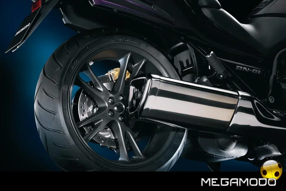 Anche la parte inferiore della moto è stata rielaborata con uno stile elegante, fatto di calotte anteriori che circondano il radiatore e si allungano in basso fino ad incorporare davanti le pedane e dietro l'accattivante scarico laterale destro due-in-uno. Il voluminoso terminale cromato presenta una moderna sezione triangolare che si fonde elegantemente nel complesso organico del veicolo. Lungo il lato sinistro, un impressionante forcellone monobraccio Pro-Arm si unisce alle eleganti ruote a 5 razze in alluminio pressofuso ad enfatizzare fortemente l'intrinseca bellezza funzionale del mezzo. Infine, scevro da grafiche distraenti, ciascun lato dell'elegante serbatoio della DN-01 è decorato da un singolo, elegantissimo marchio Honda, che funge da forte promemoria visivo della capacità dell’azienda di superare i limiti del tradizionale design motociclistico, esprimendo nel contempo in modo sottile la qualità, le rifiniture e il prestigio che si trovano nella nuova DN-01. Non per nulla questo marchio è lo stesso presente sulla RC212V…