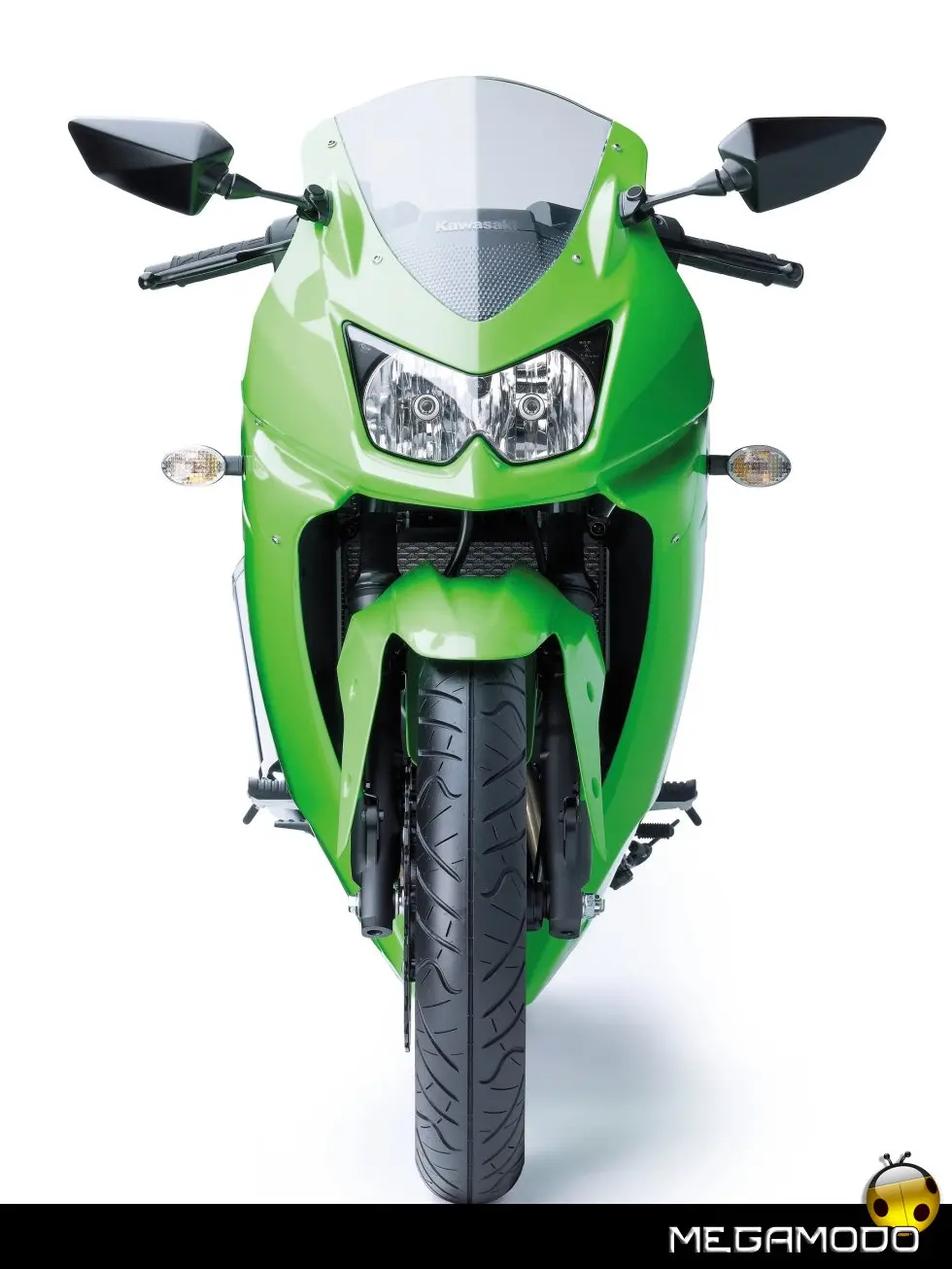 Scocca: - La scocca voluminosa conferisce alla 250R l’aspetto di una moto di cilindrata superiore. - Le linee audaci alludono al carattere sportivo di questo modello. - La carena anteriore e il parabrezza offrono al pilota una notevole protezione dal vento. - Il design aggressivo del fanale a due lampade rafforza l’aspetto unico della Ninja 250R. - Gli indicatori di direzione dal vetro chiaro comunicano l’alta qualità dei materiali usati in questa moto. - La carena con coda di dimensioni ridotte e le selle separate ne evidenziano ulteriormente l’aspetto supersportivo. - La copertura per sella singola opzionale può sostituire la sella doppia per un aspetto ancora più aggressivo. - Il taglio e la finitura sono equivalenti a quelli dei modelli Ninja supersport di prima categoria.
