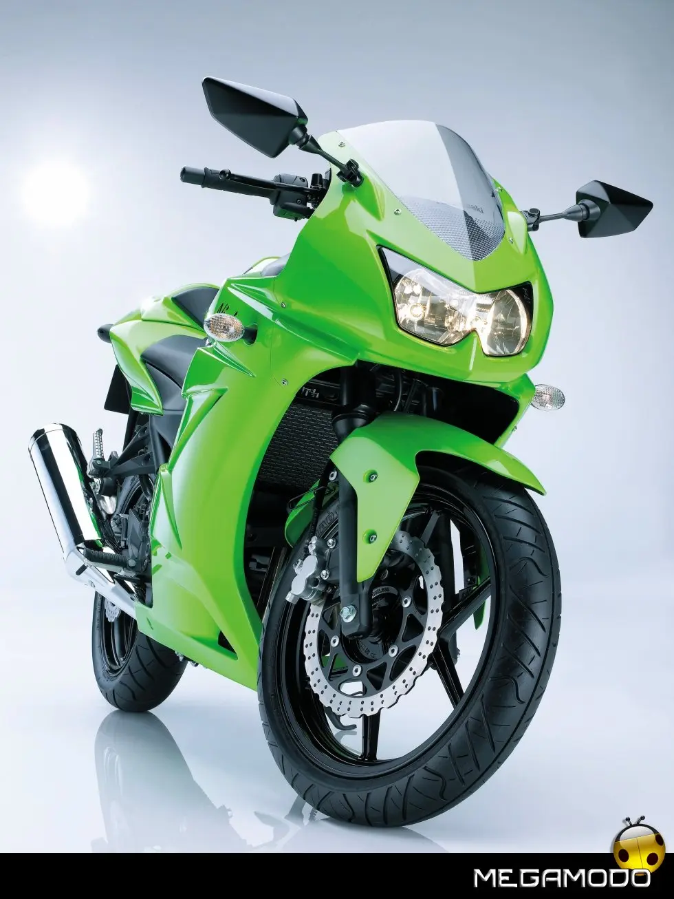 Impianto di scarico: - L’impianto di scarico 2 in 1 potenzia la coppia a regimi medio-bassi e consente alla Ninja 250R di raggiungere una curva di potenza fluida e lineare. - Il silenziatore leggermente rialzato è stato sottoposto a test intensivi per determinare i rapporti di divisione della camera e la lunghezza e il diametro del tubo di collegamento: il risultato è una notevole riduzione del rumore con una minima perdita di potenza. - I due catalizzatori, uno nel tubo del collettore e uno nel silenziatore, assicurano il rispetto delle severe normative in materia di emissioni. Il posizionamento del primo catalizzatore il più vicino possibile alle prese di scarico ne ottimizza l’efficienza, usarne due consente invece di ridurre al minimo la perdita di potenza (i modelli carburati montano catalizzatori a tubo; i modelli a iniezione di carburante utilizzano catalizzatori a nido d’ape).