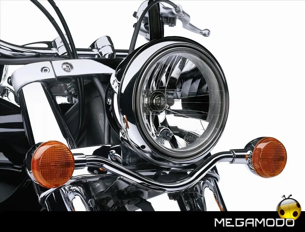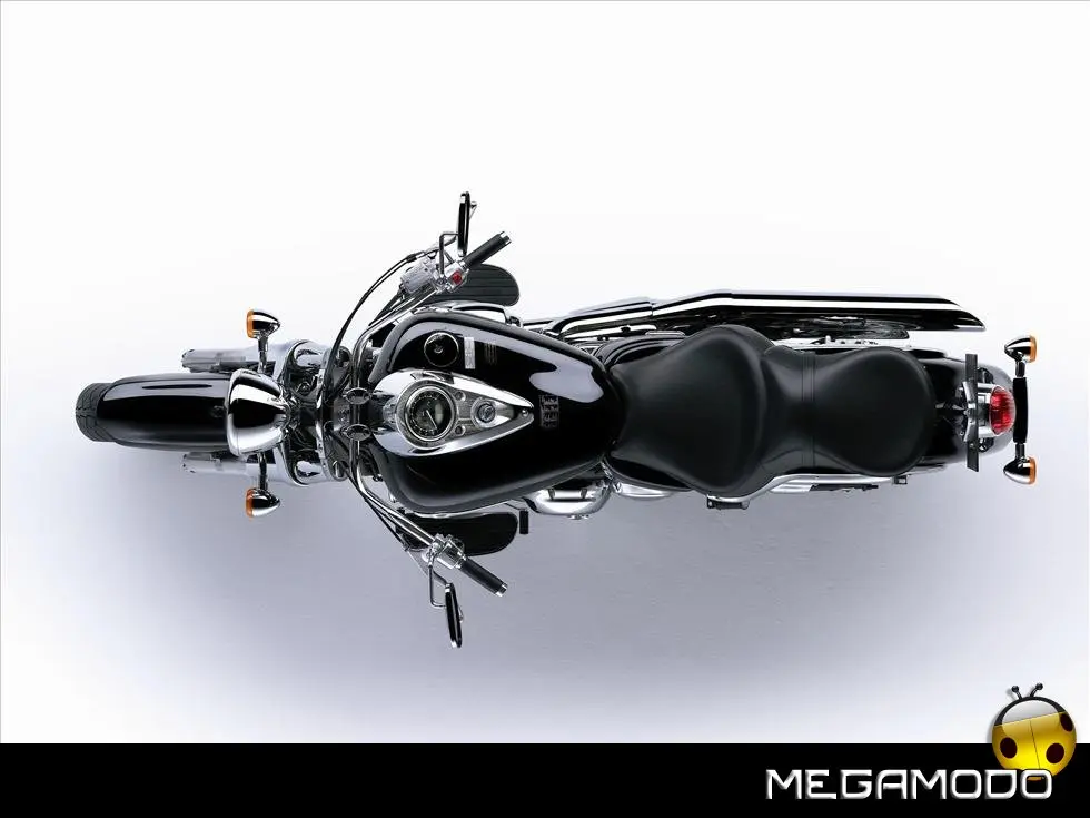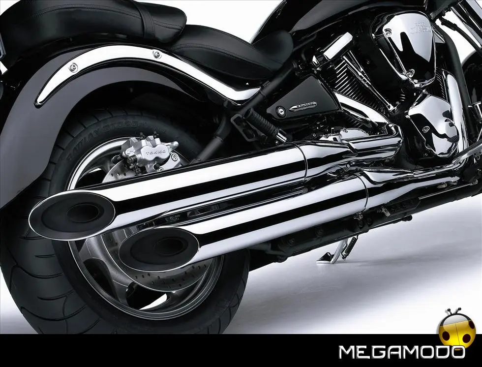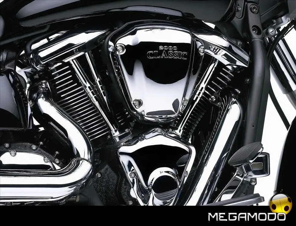 Motore * Per seguire il design d’insieme, anche il motore è lungo e basso. * Il rivestimento nero e ruvido del carter si contrappone armoniosamente ai diversi coperchi cromati del motore. * Un ulteriore tocco di classe è rappresentato dai simboli applicati sul coperchio dell’airbox sul lato destro. * La doppia marmitta di taglio obliquo è collegata a due tubi di bilanciamento che assicurano un’efficienza eccezionale e un suono fantastico. La finitura della cromatura di alta qualità è straordinaria.
