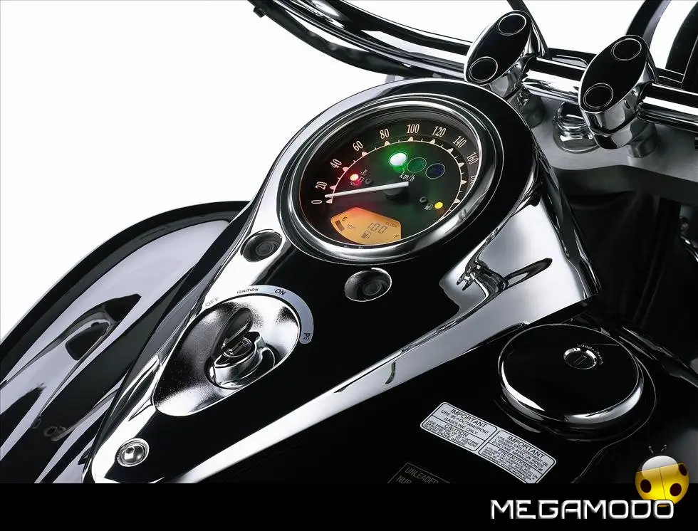 Serbatoio Carburante * Grande, disteso e senza giunture, il voluttuoso serbatoio del carburante ha linee e finitura piacevoli alla vista e al tatto. * Capacità di ben 21 litri per percorrere lunghe distanze senza preoccupazioni. * La consolle strumenti comandata da motore passo-passo, dalla linea agile e leggera, evidenzia l’eleganza della moto. * Sul raffinato sfondo nero del grande quadrante del tachimetro sono presenti le spie e un display LCD di facile lettura con indicatore carburante. * È possibile rimuovere la chiave dall’interruttore di accensione in posizione "on" per non danneggiare la cromatura della consolle strumenti o la lucentezza del serbatoio con il portachiavi, quando la moto è in funzione. La rotazione del collare dell’interruttore di accensione su "off" o in posizione "parcheggio" (accendendo il fanale posteriore) fa spegnere il motore. Per riavviare, reinserire la chiave.