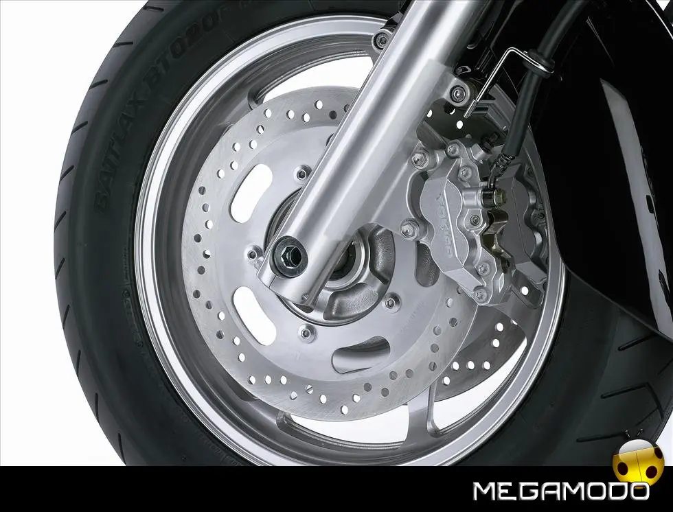 Freni, Ruote e Pneumatici * I dischi doppi da 300 mm del freno anteriore sono azionati da pinze a 4 pistoncini per una frenata potente. * La ruota posteriore è rallentata da un disco da 320 mm dall’ampio diametro, azionato da una pinza a doppio pistoncino. * I pneumatici radiali contribuiscono alla stabile maneggevolezza.