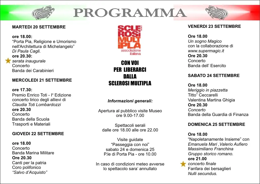 E’ una manifestazione della durata di sei giorni che ha lo scopo di narrare al pubblico, attraverso la musica, le voci, le immagini e i canti un’epoca vissuta all’unisono con il tricolore, simbolo dell’identità nazionale. Inoltre, per dare segni tangibili di solidarietà nel presente, sarà data evidenza nel corso dei vari spettacoli all’attività nella lotta contro la sclerosi multipla condotta dall’AISM. L’evento è organizzato dall’Associazione Nazionale Bersaglieri, Sezione di Roma, in collaborazione con il Museo Storico dei Bersaglieri. Nelle passate edizioni si sono registrate presenze per oltre diecimila persone. Per l’intera durata della rassegna il Museo sarà aperto al pubblico dalle 09.00 alle 22.00. Nei locali museali sarà possibile ammirare fotografie, uniformi, cimeli, stampe, documenti di elevato valore storico utili ad approfondire sia la conoscenza della specialità dei bersaglieri sia alcuni particolari dell’episodio risorgimentale che ebbe luogo il 20 settembre 1870, nel tratto delle mura aureliane adiacente a Porta Pia, che sancì l’ annessione di Roma al Regno d’Italia.