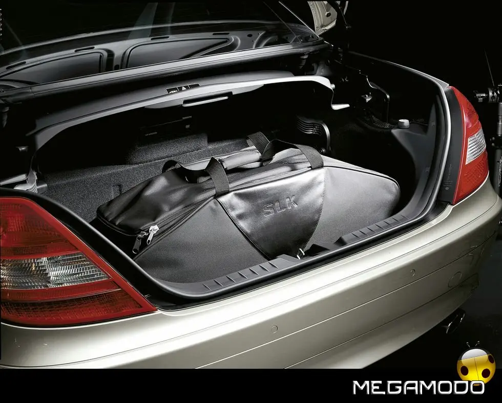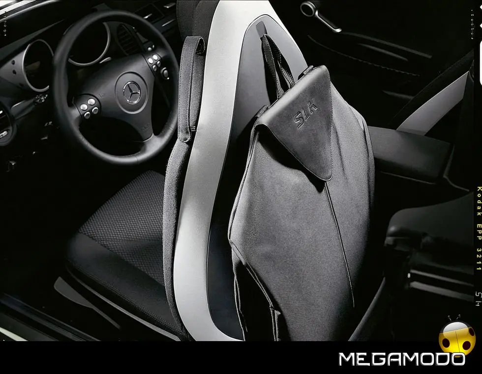 Idee su misura per il viaggio Accessori su misura enfatizzano la capacità di carico del Roadster con la Stella. Il porta-abito SLK, ad esempio, è realizzato in nylon balistico, con una robusta aletta in cuoio ed una cinghia magnetica, che consente di fissarlo allo schienale dei sedili ed appendere fino a tre capi, risparmiando spazio ed impedendo agli abiti di sciuparsi durante il viaggio. La borsa per il bagagliaio SLK, con le sue comode rotelle, è realizzata in nylon balistico, un materiale, impermeabile e particolarmente resistente a eventuali strappi.