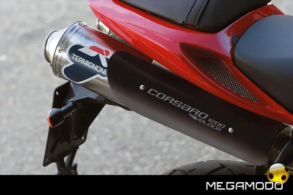Il posteriore è caratterizzato da un forcellone asimmetrico che nasconde un monoammortizzatore Ohlins con serbatoio separato pluriregolabile in lunghezza, precarico, estensione e compressione. In frenata la Corsaro 1200 Veloce non delude le aspettative: gli impianti Brembo Serie Oro garantiscono decelerazioni potenti e progressive regalando al pilota tutta la sensibilità necessaria per gestire al meglio questa difficile fase della guida. All’anteriore coppia di dischi da 320mm con pompa radiale e pinze a quattro pistoncini: una soluzione che risponde ad un preciso input tecnico, quello di offrire sicurezza grazie ad una modulabilità da riferimento ed una grande potenza. L’impianto frenante posteriore prevede un disco da 220 mm e pinza a due pistoncini. L’impianto di scarico si distingue per i due silenziatori Termignoni in puro stile racing, sottili e leggeri, che regalano un sound di tonalità potente, rispettando le normative per l’omologazione Euro 3.