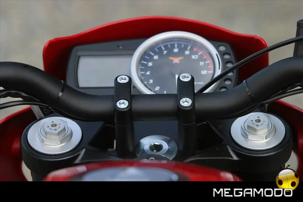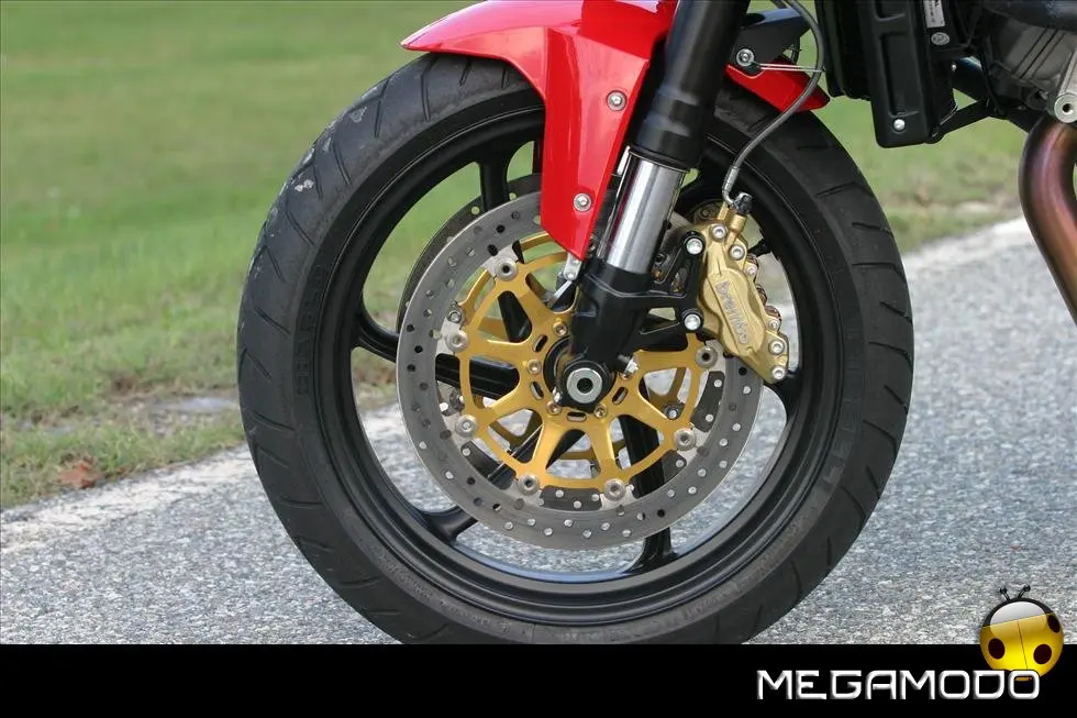 Il lavoro del telaio è coadiuvato da sospensioni di altissimo livello e ancora più sofisticate in questa versione sportiva. All’anteriore una possente forcella Marzocchi Magnum con steli da 50 mm di diametro, con possibilità di personalizzazione della taratura in modo molto preciso sia in compressione che in estensione, grazie alla doppia regolazione: al registro sul tappo per lo smorzamento idraulico del ritorno, si aggiunge un registro per lo smorzamento idraulico della compressione posto sul piedino della forcella. L’inserimento del raschiatore sulle boccole migliora la tenuta della cartuccia, l’asta interna in ergal con anodizzazione dura rende più efficace lo scorrimento ed assicura una maggiore resistenza all’usura. La contromolla più lunga consente inoltre di aumentare il feeling nelle uscite di curva in forte accelerazione, garantendo una maggiore stabilità dell'avantreno. Nel complesso la solidità visiva rispecchia un comportamento sempre solido e coerente, pronto a copiare le più piccole asperità della strada come a sorreggere la spinta della decelerazione nelle staccate più estreme.
