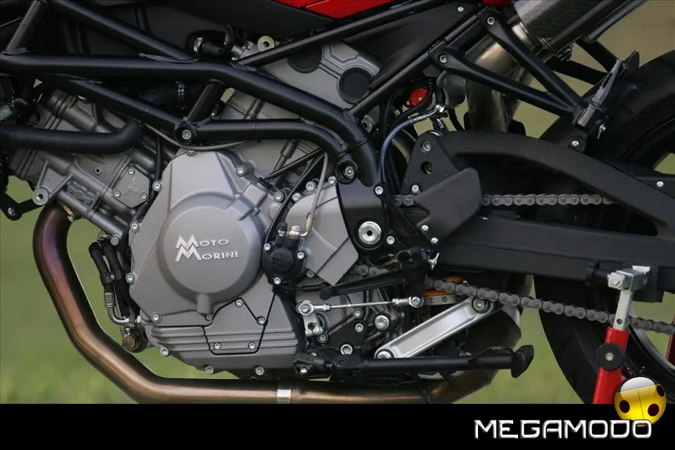Motore: Moto Morini – Bialbero CorsaCorta Cilindri: 2 Disposizione: V 87° longitudinale Tempi: 4 Raffreddamento: liquido Distribuzione: doppio albero, camme in testa Valvole per cilindro: 4 Alesaggio x corsa: 107 x 66 mm Cilindrata: 1187 cc Rapporto di compressione: 11,8 ± 0.3 Potenza: 103 Kw – 140 cv @ 8500 giri/min Coppia: 123 Nm – 12,5 Kgm @ 6500 giri/min Alimentazione: iniezione elettronica indiretta Magneti Marelli con corpo farfallato da 54 mm Ø Accensione: elettronica del tipo I.A.W. Avviamento: elettrico Lubrificazione: forzata con pompa trocoidale Cambio: ingranaggi a denti dritti sempre in presa Rapporti cambio: 6 In prima 13/36 In seconda 17/32 In terza 20/30 In quarta 22/28 In quinta 23/26 In sesta 24/25 Frizione: multidisco in bagno d’olio con dispositivo antisaltellamento e pompa radiale Trasmissione primaria: ingranaggi a denti dritti 55:31 Trasmissione finale: catena 17/40 Scarico: Termignoni Sport con doppio silenziatore e db killer, catalizzatore 3 vie con sonda lambda + centralina racing per uso in pista Emissioni inquinanti atmosferiche: Euro 3 Telaio: Verlicchi - traliccio di tubi in acciaio altoresistenziale Interasse: 1440 mm Inclinazione cannotto di sterzo: 24,5° Avancorsa: 103 mm Sospensione anteriore: Marzocchi upside down con steli da 50 mm Ø regolabile idraulicamente in estensione, compressione e precarico molla su ogni stelo. Asta in ergal, boccola flottante e contromolla in distensione. Escursione ruota anteriore: 129 mm Forcellone: fusione in lega di alluminio Sospensione posteriore: monoammortizzatore Ohlins con serbatoio separato pluriregolabile in lunghezza, pre-carico, estensione e compressione Escursione ruota posteriore: 130 mm Freno anteriore: Brembo - doppio disco da 320 mm con pinze a 4 pistoncini e pompa radiale Freno posteriore: Brembo (pompa e pinze) – mono disco da 220 mm con pinza a due pistoncini Pneumatico anteriore: Pirelli Diablo – 120/70 ZR 17 (58W) Pneumatico posteriore: Pirelli Diablo – 180/55 ZR 17 (73W) Cerchi: Brembo in lega leggera a 6 razze Dimensione cerchio anteriore: MT 3.50 x 17” Dimensione cerchio posteriore: MT 5.50 x 17” Supporto pedane pilota: in Ergal ricavate dal pieno con rapporto leva cambio corto e posizione pedane arretrate Lunghezza totale: 2070 mm Larghezza massima: 810 mm (esclusi specchi retrovisori) Altezza sella: 830 mm Altezza minima da terra: 140 mm Angolo di sterzo: 30° dx/sx * Peso in ordine di marcia senza carburante 196 Kg * Moto Morini indica il peso della moto completa di batteria, liquido refrigerante, olio motore e assenza di carburante Capacità serbatoio: 18 litri Capacità riserva: 4 litri Strumentazione: cruscotto Contagiri elettronico/analogico e tachimetro con display LCD multifunzione Colori: Rossa/Telaio nero – Nera/Telaio nero – Bianca/ Telaio nero Garanzia: 3 anni
