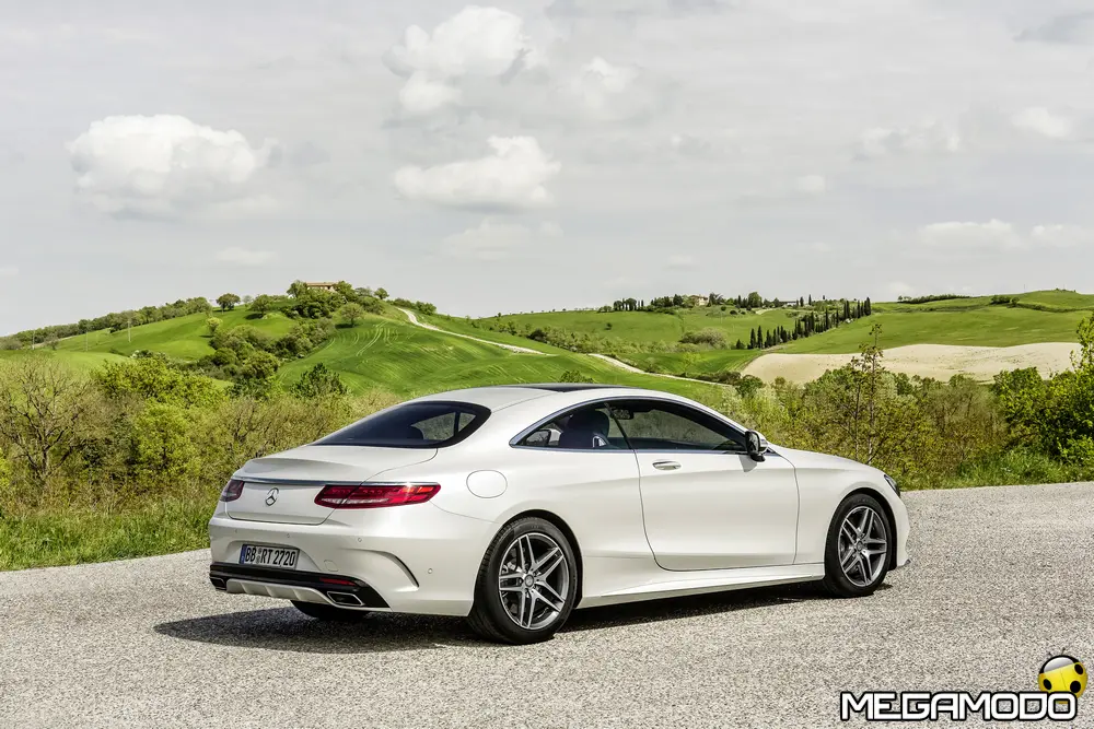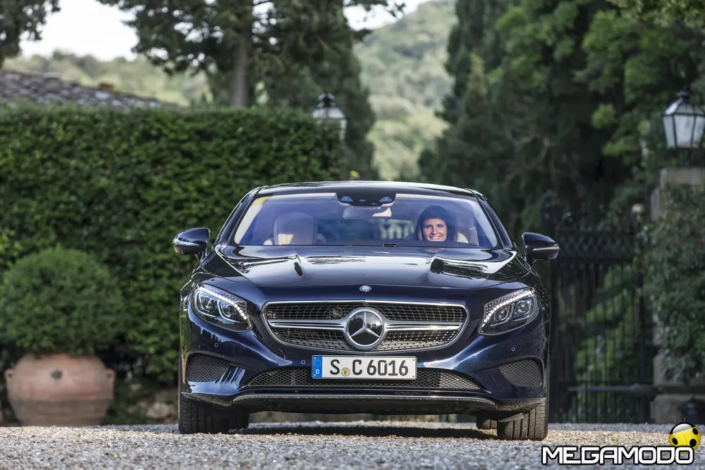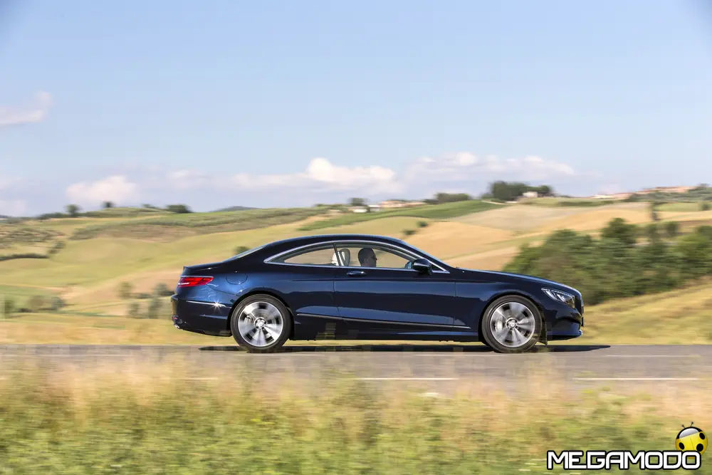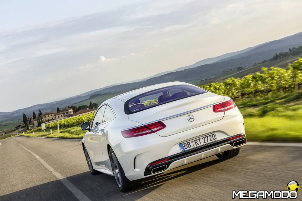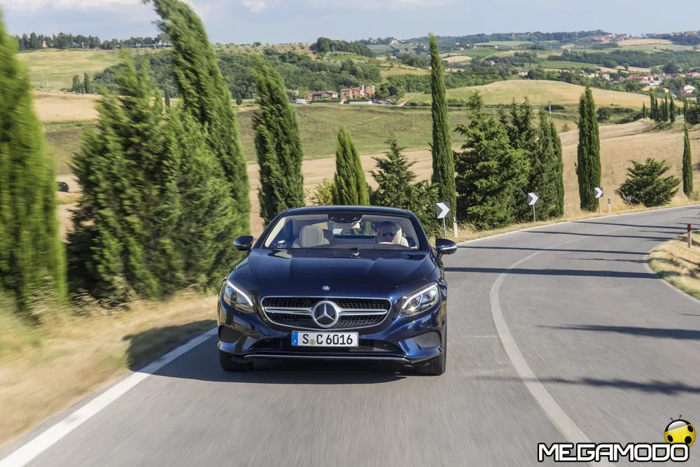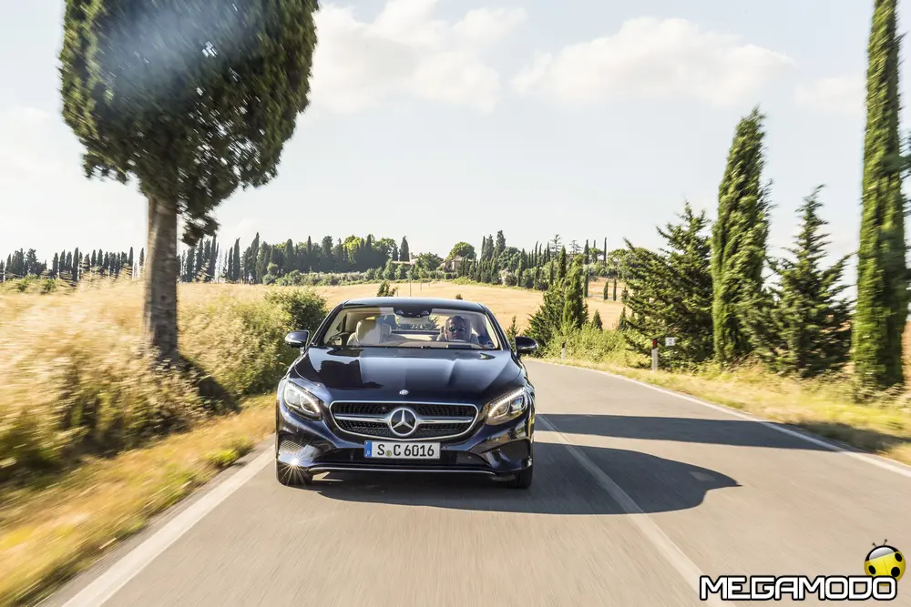 La plancia della Classe S Coupé entusiasma per la sua spettacolare architettura e pone un nuovo parametro di riferimento nel segmento superiore dei coupé. Si articola in un'area superiore ben definita, con un ampio movimento avvolgente che confluisce nelle porte e un corpo inferiore molto ribassato dalle forme flottanti. Questa particolare architettura è resa possibile da una disposizione completamente nuova dell'airbag posto in basso, che consente inoltre di mettere in primo piano, davanti a queste modanature, l'ampio display TFT in due parti nel formato widescreen. Il tutto è sottolineato con stile da luci soffuse. L'alta consolle centrale dall'aspetto sportivo affonda verso il basso, estendendosi fino al vano posteriore. Tutti gli sportelli e gli appoggi presentano un raffinato rivestimento in pelle. Come a bordo di un jet il display head-up, disponibile a richiesta, visualizza le principali informazioni sul parabrezza direttamente nel campo visivo del guidatore, riducendo i motivi di distrazione rispetto a quanto avviene sulla strada. Il sistema fornisce informazioni sulla velocità della vettura e sui limiti di velocità, nonché istruzioni di navigazione e indicazioni fornite dai sistemi di assistenza alla guida. A livello tecnico il dispositivo si basa su un'ottica speculare e su un modulo display a colori con risoluzione di 480 x 240 pixel, che funziona con LED ad alta potenza. Alla guida, tutto questo viene tradotto in sensazioni incredibili, come quelle che la Stella da sempre sa regalare. La Classe S si fa guidare con strema facilità, il volante regala leggerezza e precisione. Il Cambio automatico 7G-Tronic Plus e le sospensioni regalano una guida assolutamente rilassata e, neanche a dirlo, piacevolissima. Con il MAGIC BODY CONTROL, presente a bordo della Classe S, debuttava a livello internazionale il primo assetto in grado di vedere. Ora invece il Coupé presenta un’altra novità mondiale per le auto di serie: la funzione di inclinazione in curva, grazie alla quale la vettura si inclina in curva come se fosse un motociclista o uno sciatore. L'accelerazione trasversale che agisce sulle persone a bordo della vettura viene ridotta come per la guida in una curva ripida e gli occupanti restano più saldi sui sedili. La nuova funzione di inclinazione in curva offre maggior comfort e piacere di guida soprattutto sulle strade extraurbane. Essa mira a ottenere non solo velocità in curva superiori, ma anche un’esperienza di guida piacevole. Parlando di numeri sotto il cofano, non si può che parlare di "artiglieria pesante". Il V8 da 4.663 cm3 della vettura provata, reagisce con una grinta fuori dal comune; grazie al biturbo, e ai suoi 455 CV con 700 Nm di coppia massima la Classe S, se spremuta, reagisce letteralmente come una belva pronta ad attaccare, facendo passare in secondo piano la stazza da circa 2 tonnellate.