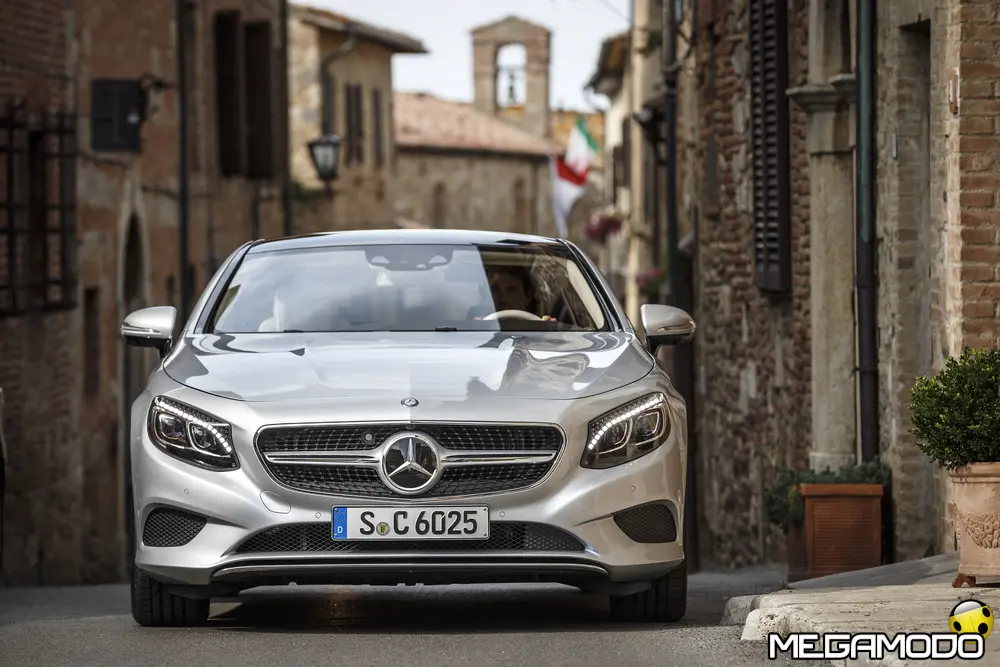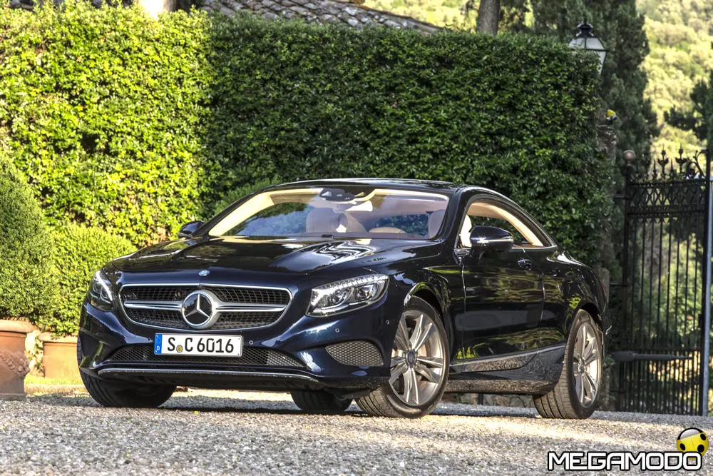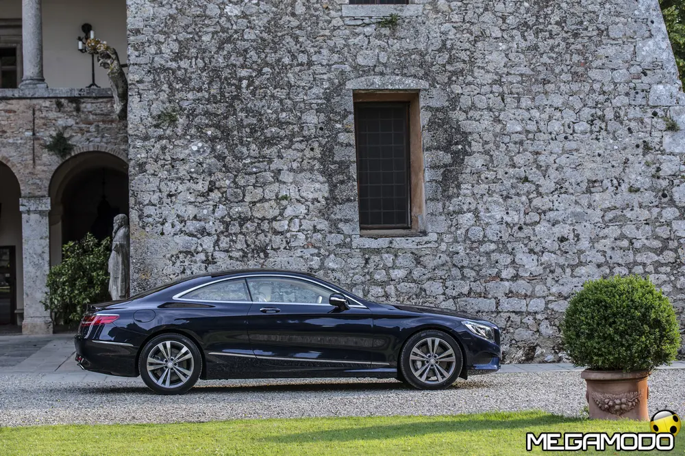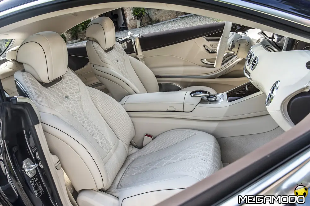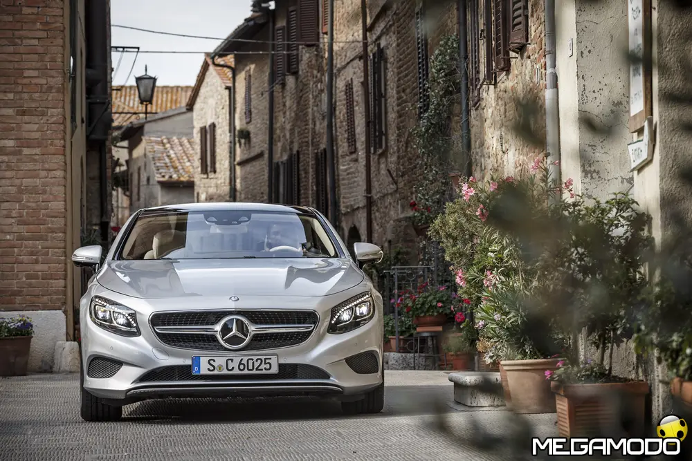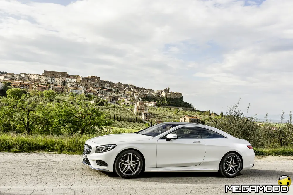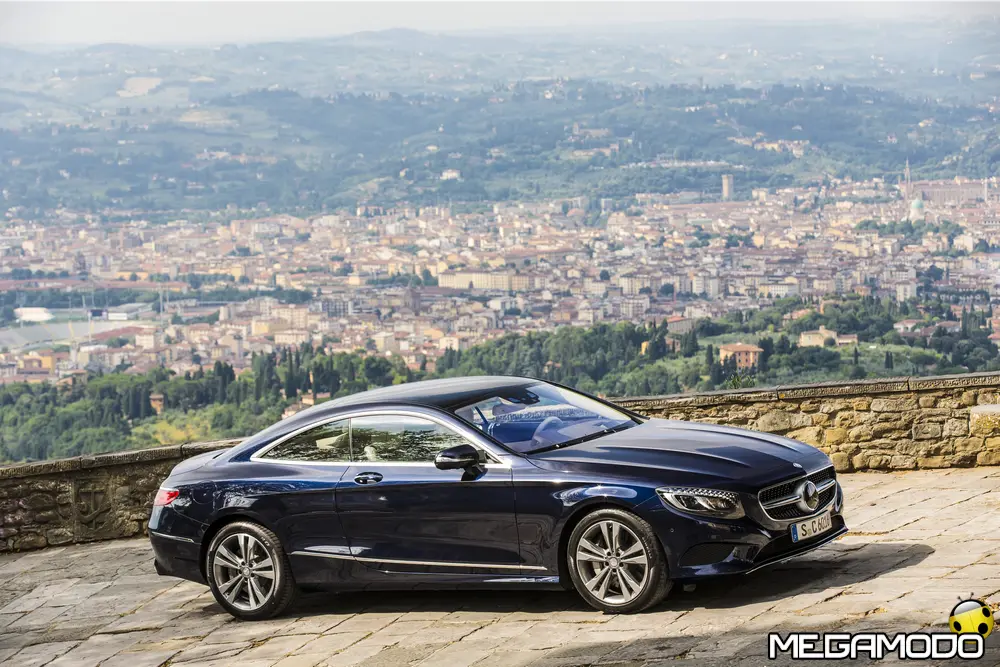 La plancia della Classe S Coupé entusiasma per la sua spettacolare architettura e pone un nuovo parametro di riferimento nel segmento superiore dei coupé. Si articola in un'area superiore ben definita, con un ampio movimento avvolgente che confluisce nelle porte e un corpo inferiore molto ribassato dalle forme flottanti. Questa particolare architettura è resa possibile da una disposizione completamente nuova dell'airbag posto in basso, che consente inoltre di mettere in primo piano, davanti a queste modanature, l'ampio display TFT in due parti nel formato widescreen. Il tutto è sottolineato con stile da luci soffuse. L'alta consolle centrale dall'aspetto sportivo affonda verso il basso, estendendosi fino al vano posteriore. Tutti gli sportelli e gli appoggi presentano un raffinato rivestimento in pelle. Come a bordo di un jet il display head-up, disponibile a richiesta, visualizza le principali informazioni sul parabrezza direttamente nel campo visivo del guidatore, riducendo i motivi di distrazione rispetto a quanto avviene sulla strada. Il sistema fornisce informazioni sulla velocità della vettura e sui limiti di velocità, nonché istruzioni di navigazione e indicazioni fornite dai sistemi di assistenza alla guida. A livello tecnico il dispositivo si basa su un'ottica speculare e su un modulo display a colori con risoluzione di 480 x 240 pixel, che funziona con LED ad alta potenza. Alla guida, tutto questo viene tradotto in sensazioni incredibili, come quelle che la Stella da sempre sa regalare. La Classe S si fa guidare con strema facilità, il volante regala leggerezza e precisione. Il Cambio automatico 7G-Tronic Plus e le sospensioni regalano una guida assolutamente rilassata e, neanche a dirlo, piacevolissima. Con il MAGIC BODY CONTROL, presente a bordo della Classe S, debuttava a livello internazionale il primo assetto in grado di vedere. Ora invece il Coupé presenta un’altra novità mondiale per le auto di serie: la funzione di inclinazione in curva, grazie alla quale la vettura si inclina in curva come se fosse un motociclista o uno sciatore. L'accelerazione trasversale che agisce sulle persone a bordo della vettura viene ridotta come per la guida in una curva ripida e gli occupanti restano più saldi sui sedili. La nuova funzione di inclinazione in curva offre maggior comfort e piacere di guida soprattutto sulle strade extraurbane. Essa mira a ottenere non solo velocità in curva superiori, ma anche un’esperienza di guida piacevole. Parlando di numeri sotto il cofano, non si può che parlare di "artiglieria pesante". Il V8 da 4.663 cm3 della vettura provata, reagisce con una grinta fuori dal comune; grazie al biturbo, e ai suoi 455 CV con 700 Nm di coppia massima la Classe S, se spremuta, reagisce letteralmente come una belva pronta ad attaccare, facendo passare in secondo piano la stazza da circa 2 tonnellate.