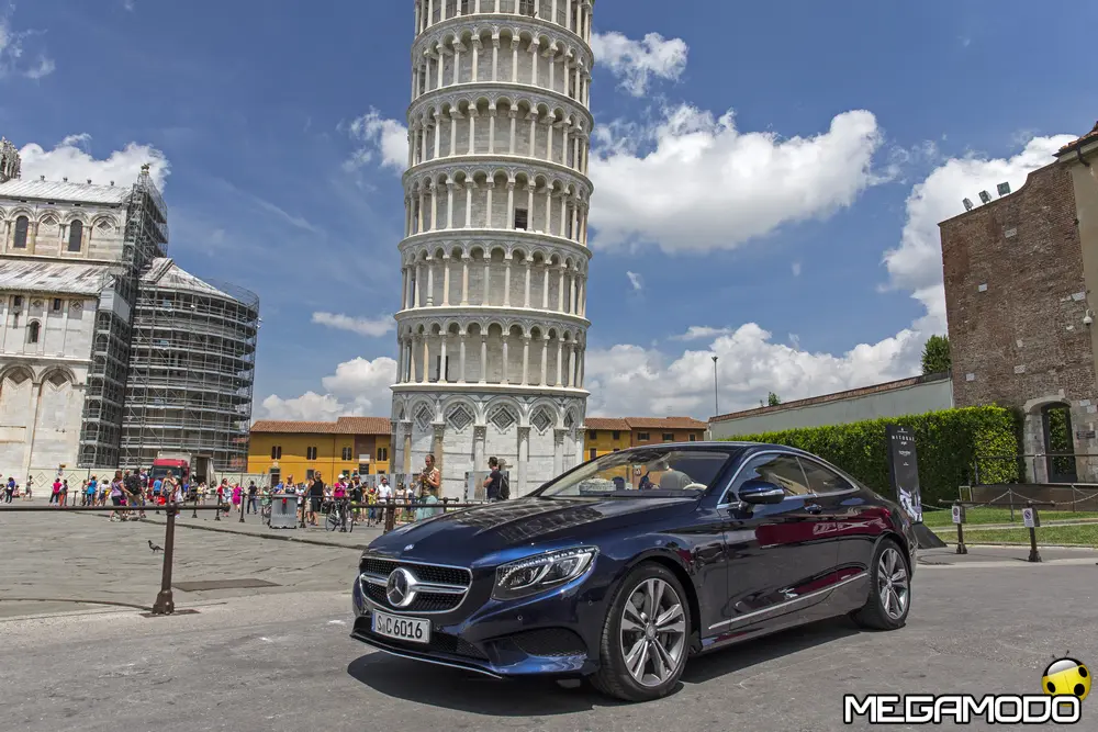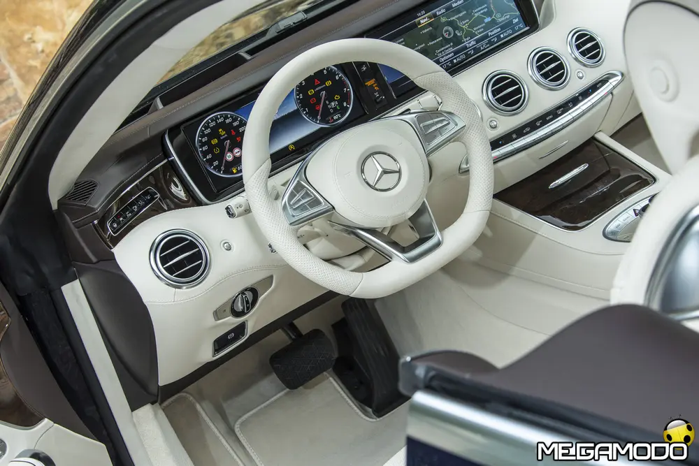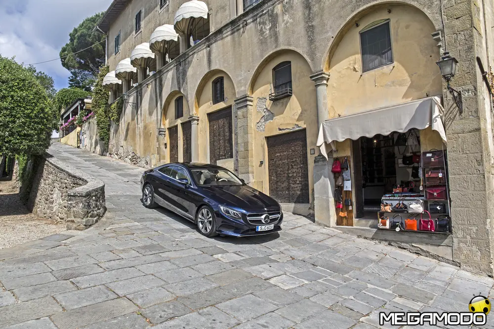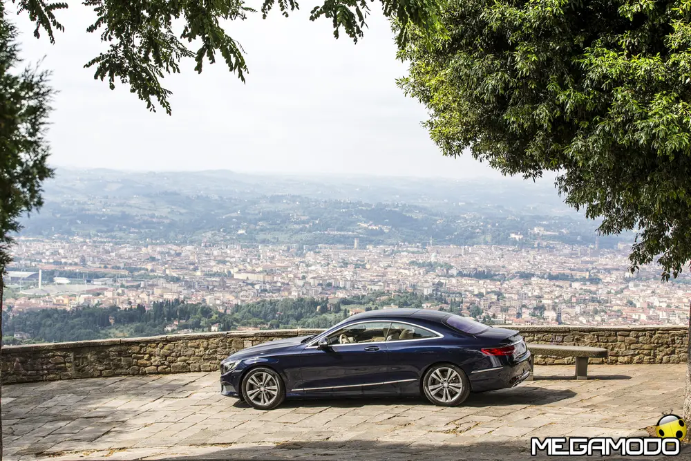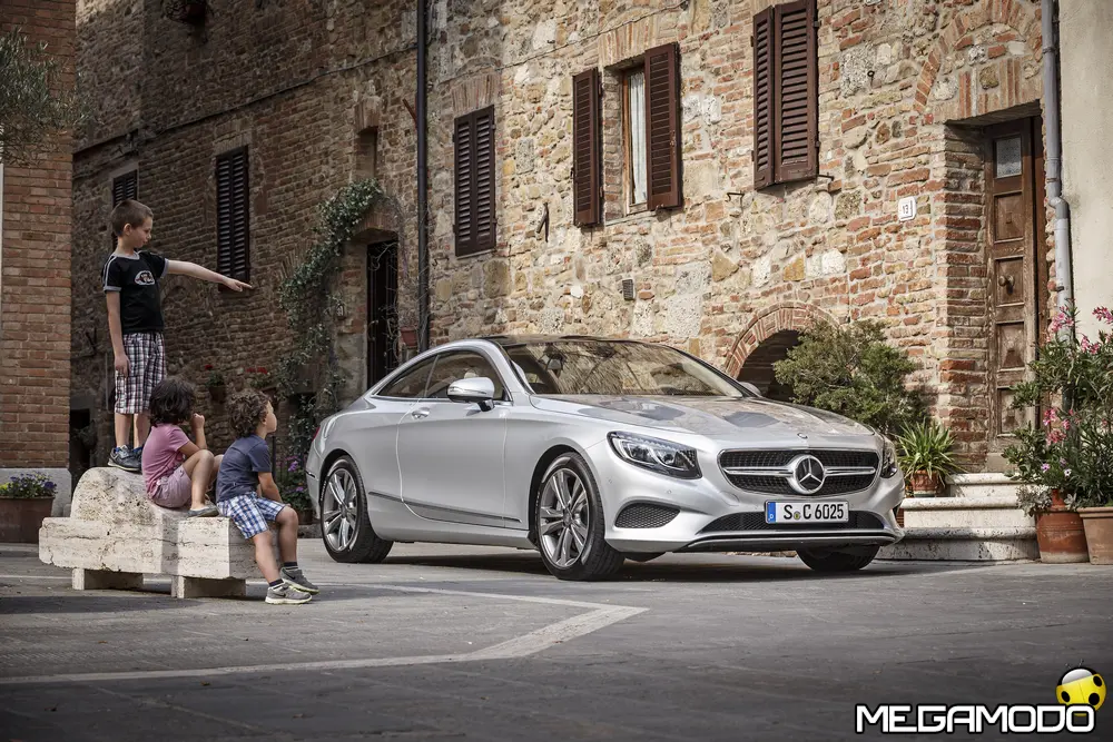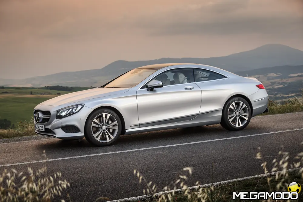 La plancia della Classe S Coupé entusiasma per la sua spettacolare architettura e pone un nuovo parametro di riferimento nel segmento superiore dei coupé. Si articola in un'area superiore ben definita, con un ampio movimento avvolgente che confluisce nelle porte e un corpo inferiore molto ribassato dalle forme flottanti. Questa particolare architettura è resa possibile da una disposizione completamente nuova dell'airbag posto in basso, che consente inoltre di mettere in primo piano, davanti a queste modanature, l'ampio display TFT in due parti nel formato widescreen. Il tutto è sottolineato con stile da luci soffuse. L'alta consolle centrale dall'aspetto sportivo affonda verso il basso, estendendosi fino al vano posteriore. Tutti gli sportelli e gli appoggi presentano un raffinato rivestimento in pelle. Come a bordo di un jet il display head-up, disponibile a richiesta, visualizza le principali informazioni sul parabrezza direttamente nel campo visivo del guidatore, riducendo i motivi di distrazione rispetto a quanto avviene sulla strada. Il sistema fornisce informazioni sulla velocità della vettura e sui limiti di velocità, nonché istruzioni di navigazione e indicazioni fornite dai sistemi di assistenza alla guida. A livello tecnico il dispositivo si basa su un'ottica speculare e su un modulo display a colori con risoluzione di 480 x 240 pixel, che funziona con LED ad alta potenza. Alla guida, tutto questo viene tradotto in sensazioni incredibili, come quelle che la Stella da sempre sa regalare. La Classe S si fa guidare con strema facilità, il volante regala leggerezza e precisione. Il Cambio automatico 7G-Tronic Plus e le sospensioni regalano una guida assolutamente rilassata e, neanche a dirlo, piacevolissima. Con il MAGIC BODY CONTROL, presente a bordo della Classe S, debuttava a livello internazionale il primo assetto in grado di vedere. Ora invece il Coupé presenta un’altra novità mondiale per le auto di serie: la funzione di inclinazione in curva, grazie alla quale la vettura si inclina in curva come se fosse un motociclista o uno sciatore. L'accelerazione trasversale che agisce sulle persone a bordo della vettura viene ridotta come per la guida in una curva ripida e gli occupanti restano più saldi sui sedili. La nuova funzione di inclinazione in curva offre maggior comfort e piacere di guida soprattutto sulle strade extraurbane. Essa mira a ottenere non solo velocità in curva superiori, ma anche un’esperienza di guida piacevole. Parlando di numeri sotto il cofano, non si può che parlare di "artiglieria pesante". Il V8 da 4.663 cm3 della vettura provata, reagisce con una grinta fuori dal comune; grazie al biturbo, e ai suoi 455 CV con 700 Nm di coppia massima la Classe S, se spremuta, reagisce letteralmente come una belva pronta ad attaccare, facendo passare in secondo piano la stazza da circa 2 tonnellate.