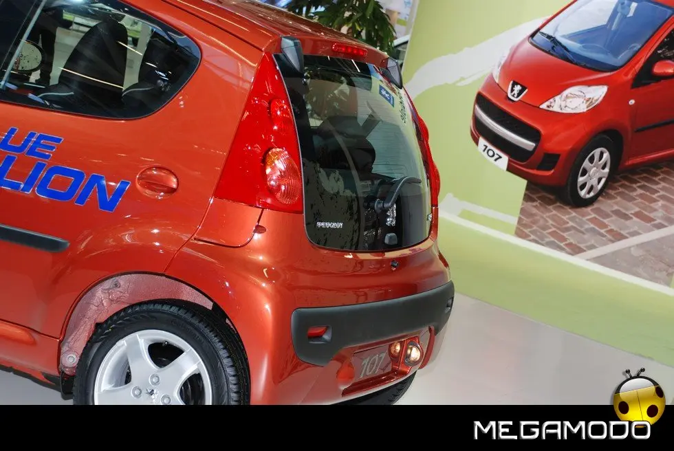 Visto da dietro, lo stile della 107 ribadisce l’anticonformismo della vettura, con il portellone-lunotto realizzato interamente in vetro fumé, che separa i triangoli isosceli rossi delle luci posteriori incapsulate. Lo impone l’utilizzo urbano: la 107 si protegge con dei paraurti posteriori molto avvolgenti abbinati a una fascia nera.