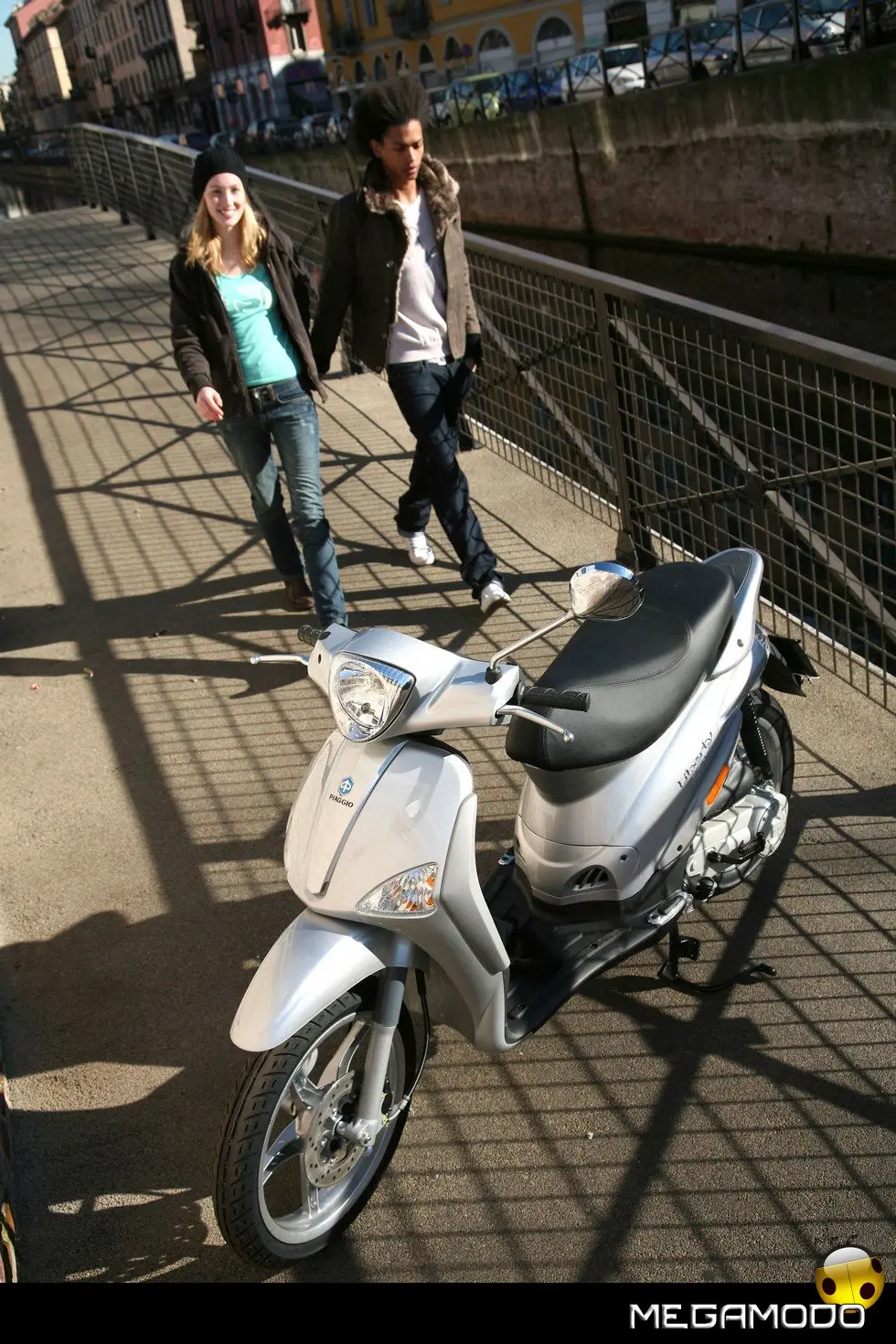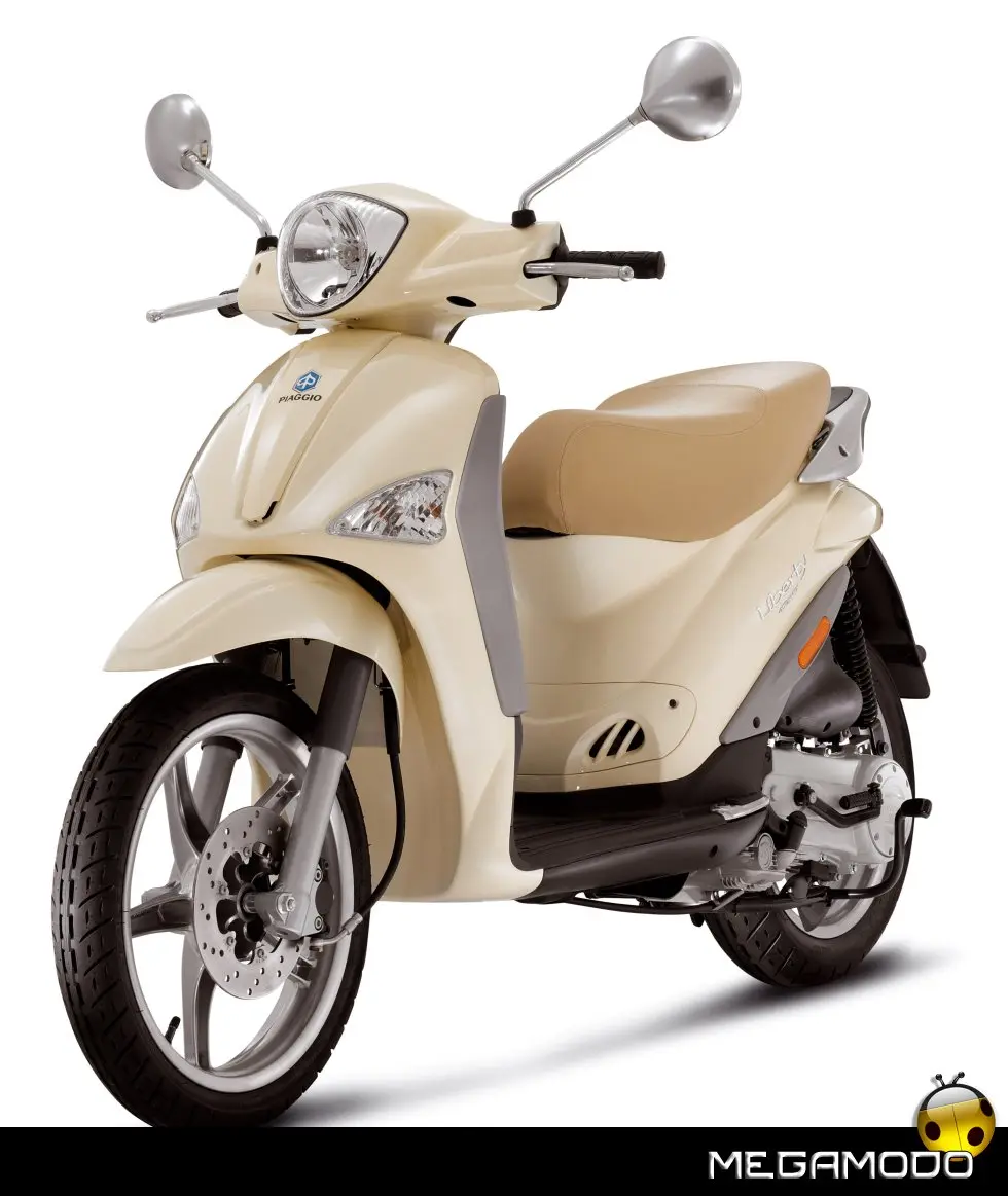Lo stile Nella vista frontale spicca il faro sul manubrio, gentilmente triangolare a richiamare quello del fortunatissimo e imponente “fratellone” a ruote alte Beverly 500. Lo scudo è altamente protettivo senza però compromettere la fantastica agilità di Liberty nel traffico. Le frecce, con copertura trasparente, sono elegantemente a filo. La mascherina sullo scudo sottolinea la familiarità con la gamma Piaggio mentre tutta la sezione posteriore mantiene la caratteristica snellezza. La plancia strumenti, grande, chiara e leggibile, ben si accorda con l'ampio respiro di tutto il veicolo e comprende tachimetro, contachilometri totale e indicatore del livello carburante. Completano la strumentazione la ricca serie di spie luminose (riserva carburante, faro anabbagliante e abbagliante e indicatori di direzione in funzione) e il pratico orologio digitale con datario. Tutti gli allestimenti sono curati nelle finiture, nelle goffrature ricche, nella scelta accurata dei colori metallizzati. Piccoli interventi distinguono e impreziosiscono le versioni targate: eleganti fregi cromati sottolineano le modanature posteriori e la mascherina sullo scudo, mentre una cornice cromata rende ancora più gradevole la strumentazione. La sella è a 795 mm da terra (805 mm per i targati), così diventa ancora più comodo l'uso del veicolo da parte della vasta clientela femminile. Piloti di tutte le taglie hanno assicurate una perfetta ergonomia, comfort e padronanza del veicolo in ogni condizione di guida.