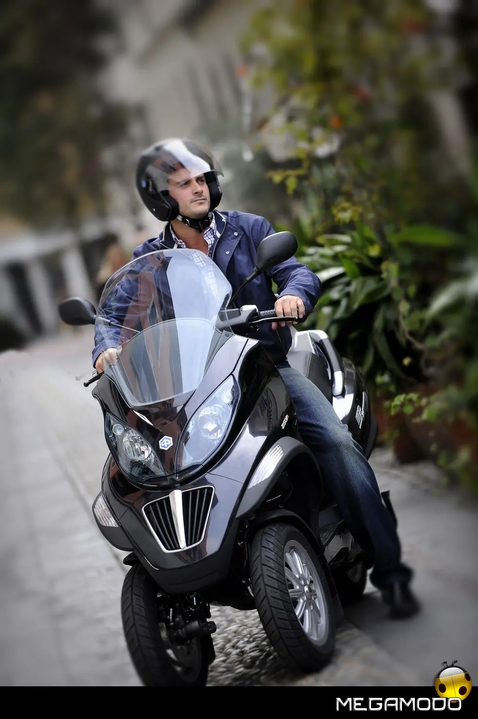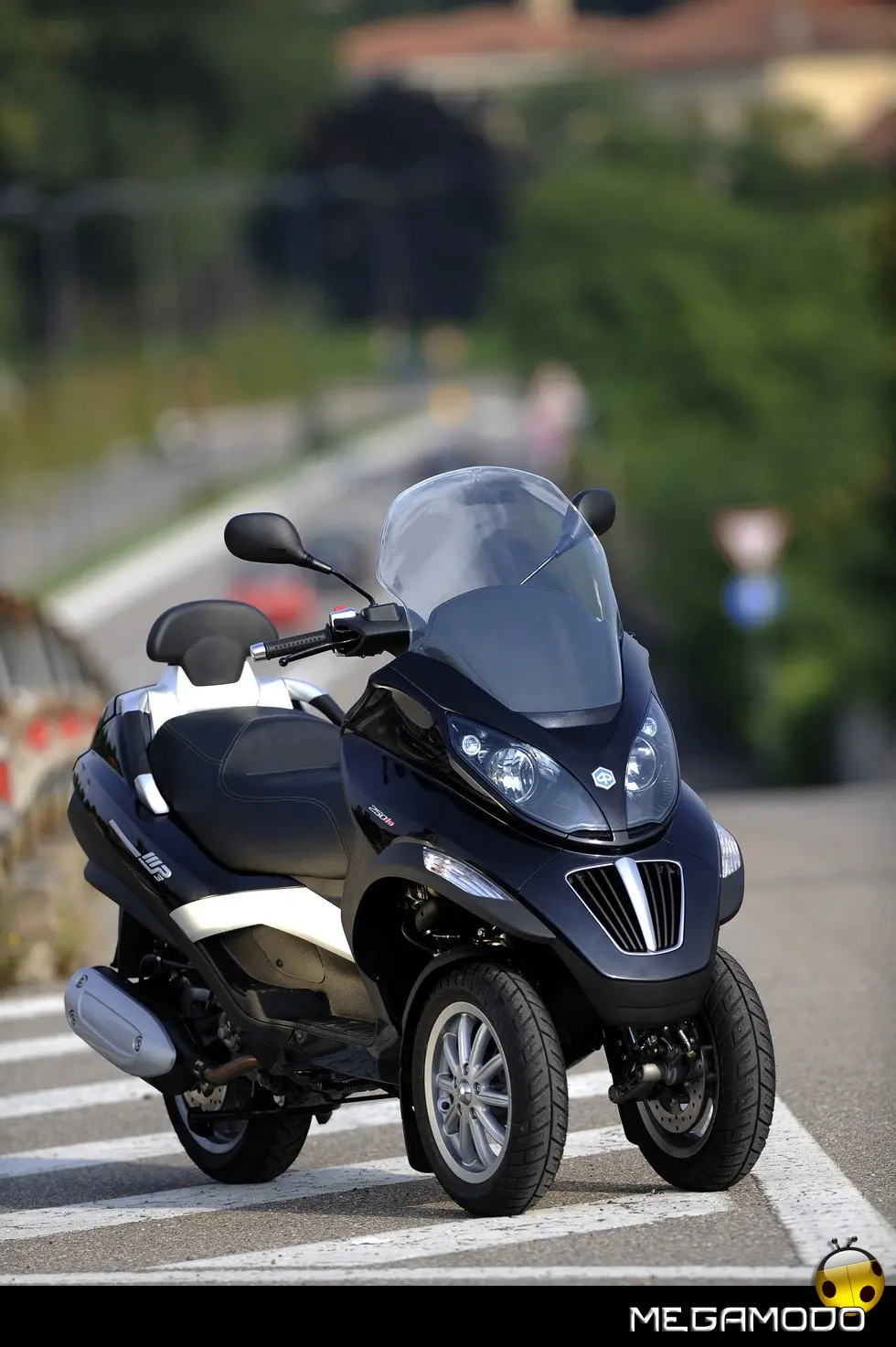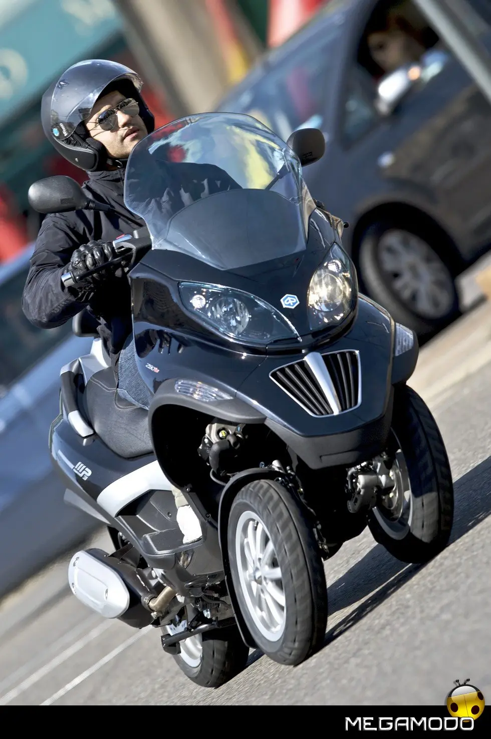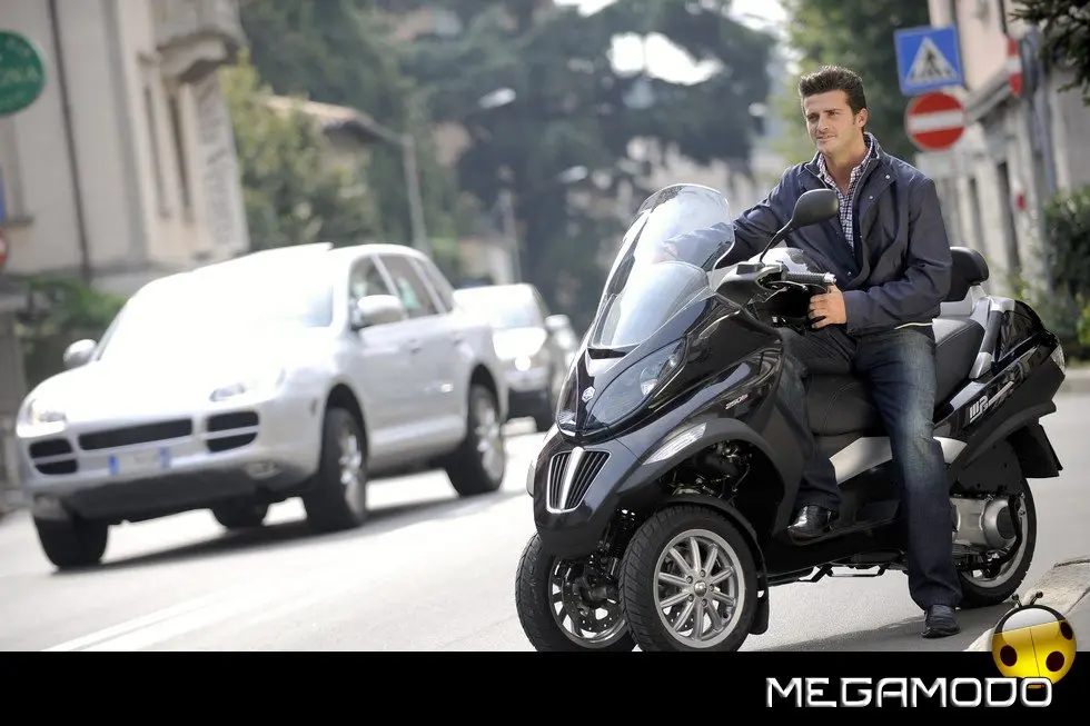 Piaggio MP3: un progetto unico al mondo. La guida di Piaggio MP3 è un’esperienza assolutamente rivoluzionaria, grazie al sistema di sospensione e alla doppia ruota anteriore che consente una stabilità in curva superiore a qualsiasi scooter. In velocità, anche nella scia di altri mezzi, Piaggio MP3 rimane incollato al terreno e raggiunge le massime prestazioni nella totale sicurezza. E la rivoluzione delle tre ruote si avverte in tutta la sua importanza sull’asfalto bagnato o in condizioni critiche per i mezzi tradizionali. Nei percorsi cittadini e metropolitani Piaggio MP3 non ha paragoni in fatto di sicurezza: pavé, asfalto irregolare o sconnesso, rotaie, tombini sono superati con una facilità e una stabilità mai provate prima.