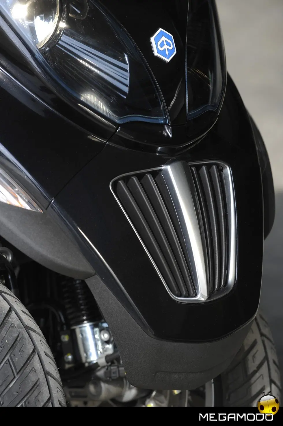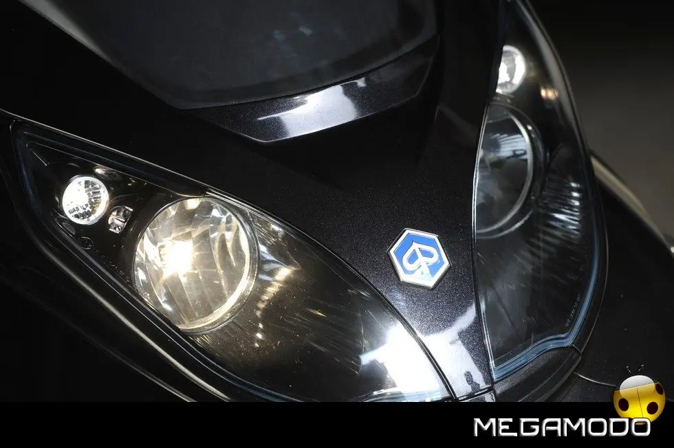 Il nuovo e più elegante aspetto della famiglia MP3 è sottolineato dalla calandra di disegno automobilistico, da nuove finiture, da fari e parabrezza in tonalità azzurra, dai nuovi inserti che alternano parti verniciate e parti cromate e dal nuovo maniglione posteriore.