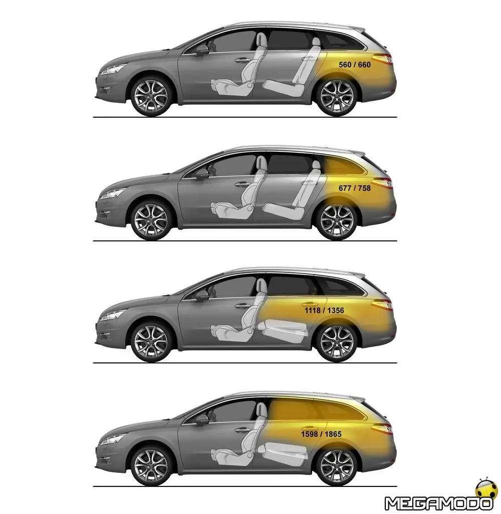 Da notare che questi vani hanno un volume di soli 29 litri (o di 26 dm3 norma VDA) nella versione "GT" (per la presenza del doppio terminale di scarico) oppure non sono disponibili, in presenza dell'opzione "ruota di scorta". Il tappeto rigido della SW può essere ripiegato per dividere il vano bagagli in compartimenti e accedere più facilmente ai singoli settori. La tendina coprivanobagagli con avvolgitore, solida e pratica, è facile da inserire e da movimentare, soprattutto grazie al sistema di avvolgimento automatico, attivabile esercitando una semplice pressione al centro. Sempre sulla SW, una rete verticale fermabagagli è disponibile in opzione per trasportare oggetti voluminosi in totale sicurezza. Si monta dietro i sedili della prima e della seconda fila.