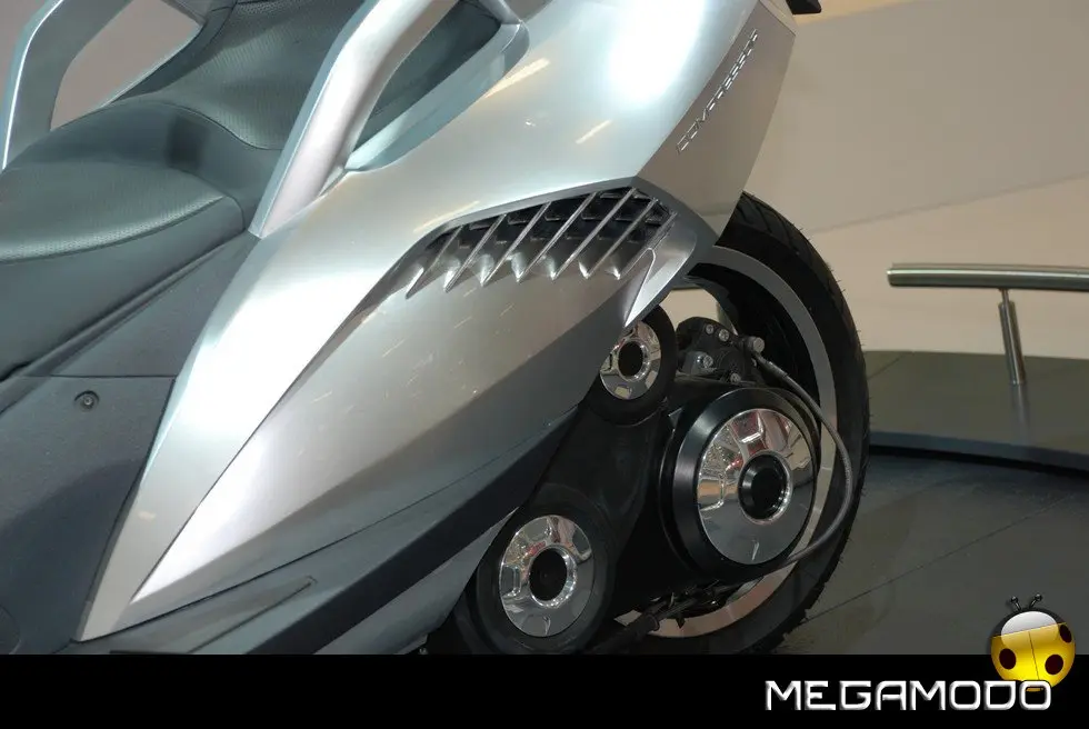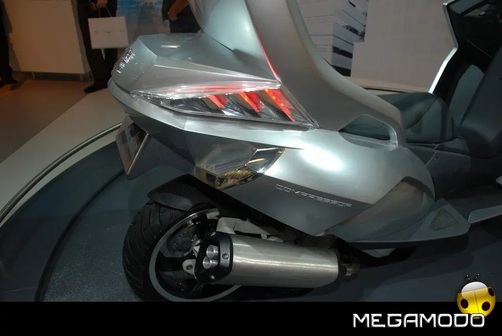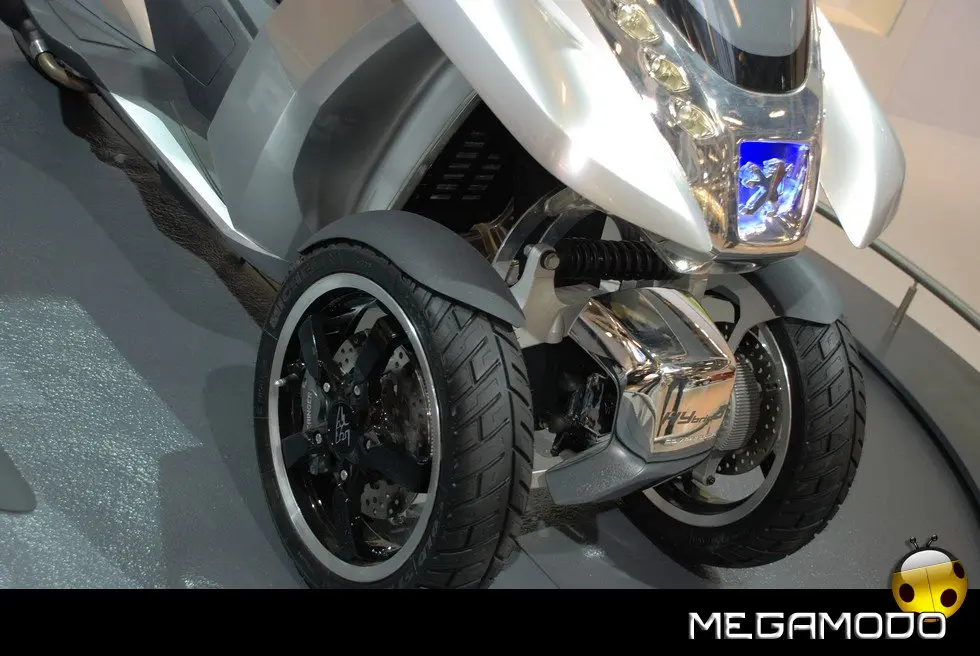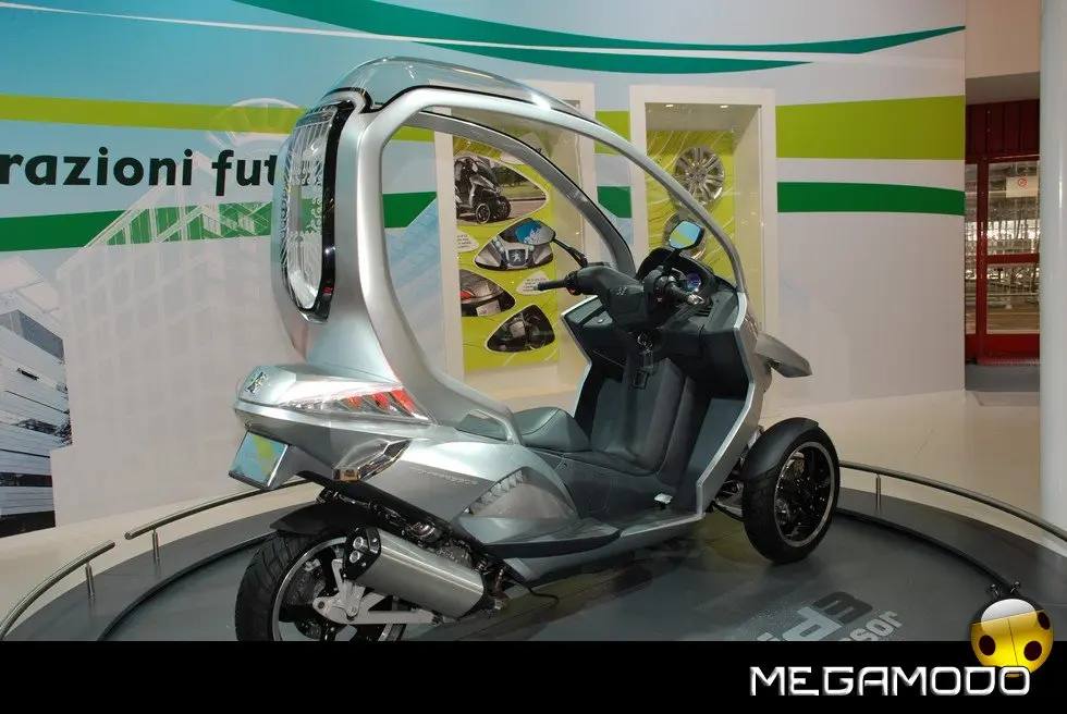 HYbrid3 Compressor è una proposta originalissima per facilitare la mobilità urbana. HYbrid3 Compressor con le sue 3 ruote e la carenatura, costituisce una sorta di anello mancante tra 2 mondi oggi ben distinti: quello dello scooter e quello dell’automobile. Con un motore elettrico in ciascuna delle 2 ruote sull’anteriore, abbinate, nel posteriore, a un motore termico, mette in scena soluzioni tecnologiche ibride molto innovative che permettono a ciascuna ruota di diventare motrice. In un mondo in cui il traffico urbano diventa sempre più intenso, in cui tutti cercano di guadagnare tempo, in cui il prezzo del petrolio è alle stelle e l’ambiente è diventato più che mai una priorità, gli uffici progettazione fanno a gara, mettendo a frutto la loro ingegnosità, per immaginare molteplici soluzioni per il futuro. Esprimendo tutta la loro creatività e il loro know-how, due diverse entità di Peugeot convergono verso un’idea simile e alla fine lavorano in simbiosi per dare vita a un progetto davvero originale: l’HYbrid3 Compressor. Questa “concept car”, o meglio ”concept scooter”, è, infatti, derivato da tutta l’esperienza di Peugeot Motocycles, esperta nel settore degli scooter, e da tutta la creatività e la capacità di innovazione delle equipe di designer e ingegneri di Automobiles Peugeot. Per creare questo prototipo, la casa del Leone ha attinto a piene mani a tutta la ricchezza della sua offerta di mobilità che permette a ogni individuo, a seconda della sua età o dei bisogni del momento, di rivolgersi a gamme di cicli, di motocicli o di automobili del Marchio. L’essenza di questo veicolo sta proprio in quello che rappresenta: una sintesi ideale tra i vantaggi di uno scooter e alcune caratteristiche dell’automobile. L’architettura di questo prototipo si compone, dunque, di 3 ruote, ai fini della massima stabilità, sicurezza e piacere di guida. La sua larghezza di 82 cm gli permette di inserirsi nel traffico urbano mantenendo l’efficacia di un veicolo a 2 ruote. Il parabrezza si prolunga fino al posteriore per formare una cellula di protezione contro le intemperie, molto efficace per il pilota e il suo passeggero. Infine, il veicolo integra la tecnologia HYbrid che integra qui il motore termico benzina Compressor che equipaggia già lo scooter Satelis. Ha una potenza di 15 kW (20 CV) che muove la ruota posteriore ed è abbinato a due motori elettrici da 3 kW ciascuno, situati nelle ruote anteriori. L’insieme sviluppa una potenza massima cumulata di 21 kW (29 CV) a fronte di consumi di carburante particolarmente contenuti, con 2,0 l/100 km pari a 47 g/km di CO2 nel ciclo misto e persino “0” nel modo soltanto elettrico. Questa configurazione meccanica permette anche all’HYbrid3 Compressor di beneficiare di 3 ruote motrici, a vantaggio della sicurezza e del piacere di guida. Grazie alla sua estrema ibridazione, il concetto HYbrid3 Compressor crea un nuovo punto di riferimento in termini di sicurezza (migliore motricità e migliore frenata), di praticità e di ecologia, per una polivalenza inedita, in osmosi con il suo ambiente.