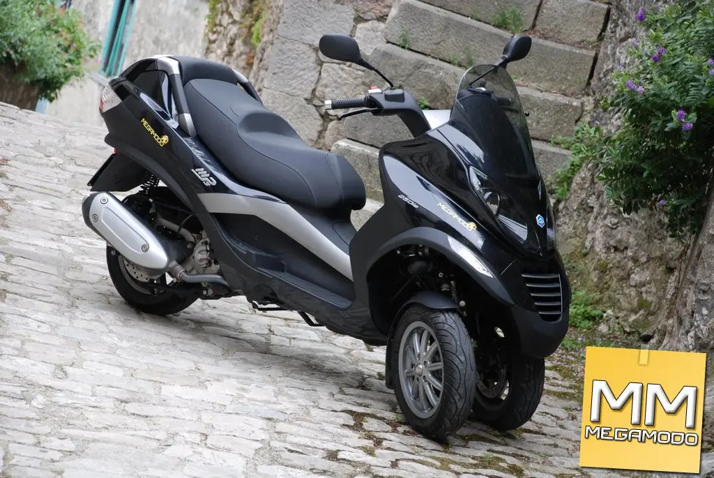 essant’anni dopo la nascita della Vespa, la Piaggio è tornata sul mercato con una nuova rivoluzione, questa volta però a tre ruote: MP3. Due ruote davanti e una dietro per garantire maneggevolezza e sicurezza su qualsiasi tipo di terreno, ridefinendo il concetto stesso di stabilità dinamica. L’avantreno, con le due ruote indipendenti e basculanti, consente una stabilità superiore a qualsiasi scooter; la rivoluzione delle tre ruote si avverte in tutta la sua importanza nelle condizioni critiche per i mezzi tradizionali. Nei percorsi cittadini e metropolitani l’MP3 non ha paragoni in fatto di sicurezza: è possibile incrociare i binari dei tram, molto diffusi nelle nostre città, senza problemi, frenare sulla ghiaia o sul terriccio con la stessa sicurezza di un fondo asfaltato, curvare in presenza di tratti umidi o di pozze d’acqua senza che sia compromessa la traiettoria. Ad agio nell’ambiente urbano è anche facilissimo da parcheggiare, grazie al sistema elettro-idraulico di bloccaggio della sospensione (optional), che permette al veicolo di autosostenersi anche senza il classico cavalletto centrale comunque in dotazione. Azionando il pulsante posto sul manubrio il sistema entra in funzione e blocca il rollio del veicolo, consentendo così al pilota di parcheggiare senza dover utilizzare il cavalletto. Il blocco del rollio è ottenuto mediante un elettroattuatore che aziona, tramite trasmissione meccanica, la pinza centrale di blocco-rollio e manda in pressione un circuito idraulico che agisce sulle pinze di blocco ammortizzatori. La centralina di controllo consente l’attivazione dell’elettroattuatore, dopo che il pilota ha azionato il pulsante, solo nel caso in cui la velocità del veicolo sia compresa tra 23 km/h e 10 km/h, a seconda della decelerazione rilevata (maggiore è la decelerazione, maggiore è la velocità consentita). Inoltre la valvola a farfalla deve essere chiusa ed il regime di rotazione del motore inferiore a 3.000 giri/min. A garanzia della sicurezza del guidatore, il dispositivo di blocco-rollio si disinserisce premendo il comando al manubrio, oppure si disattiva automaticamente quando la velocità del veicolo supera i 15 km/h, o se la valvola a farfalla non è completamente chiusa, o ancora a un regime di rotazione del motore superiore a 3.000 giri/min. Una comoda leva, posta nel retroscudo anteriore, aziona il freno di stazionamento, che rende sicura la sosta senza cavalletto anche su piani inclinati. Il sistema consente inoltre di parcheggiare le due ruote anteriori su dislivelli fino a 20 cm, praticamente potete parcheggiarlo ovunque. Gli spazi di frenata sono straordinari: grazie al sistema frenante a tre dischi da 240mm con pinze a doppio pistoncino da 30mm, lo spazio di arresto è ridotto, rispetto ad uno scooter tradizionale, del 20% in condizioni normali, e addirittura del 24% in condizioni di bassa aderenza. La dotazione ciclistica è il cuore dell'MP3: il telaio in tubi di acciaio altoresistenziale, è frutto di un progetto che si avvale delle migliori tecnologie CAD e della FEM (Finite Element Method) analysis computerizzata. Elementi come la resistenza strutturale e il peso sono stati perfettamente definiti e testati già dalle fasi iniziali del progetto, verificando, in ogni tratto progettuale, la validità delle soluzioni adottate. Al telaio è ancorata, mai vista nel mondo scooter, l’innovativa sospensione a quadrilatero articolato, un progetto originale Piaggio, il cui meccanismo di rollio è composto da quattro bracci fusi in alluminio, articolati su altrettante cerniere solidali al cannotto centrale, e da due cannotti laterali collegati ai suddetti bracci mediante perni e cuscinetti a sfere. All’interno dei cannotti laterali ruotano il tubo sterzo destro e quello sinistro, in un classico schema monobraccio. L’MP3 monta 3 ruote da 12”, gommate con pneumatici Pirelli (nella versione da noi testata) da 120/70 all’anteriore e 130/70 al posteriore, che lavorando insieme alla rivoluzionaria sospensione anteriore consentono angoli di piega fino a 40°. La dotazione ciclistica è completata, al posteriore, da una sospensione monobraccio con due ammortizzatori idraulici a doppio effetto, con molla elicoidale e precarico regolabile su 4 posizioni. Sicuramente la seconda regolazione è quella migliore, soprattutto nella guida sportiva. Mettere l'MP3 in crisi è impresa ardua. Solo frenando con il mezzo molto inclinato l’avantreno tende a chiudere ma è davvero una situazione limite. Piuttosto abbiamo avvertito qualche problema al posteriore visto che trovare il limite è molto semplice, dato che che ci vuol poco per iniziare a strusciare il cavalletto in piega. Vi potrà capitare di sentire la ruota posteriore derapare (soprattutto sui fondi difficili), ma non preoccupati non si cade anzi per i più pratici diventa perfino divertente. L’MP3 si distingue subito per l’estetica innovativa e accattivante, l’ingombro della carreggiata anteriore è di soli 420 mm; caratteristica che lo rende omologabile come un tradizionale motociclo a due ruote. L’estetica dell’avantreno, è caratterizzata da linee filanti e da superfici che, per trattamento, si avvicinano a quelle del settore automobilistico: i gruppi ottici anteriori e il cupolino si fondono a formare, un volume unico che, oltre a slanciare il veicolo, costituisce l’elemento di protezione per il pilota. Le parti laterali dello scudo sono caratterizzate dai parafanghi di materiale antiurto, che svolgono una funzione protettiva sia per il pilota che per il veicolo, mentre il posteriore è stato pensato per massimizzare comfort e capacità di carico. Lo sportello posteriore, in tinta con la carrozzeria, completa la silhouette del veicolo e permette di accedere direttamente al vano sottosella. Con ben 65 litri di capacità e il doppio accesso al vano, dal portellone e dalla sella, la funzionalità dell’MP3 è la migliore della categoria. Il vano bagagli può infatti conten