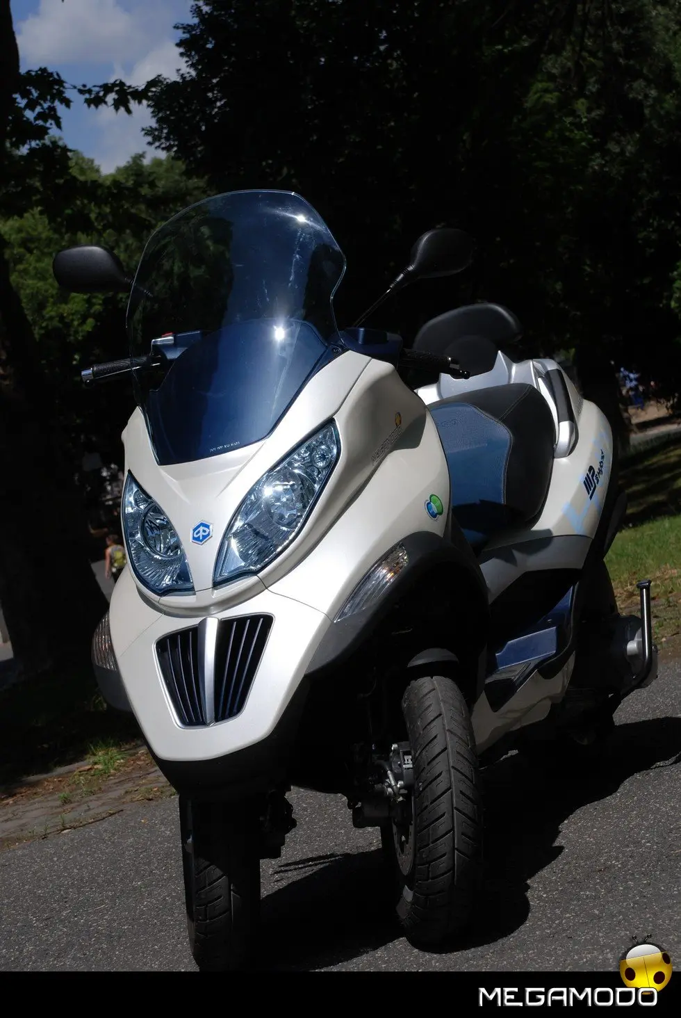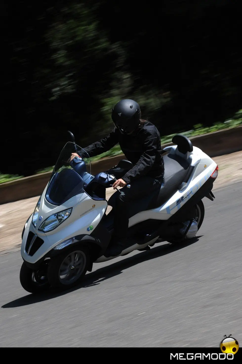 ilenzio. E’ questo il rombo del nuovo scooter ibrido a tre ruote. MP3 Hybrid, presentato dal Gruppo Piaggio è un veicolo destinato a rivoluzionare il settore della mobilità urbana. Non semplicemente uno "scooter con due motori", ma un nuovo avanzatissimo veicolo che integra la tradizionale propulsione termica a basso impatto ambientale con la motorizzazione elettrica a emissioni zero, sommando i vantaggi dei due propulsori. MP3 è, inoltre, il primo scooter a 3 ruote, che rivoluziona completamente la guida individuale in termini di sicurezza, stabilità e piacere di guida. Ricorrendo ad una tecnologia assolutamente esclusiva, Piaggio risponde pienamente al tema sempre più attuale dell’ecosostenibilità, un argomento al centro dell’interesse di tutti i più grandi costruttori del mondo automotive, proponendo un veicolo unico in tutto il settore a utilizzare batterie agli ioni di litio e offrire la possibilità di ricarica da rete elettrica “Plug-In”. Ciò consente di abbattere di oltre di il 50% il consumo di benzina sia di ridurre le emissioni di anidride carbonica. MP3 Hybrid è capace di percorrere fino a 60 Km/l, emettendo solo 40 g/km di CO2, garantendo valori di coppia superiori dell’85% rispetto ad uno scooter tradizionale di pari cilindrata. La potenza e l’autonomia del motore termico unite allo spunto elettrico mantengono intatte tutte le caratteristiche di un MP3: piacere di guida, sicurezza, comfort e praticità. Piaggio Mp3 Hybrid adotta una propulsione ibrida di tipo "parallelo" in cui i due motori, elettrico e a scoppio, sono integrati tra loro meccanicamente ed elettronicamente e risultano in grado di fornire simultaneamente potenza alla ruota posteriore, dando luogo a una sinergia vincente. In questa propulsione integrata termico/elettrica, il motore "termico", cioè quello a benzina, funziona come un normale motore quattro tempi catalizzato, con ottime prestazioni, emissioni ridotte, bassi consumi e ampia autonomia. Il cambio automatico, l'avviamento elettrico e l'innovativo sistema di acceleratore elettronico Ride-by-Wire (acceleratore elettronico senza fili), adottato per la prima volta su uno scooter, consentono di ottimizzare prestazioni e consumi. Inoltre, l’elettronica di bordo (VMS – Vehicle Management System) determina, in base alle reali condizioni di utilizzo, quanta potenza viene trasmessa dal motore termico e quanta da quello elettrico. I vantaggi conseguibili con MP3 Hybrid sono notevoli: - riduzione dei consumi di benzina (percorrenza fino a 60 km/l) - riduzione delle emissioni di CO2 (soli 40 g/km su utilizzo 65% ibrido e 35% elettrico) - possibilità di funzionare solo con il motore elettrico: si spegne il motore termico ed MP3 Hybrid diventa uno scooter totalmente ecologico, uno “Zero Emission Vehicle” che può circolare con pieno diritto in tutte le zone interdette ai motori a scoppio (autonomia in puro elettrico: circa 20 km) - fino all’85% in più di potenza rispetto al corrispondente motore termico - grazie al costo inferiore dell’energia elettrica rispetto a quello della benzina, si riducono le spese di esercizio potendo ricaricare la batteria attraverso la rete elettrica con il carica batterie integrato nell’elettronica di bordo. Lo scooter è sinonimo di mobilità urbana: è il mezzo ideale per districarsi rapidamente nel traffico congestionato della metropoli ma anche per piacevoli evasioni nei week-end. La necessità di integrare tecnologia e rispetto dell’ambiente, riducendo quanto più possibile i livelli di emissioni gassose inquinanti, ha portato alla creazione di aree a traffico limitato sempre più vaste. Zone da cui spesso anche gli scooter sono stati banditi. Sono nati così i veicoli elettrici, che grazie a un propulsore a "emissioni zero" permettono di circolare ovunque. Entrambe le motorizzazioni, termica ed elettrica, presentano pregi e difetti che, in molti casi, risultano essere complementari: grande autonomia, potenza e "allungo" per i motori a scoppio, che sono però penalizzati dall'emissione di gas di scarico (seppur rigidamente regolamentati dall'attuale normativa Euro 3); emissioni zero e spunto da fermo particolarmente brillante, invece, per i propulsori elettrici che sono peraltro limitati dalla scarsa autonomia delle batterie e dalla velocità massima contenuta. Con Piaggio Mp3 Hybrid non si deve più scegliere tra prestazioni ed ecologia, tra un veicolo per recarsi a lavorare in centro ed uno per i percorsi più lunghi, anche extraurbani. La soluzione Hybrid non si limita infatti ad offrire due distinte possibilità di propulsione, ma le integra in un sofisticato sistema che permette di coniugare la potenza del motore termico e gli straordinari vantaggi ambientali di quello elettrico. Mp3 Hybrid è divertente e sicuro nei tratti extraurbani nei quali mette in mostra le superiori caratteristiche dinamiche di Piaggio Mp3 e può viaggiare anche nelle ZTL: due scooter in uno, insomma, per una mobilità sicura, facile, economica, divertente. Piaggio MP3 Hybrid rende ora disponibile per tutti la tecnologia ibrida aprendo a fasce sempre più ampie di utenti la possibilità di una mobilità rispettosa dell’ambiente. MP3 Hybrid si guida semplicemente, come un normale MP3, e unicamente attraverso il pulsante tasto “Hy Tech” è possibile selezionare, anche in movimento, ben 4 modalità di utilizzo: due ibride e due elettriche (retromarcia compresa). MP3 Hybrid gestisce la potenza erogabile dai due motori (termico ed elettrico) per mezzo di un sistema di tipo Ride-by-Wire: la richiesta di coppia da parte del pilota, che agisce su acceleratore e freno, viene elaborata dal sistema integrato di gestione elettronica che, sulla base di diversi parametri (per esempio lo stato di carica delle batterie), ripartisce opportunamente la potenza tra i due motori. In condizioni di decelerazione e frenata, il sistema di controllo recupera e accumula energia nella batteria; energia che nei normali veicoli viene 