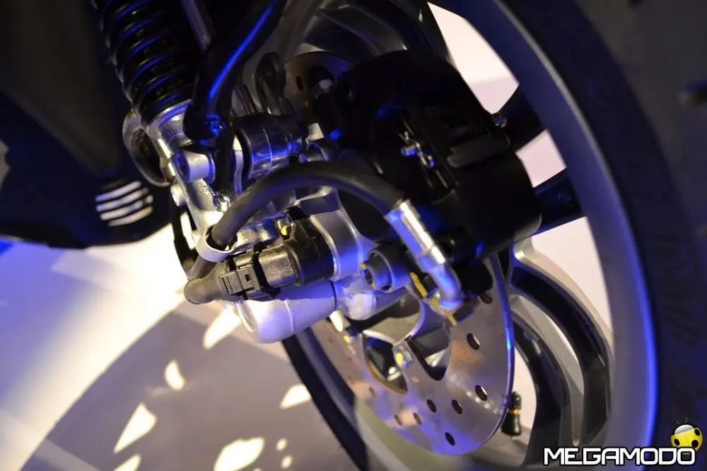 Al grintoso frontale corrisponde una coda slanciata e filante, che integra con eleganza due comode maniglie per il passeggero e termina col moderno e curato fanalino posteriore, caratterizzato da luci di posizione e stop a led. La bicromia della carrozzeria, che alterna parti colorate a inserti verniciati color alluminio, si unisce al pacchetto coordinato della sella e degli interni. L’innovativo elemento centrale dall’aspetto metallico lega e tende le forme, sottolineandone la muscolatura e il dinamismo. I dettagli del manubrio, del retro scudo e del tunnel centrale, sotto il quale si cela il tappo serbatoio, completano l’estetica del veicolo.