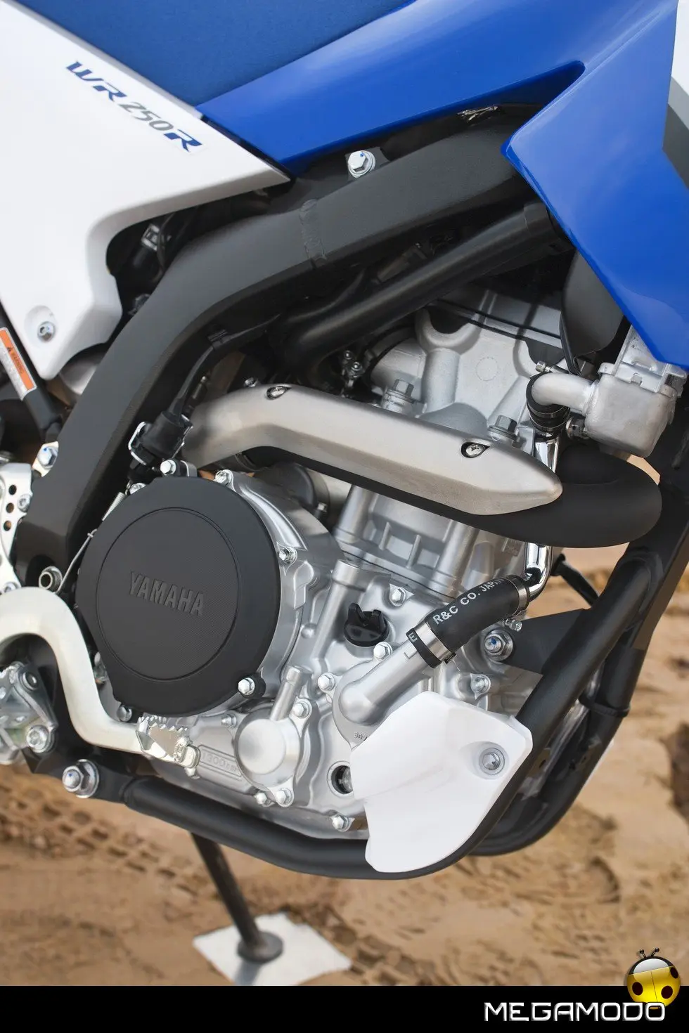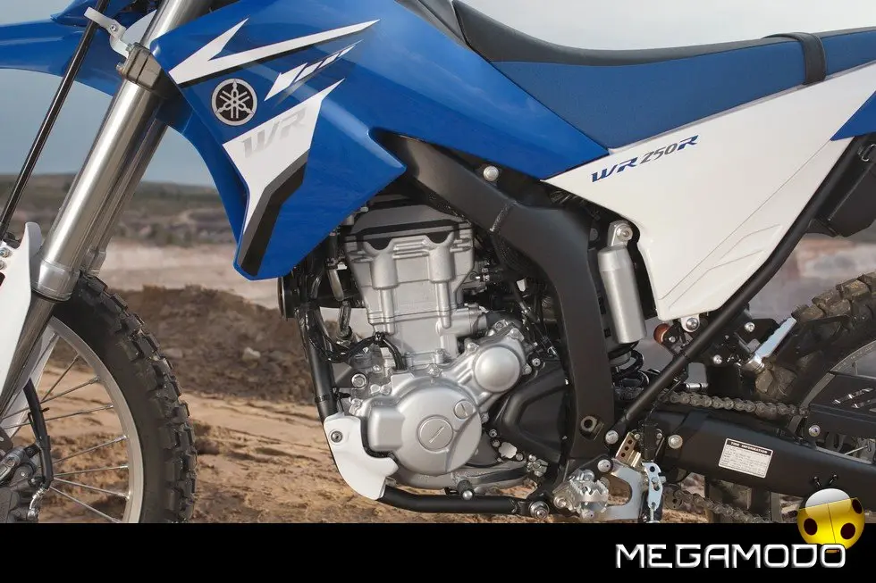 Caratteristiche principali WR250R: - Motore completamente nuovo da 250 cc a 4 tempi, raffreddato a liquido con 4 valvole e DOHC - Valvole di aspirazione in titanio maggiorate e ultraleggere - Albero a camme e con finitura superficiale WPC* (*Wonder Process Craft) - Alesaggio x corsa 77,0 mm x 53,6 mm (come per YZ/WR250F) - Rapporto di compressione elevato di 11.8:1 - Nuova camera di combustione - Potenza massima sviluppata a 10.000 giri/min - Avviamento elettrico. - Iniezione elettronica con iniettore a 12 fori - Aspirazione rettilinea con valvola di controllo dell’aria - Pistone forgiato ultraleggero - Cilindro con riporto in composto ceramico - Motore compatto - Sistema di lubrificazione a carter umido per ridurre il peso - Bobina di accensione compatta - Magnete CA con terre rare compatto e ultraleggero - Frizione a 13 dischi ad azione progressiva - Cambio a 6 marce - Marmitta compatta a 3 stadi con valvola EXUP - Sistema di immissione forzata dell’aria e catalizzatore a nido d’ape - Telaio a semi-doppia culla a 3 sezioni - Telaio con elementi in alluminio pressofuso, forgiato. - Forcellone in alluminio ultraleggero con sezione trasversale asimmetrica - Forcella con steli rovesciati da 46 mm e corsa di 270 mm - Sospensione posteriore a leveraggi progressivi, con escursione di 270 mm - Altezza dal suolo di 300 mm - Posizione di guida eretta per un eccellente controllo - Altezza della sella di 930 mm per eccellenti prestazioni fuori strada - Strumentazione digitale multifunzione - Design ultraleggero con eccellente concentrazione delle masse - Disco anteriore di 250 mm e disco posteriore di 230 mm a margherita - Luce posteriore a LED