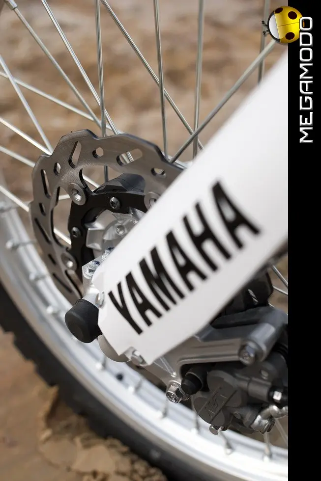 Sospensione posteriore a leveraggi progressivi completamente regolabile La sospensione posteriore con leveraggi progressivi derivata dai modelli da competizione è stata sviluppata dai team Yamaha specializzati nelle moto da enduro e da corsa che partecipano ai Campionati Mondiali, ed è una delle più avanzate della categoria. Il forcellone in alluminio ultraleggero agisce su un nuovo ammortizzatore con un’asta e un cilindretto rispettivamente di 14 e 46 mm di diametro, progettati per la guida su tutte le superfici, dal pavé delle città fino alle condizioni estreme dei fuori strada. Come la forcella, la sospensione posteriore offre una gamma completa di regolazioni del precarico e dell’idraulica in compressione/estensione, con un’escursione ruota di 270 mm: il risultato è una guida estremamente comoda per il pilota in ogni condizione.
