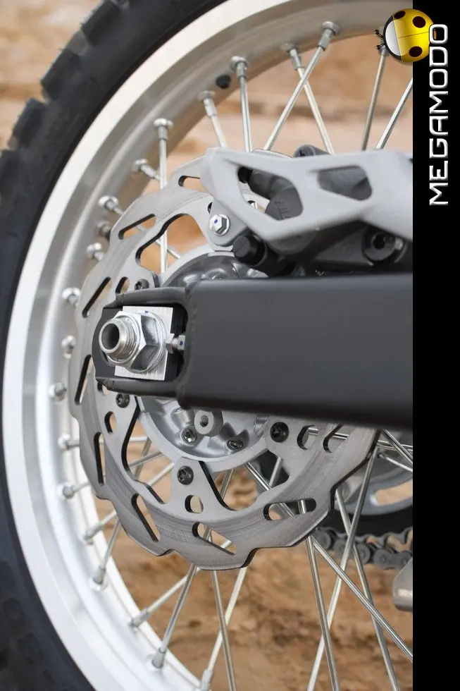 Dischi posteriori e anteriori a margherita La tecnologia sviluppata dai modelli da corsa è evidente ogni volta che si guarda la WR250R. Un esempio sono i dischi a margherita posteriori da 230 mm e anteriori da 250 mm, il cui design è riproposto sulle moto ufficiali e sui modelli YZ e WR, per ridurre il peso non sospeso e facilitare la pulizia delle pastiglie.