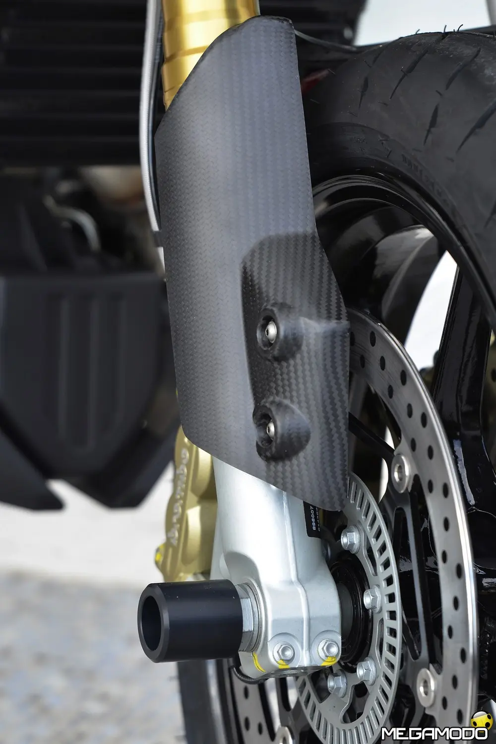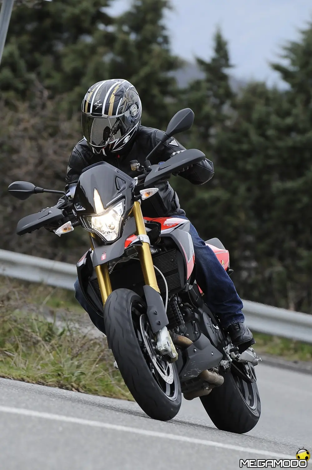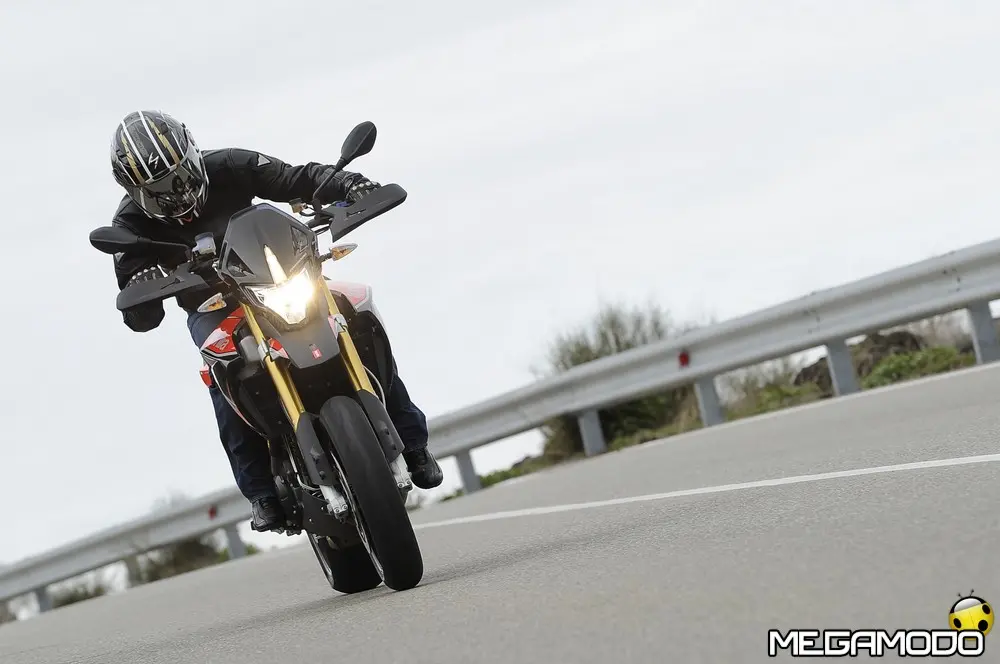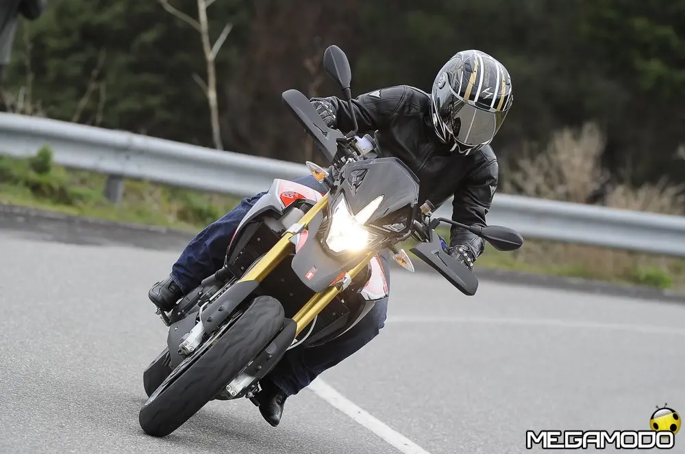 SPORT: esagerata, per quando ci si vuole mettere alla prova con l’esuberanza di un’erogazione pronta e diretta. TOURING: levigata, per sfruttare in ogni occasione la potenza da brivido del motore da 1200 cc. RAIN: calibrata, con una potenza tagliata su misura a 100 CV per divertirsi anche in condizioni di aderenza non ottimale o asfalto bagnato. Le sospensioni La forcella a steli rovesciati Sachs da 43 mm con piedini fusi in conchiglia è regolabile nel precarico molla e nel freno idraulico in compressione ed estensione. Si tratta di un’unità molto sofisticata che, oltre ad essere regolabile in ogni direzione, offre una scorrevolezza da riferimento e un’escursione (160 mm) perfettamente in linea con la filosofia delle supermoto. L’ammortizzatore laterale Sachs a gas con serbatoio separato è infulcrato direttamente al forcellone secondo lo schema cantilever ed è regolabile nel precarico molla e nell’idraulica sia in compressione sia in estensione. Una unità che consente ai piloti più esperti di ottenere il massimo delle prestazioni dalla moto, anche in circuito. La corsa della ruota posteriore è di 155 mm.