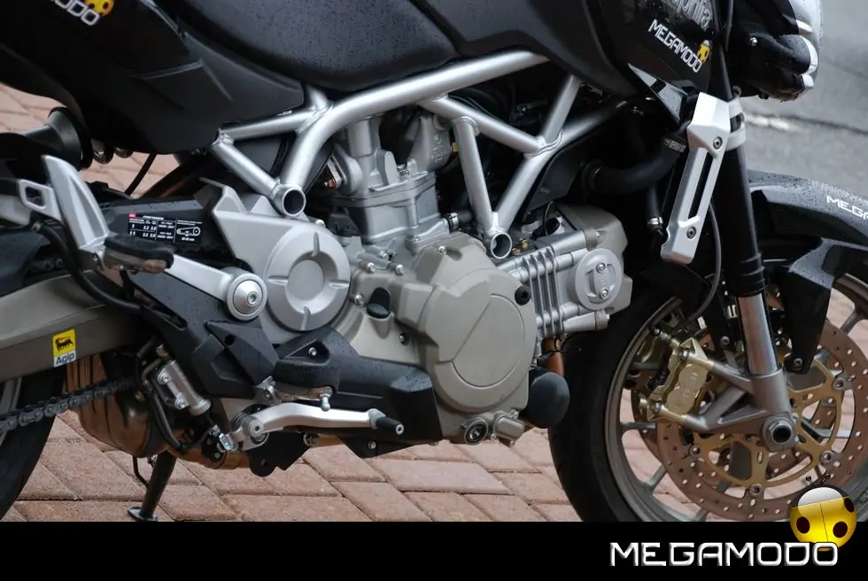 Dati che rendono bene l’idea delle prestazioni di questo motore, superiori a quelle delle naked di pari cilindrata, grazie anche alle incredibili doti di accelerazione. Le quattro valvole per cilindro sono guidate da un singolo albero in testa comandato da catena, soluzione dalla manutenzione semplice e al tempo stesso efficace dal punto di vista delle prestazioni. Come tradizione Aprilia per i motori di grossa cilindrata, la lubrificazione è a carter secco, con serbatoio separato ma integrato nel motore per una maggiore leggerezza d’insieme. La respirazione del motore è assicurata da una volumetria particolarmente ampia sia della cassa filtro sia dello scarico. La gestione elettronica del motore passa anche per un sofisticato sistema di iniezione elettronica Weber Marelli che utilizza un singolo corpo farfallato da 38 mm e un sistema di accensione con due candele per cilindro; soluzioni che consentono una combustione ottimale ad ogni regime a tutto vantaggio del rendimento termodinamico del motore e, quindi, delle prestazioni e della riduzione delle emissioni inquinanti. Un motore non solo molto performante ma anche estremamente rispettoso dell’ambiente.