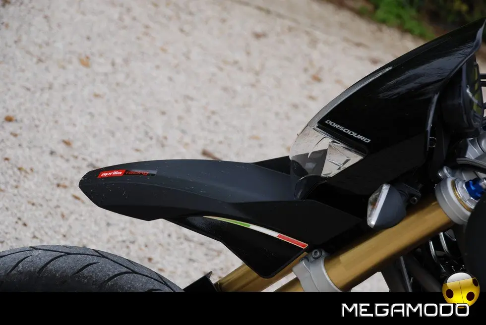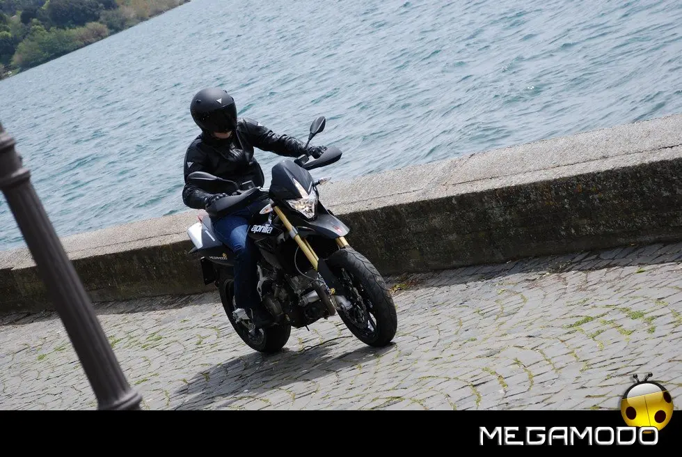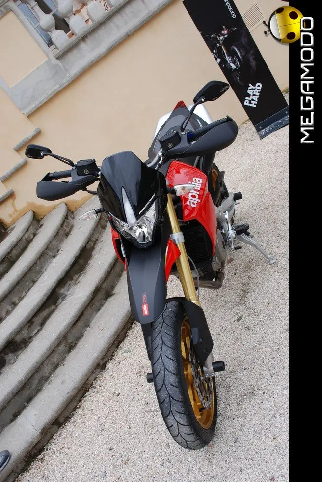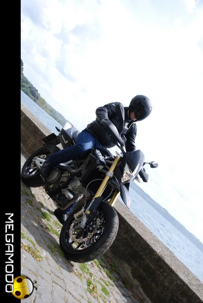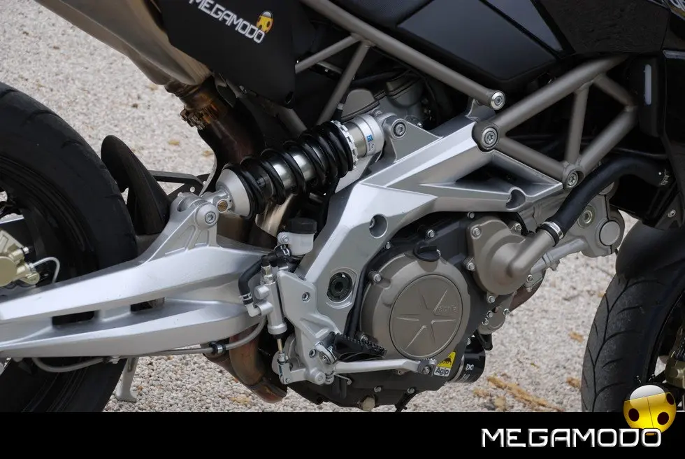 Una centralina di ultima generazione gestisce tutti i parametri del motore, le informazioni passano attraverso una linea CAN, per raggiungere la strumentazione che funge da terminale di autodiagnosi. La linea CAN utilizza due soli fili per il trasferimento di tutti i dati semplificando enormemente l’impianto elettrico e contribuendo alla leggerezza complessiva della moto. Grazie alla tecnologia elettronica e meccanica impiegata, il bicilindrico Aprilia vanta 92 CV a 8.750 giri e una coppia massima di 82 Nm a 4.500 giri. E’ disponibile, sin dal debutto, anche nella versione per neopatentati, limitata a 25 kW. La gestione elettronica dell’acceleratore Ride By Wire ha permesso di evitare il taglio della potenza su tutto il range, come accade su moto meno evolute, e mantenere l’erogazione identica a quella della “sorella” full-power fino al raggiungimento della potenza massima consentita. Da sempre le moto Aprilia sono considerate un punto di riferimento per l’eccellenza ciclistica. La Dorsoduro non smentisce la tradizione. E’ progettata per essere portata al limite in qualsiasi situazione di guida, permettendo al pilota di “girare stretto” e uscire dalle curve a gas spalancato. Merito di una ciclistica “svelta”, studiata con un occhio di riguardo per l’ergonomia, che permette alla Dorsoduro di adattarsi a qualsiasi tipologia di pilota e a ogni driver di sfruttare, in ogni situazione, i limiti della moto. Che divertimento!! Il telaio sfrutta tutte le conoscenze acquisite da Aprilia nelle competizioni. La parte superiore a traliccio stretto di tubi in acciaio è unita alle piastre laterali in alluminio (molto estese), tramite speciali bulloni ad alta resistenza. Ne deriva una struttura estremamente rigida e leggera. La continua sinergia tra motoristi e telaisti ha portato a un affinamento ottimale delle soluzioni tecnico/prestazionali e ha consentito una integrazione perfetta della meccanica nel telaio. Il posizionamento laterale e molto inclinato dell’ammortizzatore ha reso disponibile spazio prezioso per una conformazione ottimale dei collettori di scarico senza incidere sulla lunghezza della moto e senza andare a stressare termicamente l’ammortizzatore. Il forcellone in alluminio è dimensionato per sopportare le sollecitazioni asimmetriche dovute al posizionamento laterale dell’ammortizzatore. La definizione ottimale delle sospensioni è da sempre un fiore all’occhiello della casa di Noale.