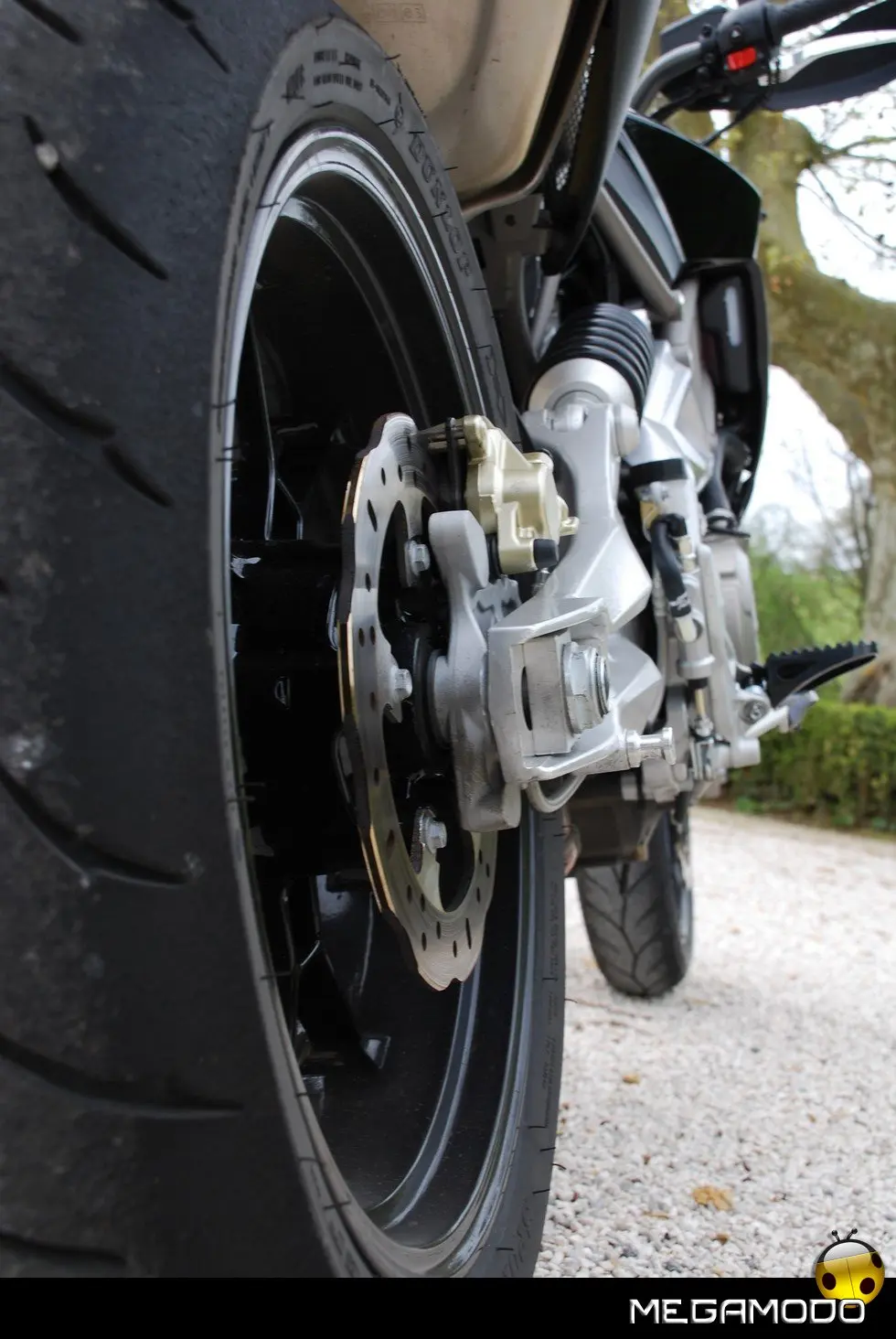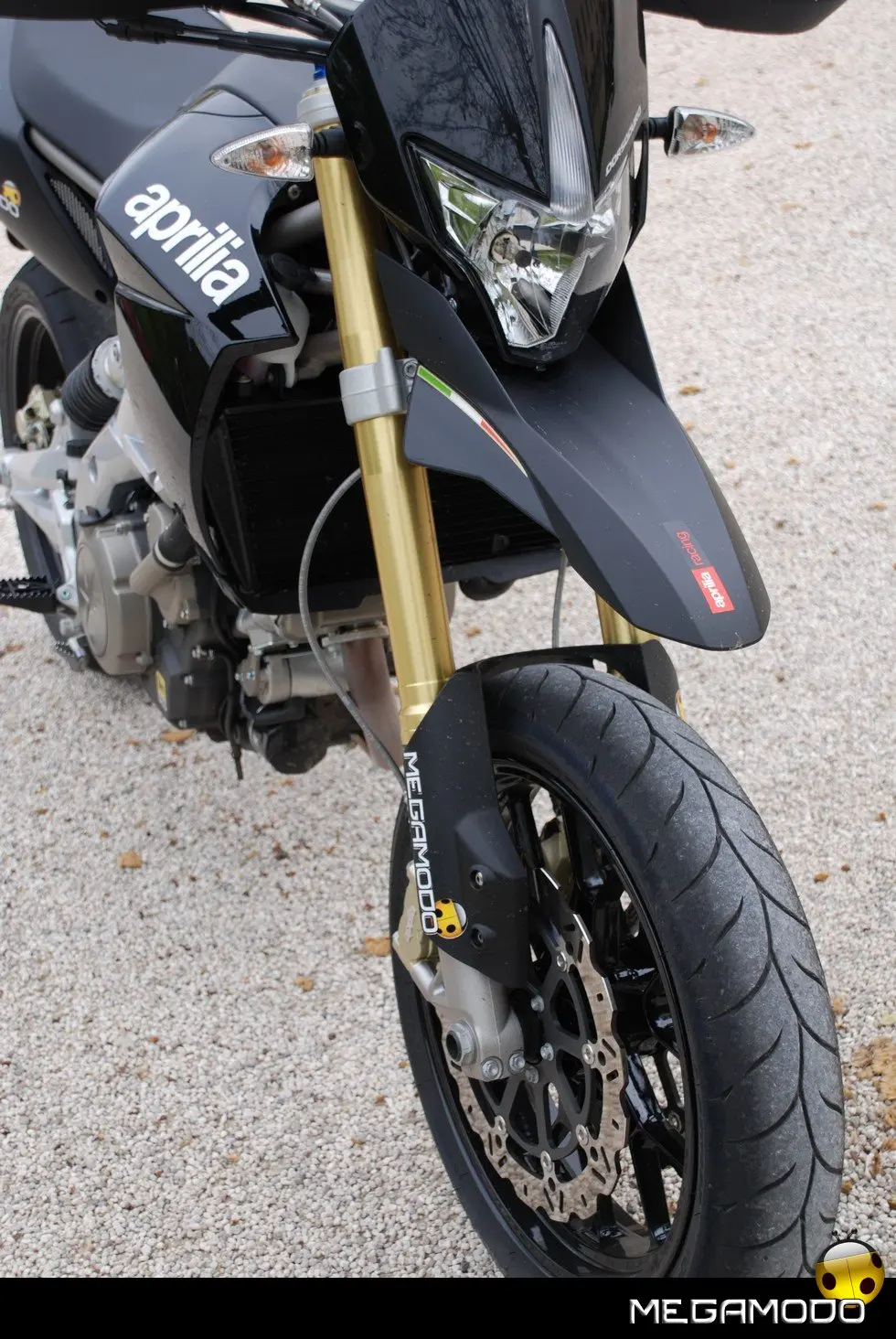 La forcella a steli rovesciati da 43 mm con piedini fusi in conchiglia a supporto delle pinze radiali è regolabile nel precarico molla e nel freno idraulico in estensione. E’ un’unità molto sofisticata che offre una scorrevolezza da riferimento e una escursione (160 mm) in linea con la filosofia delle supermoto. Entrambe le piastre di sterzo sono forgiate, la superiore anche anodizzata. L’ammortizzatore laterale è infulcrato direttamente al forcellone secondo lo schema cantilever ed è regolabile nel precarico molla e nel ritorno idraulico, la corsa della ruota posteriore è di 160 mm, anch’essa in linea con la filosofia motard che vuole sospensioni efficaci e controllate ma a corsa lunga. Ottimo anche l’impianto frenante, l’anteriore a pinze radiali con 4 pistoncini rappresenta lo stato dell’arte attualmente disponibile per una moto di questo segmento. I dischi “wave” flottanti da 320 mm sono leggeri, assicurano minori spazi di arresto e sottolineano l’aggressività della frenata grazie ad un look graffiante, in linea con lo stile complessivo della Dorsoduro. Anche il disco posteriore da 240 mm è del tipo “wave” ed è frenato da una pinza a singolo pistoncino. Sia l’impianto anteriore, sia quello posteriore, utilizzano tubazioni in treccia metallica di derivazione aeronautica che eliminano il fastidioso effetto polmone delle tubazioni convenzionali.