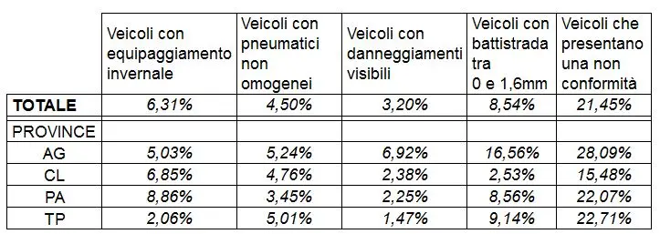 Nella provincia di Agrigento il totale delle non conformità ha addirittura raggiunto il picco del 28% con un 16% di vetture con pneumatici lisci, che si confronta con un 8% medio nell’intera regione. L’indagine evidenzia anche il 4,5% di veicoli con pneumatici non omogenei, il 6% di vetture con equipaggiamento invernale (ndr i controlli sono avvenuti a giugno) e il 3% con danneggiamenti visibili.