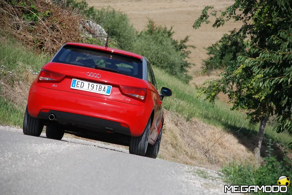 L’illuminazione posteriore appare omogenea e insolitamente estesa, anche nella versione base. Nella versione xeno plus o, come opzione singola, in ognuno dei gruppi ottici posteriori, sono incastonati 54 LED, con un assorbimento energetico complessivo di soli 3,5 Watt. I cosiddetti LED SuperRed emettono una luce rosso rubino particolarmente intensa e creano un effetto luminoso apparentemente tridimensionale mediante l’abile accostamento di due linee arcuate. L’aspetto delle luci di arresto, rafforzato dalla presenza di riflettori, appare circolare per la presenza di due cornici cromate. Il retronebbia è integrato nella luce di arresto e utilizza i LED di intensità luminosa variabile. Una dimostrazione della particolare attenzione concessa ai dettagli dai designer Audi è rappresentata dai LED supplementari inseriti nei montanti posteriori. Poiché con il cofano bagagli aperto è impossibile distinguere le luci posteriori, la funzione di segnalazione della posizione della vettura viene assunta dai LED. Nella grembialatura un diffusore nero in perfetto stile racing completa la parte inferiore della coda conferendole un tocco di sportività. Il terminale di scarico in conformazione doppia nella 1.4 TFSI si mostra sul lato sinistro inferiore ed è adornato da eleganti mascherine nella linea Ambition. L’impianto di scarico è nel suo complesso molto leggero, in quanto l’impiego di acciai inossidabili pregiati ha consentito di ridurre lo spessore delle pareti dei tubi e degli elementi fonoassorbenti. La A1 è disponibile in dieci colori. I colori standard sono il Bianco Amalfi, l’Azzurro Nube e il Nero Brillante; i colori metallizzati sono l’Argento Ghiaccio, il Nero Profondo, il Marrone Teak, il Rosso Shiraz, il Blu Scuba, il Rosso Misano e il Grigio Astro.
