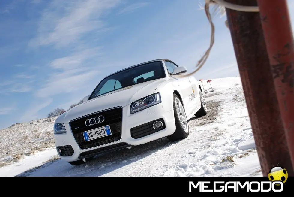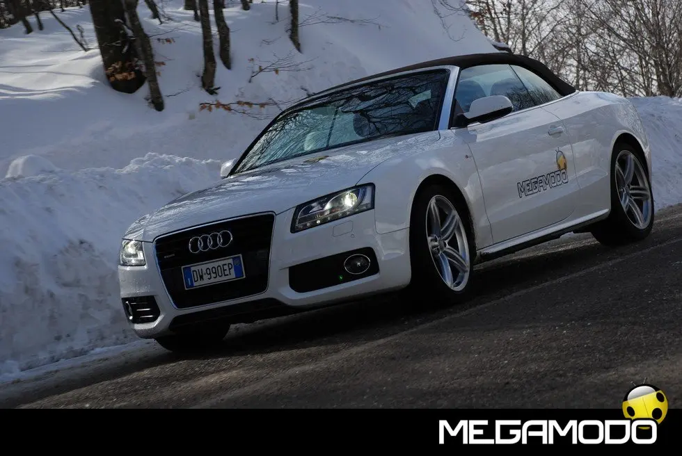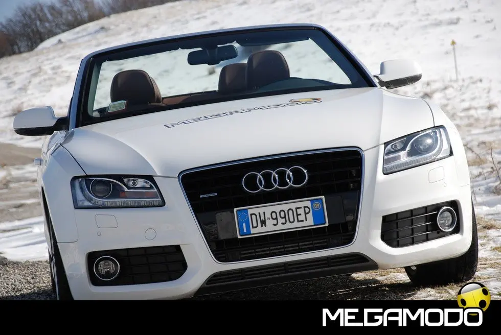A richiesta è disponibile come primo equipaggiamento una sacca portasci, mentre si trova di serie nel vano bagagli una presa di corrente da 12 Volt. Il cofano posteriore con serratura elettrica ha un’apertura che consente di caricare due sacche da golf. Anche la soglia di carico bassa facilita lo sfruttamento del bagagliaio. Il frangivento di serie viene fissato sopra i sedili posteriori, se inutilizzato può essere comodamente ripiegato nel vano bagagli. Come ogni Audi, anche la A5 Cabriolet ha una carrozzeria estremamente rigida, presupposto essenziale per un handling preciso e sportivo, un comfort di rotolamento superiore e un’elevata sicurezza in caso di impatto. Nella A5 scoperta quasi non si percepiscono oscillazioni e vibrazioni; nemmeno sul volante e sui sedili.Per la carrozzeria grezza sono state utilizzate tecnologie innovative. Un esempio paradigmatico è dato dagli acciai ultra-altoresistenziali, per la maggior parte prodotti direttamente dalla Audi con processo di formatura a caldo. Vengono utilizzati nei sottoporta, nei longheroni, nel tunnel centrale, nei montanti centrali e nella traversa del frontale e conciliano il peso contenuto con una resistenza alla trazione estremamente elevata. Una serie di elementi di rinforzo supplementari compensa ampiamente la mancanza di un tetto fisso.
