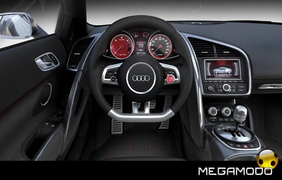 Sul volante trovano posto, oltre al tasto Start/Stop per avviare e spegnere il motore, i pulsanti per scegliere tra le modalità “Dynamic”, “Sport” e “Race” dell’“Audi Drive Select”, il dispositivo che gestisce l’elettronica del motore e gli ammortizzatori “magnetic ride”.