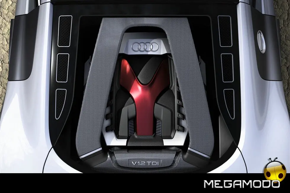 È possibile ammirare il V12 TDI, autentico cuore pulsante di questa vettura sportiva, quasi fosse un’opera d’arte esposta in una teca. La soluzione di design adottata si distingue però chiaramente da quella del modello di serie a ragione del sistema di convogliamento dell’aria posto, qui, sotto il portellone posteriore in vetro con nuovo look. Anche al buio, come nella R8 di serie, è possibile vedere il propulsore attivando i diodi che illuminano il vano motore con l’esclusivo rivestimento in autentiche fibre di carbonio.