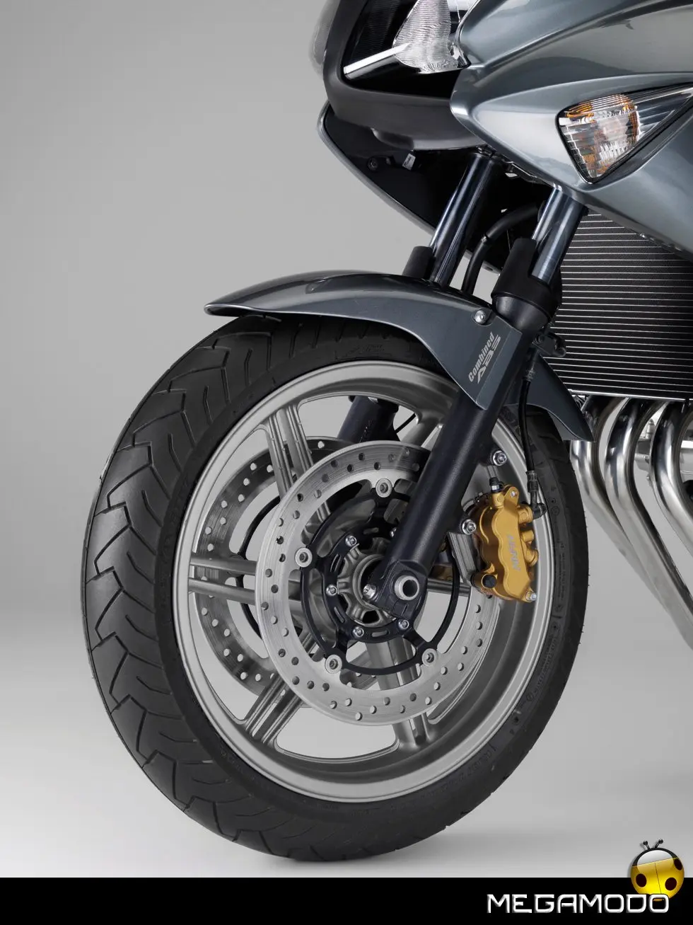 Ruote e Freni La CBF600 conserva le eleganti ruote leggere da 17" a sei razze degli esordi, sempre con pneumatici radiali, un abbinamento che assicura prestazioni e controllo ottimali alle alte velocità, per la massima sicurezza soprattutto nel caso di guidatori meno esperti. La versione “base” della CBF600 offre grande sensibilità e prontezza in frenata grazie al doppio disco idraulico da 296 mm con pinze a due pistoncini ed alle pastiglie in metallo sinterizzato. I nuovi rotori con sei punti d'aggancio contribuiscono a ridurre le masse alternate. Posteriormente, il disco da 240 mm è bloccato efficacemente da una compatta pinza con singolo pistoncino, che regala una frenata decisamente sportiva, perfetta quindi per la guida grintosa concessa dalla nuova CBF.