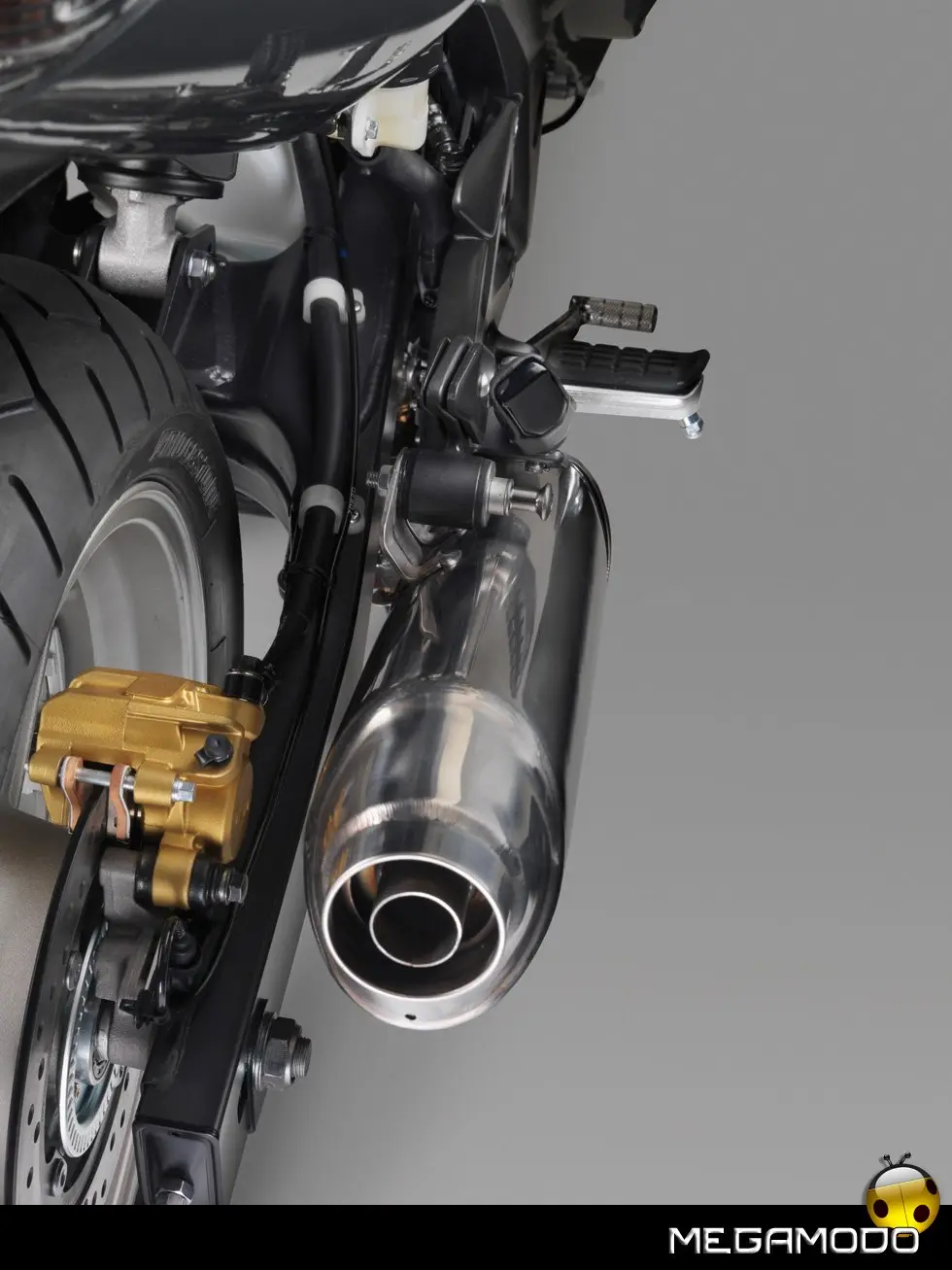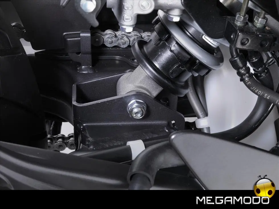 Nuovo Telaio Monotrave in Alluminio L'innovativo telaio monotrave in alluminio, realizzato con l’esclusivo procedimento della fusione gravitazionale, richiama quello già adottato sulla Hornet 600 del 2007. Le tre sezioni pressofuse (trave anteriore con cannotto di sterzo, trave dorsale ed area del perno del forcellone) sono ottimamente saldate, il che comporta una notevole riduzione del peso complessivo. Incastonato in questa semplice struttura, il motore funge da elemento stressato nella classica configurazione romboidale. L’ultraleggero telaio in alluminio migliora di molto la robustezza e la rigidità, garantendo una maggior precisione di guida ed una più spiccata reattività nei cambi di direzione. Robusto anche il telaietto sottosella –in acciaio con sezione a scatola - che può sopportare anche l’adozione delle borse rigide e del bauletto. Per una maggior comodità di guida, sui poggiapiedi sono stati installati dei contrappesi che di fatto eliminano ogni vibrazione. Il nuovo perno del cavalletto centrale e l’astina di richiamo più lunga agevolano il parcheggio della moto.