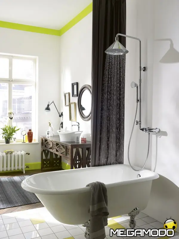 La doccetta manuale è semplicissima eppure insolita, nella sua forma conica che richiama la bocca dell'annaffiatoio. L'erogatore (85mm diametro) ha un solo potente getto a pioggia. Super tradizionale. Ogni ugello finisce con un rivestimento di morbido silicone per rimuovere meccanicamente eventuali residui di calcare. Un pratico set doccia prevede l'inserimento della doccetta su asta e supporto scorrevole.