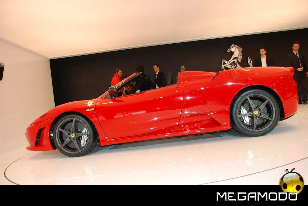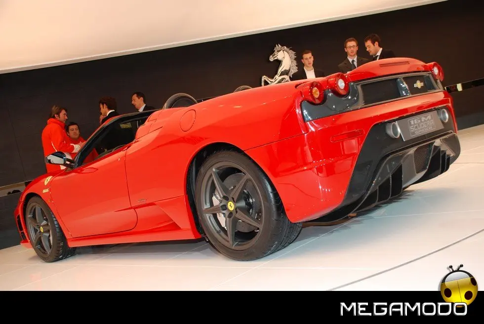 Scuderia Spider 16M La Scuderia Spider 16M è riconoscibile esternamente dalla livrea specifica disponibile in due varianti: la configurazione base è nera con contorno grigio e in alternativa è disponibile la livrea tricolore nel catalogo di personalizzazione "Carrozzeria Scaglietti". Inoltre sulla griglia posteriore è presente la targhetta celebrativa del 16° mondiale Costruttori F1 conquistato dalla Ferrari. Per quanto riguarda gli interni, a sottolineare l'esclusività della vettura, la targhetta "serie limitata" realizzata in argento e posizionata al centro della plancia sopra le bocchette di aerazione. Ulteriori contenuti esclusivi sono il roll bar con guscio esterno in carbonio e l'impianto audio specifico di ultima generazione a cui è possibile abbinare l'Ipod Touch 16 GB personalizzato Ferrari estraibile con alloggiamento sulla vela centrale della plancia. Dal punto di vista tecnico, questa vettura è caratterizzata da un peso a secco di 1340 Kg (- 80 kg rispetto alla F430 Spider), che grazie alla potenza di 510 CV erogata dal motore V8 e ad un rapporto peso potenza di 2.6 kg\CV, assicura prestazioni di assoluto rilievo: accelerazione 0-100 km/h in soli 3.7 secondi e velocità massima di 315 km/h.