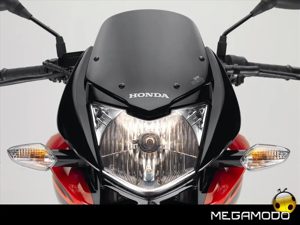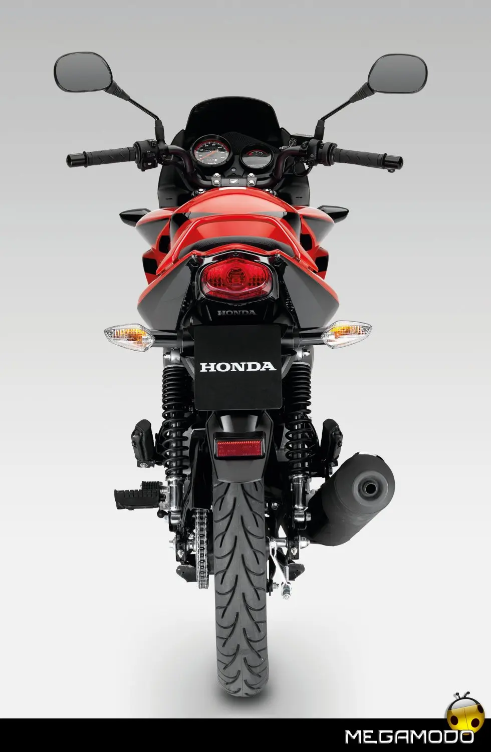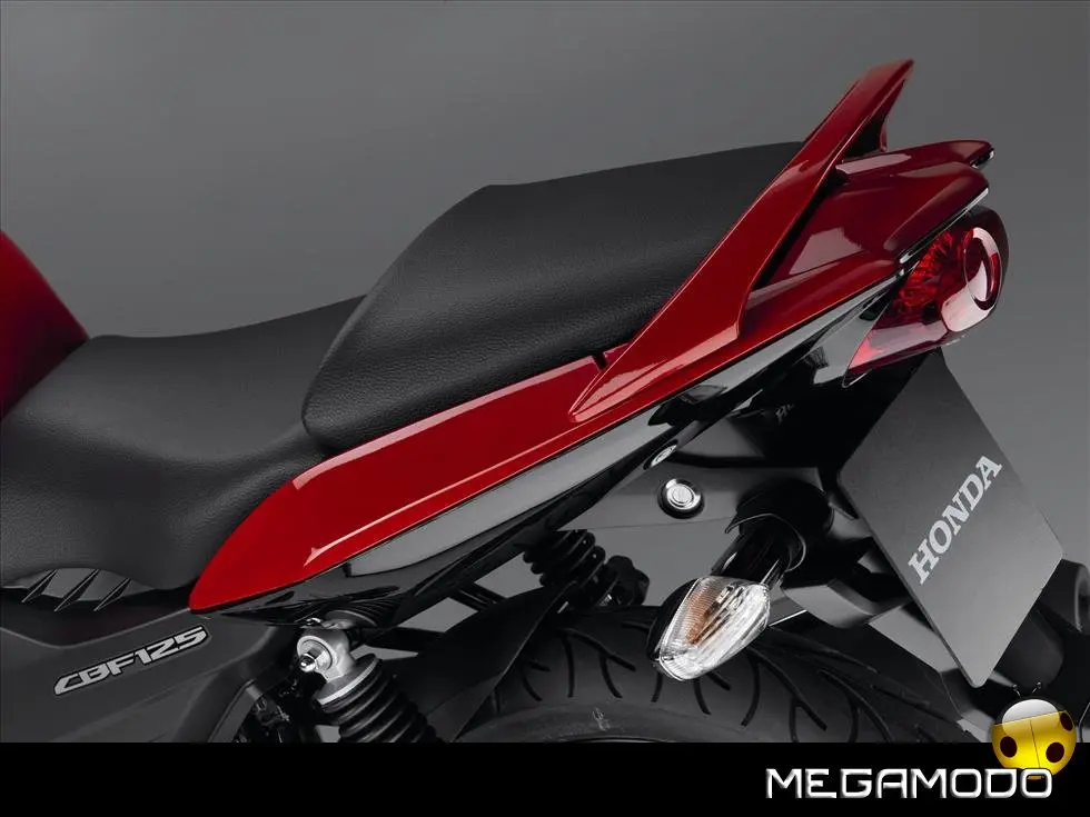 Styling Sviluppata appositamente per il mercato europeo, la CBF125 ha uno styling ricco e si ispira - in questo senso – alle naked, alle motard ed alle semicarenate Honda di grossa cilindrata. Le linee sono compatte, sinuose e d’ispirazione sportiva. Sul muso è ottimamente integrato un elegante minicupolino con un parabrezza fumé, che offre una certa protezione dal vento alle alte velocità. Il manubrio, più alto del solito, ha un appeal proprio dello stile naked. Bassa da terra, la sella rende particolarmente confortevole la posizione di guida, garantendo una chiara visuale del traffico. Il pannello strumenti elettronico è molto ordinato e di facile lettura, con tachimetro, spia della freccia ed un ampio indicatore del carburante d’immediata lettura. L’intera struttura è ospitata in una struttura carbon-look, per un aspetto sportivo e quanto mai funzionale. Il design del frontale integra con eleganza i brillanti fari multi-reflector nascosti dietro un’unica lente, per un originale disegno felino che ne accentua il profilo dinamico. Il generoso serbatoio da 13 litri è un perfetto complemento per le linee aerodinamiche dell’anteriore, e la splendida grafica con l’ala stilizzata (come sulle CBR) sancisce il carattere sportivo di questa 125cc, rivelandone la nobile discendenza. L’attenzione per il dettaglio non termina certo qui. Il profilo posteriore si focalizza sul faro a forma di cuneo e sulla coppia di indicatori ovali, con lenti chiare e lampade color ambra, che rendono tanto attraente il… lato B della CBF. Una soluzione che si pone al servizio della funzionalità e che garantisce maggiore sicurezza. Se necessario, è possibile sostituire rapidamente la lampadina del faro posteriore, grazie al pratico accesso nello spazio sottosella.