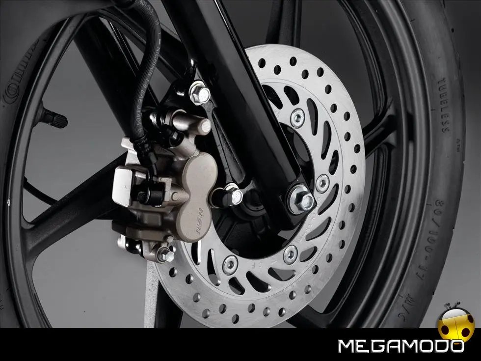 Originale design dei cerchi Gli splendidi cerchi in lega da 17" con l’elegante configurazione a 6 razze e colorazione Mat Axis Grey Metallic amplificano il fascino da “vera moto” della CBF125, con il vantaggio di tanta robustezza e facilità nella pulizia. Anteriormente, il profilo della ruota è accentuato da un sportivo parafango bicolore - nero ed argento, un tema ripreso originalmente anche al posteriore, dove il rivestimento dello pneumatico (simil-CBR anche in questo caso) si abbina ad una efficace protezione del forcellone. Il pneumatico tubeless ad ampia sezione contribuisce al comfort ed alla precisione di guida, accentuando l’immagine da streetfighter della CBF.