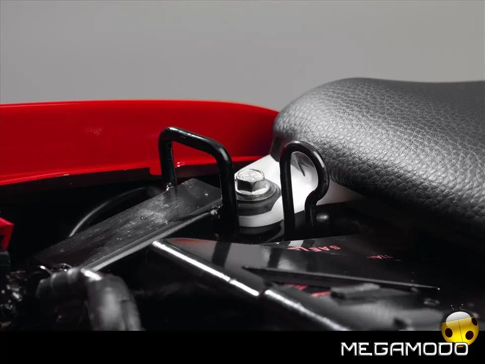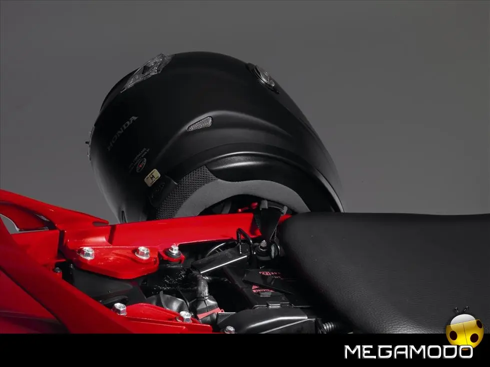 Spazio sottosella, kit attrezzi e gancio portacasco La sella della CBF125 nasconde alla vista un pratico vano sottosella, nel quale riporre piccoli oggetti. Può ospitare anche il kit attrezzi. Un comodo gancio interno permette invece di agganciare l’anello del casco. Una volta chiusa la sella, viene così fissato alla moto e (parzialmente) protetto da eventuali malintenzionati