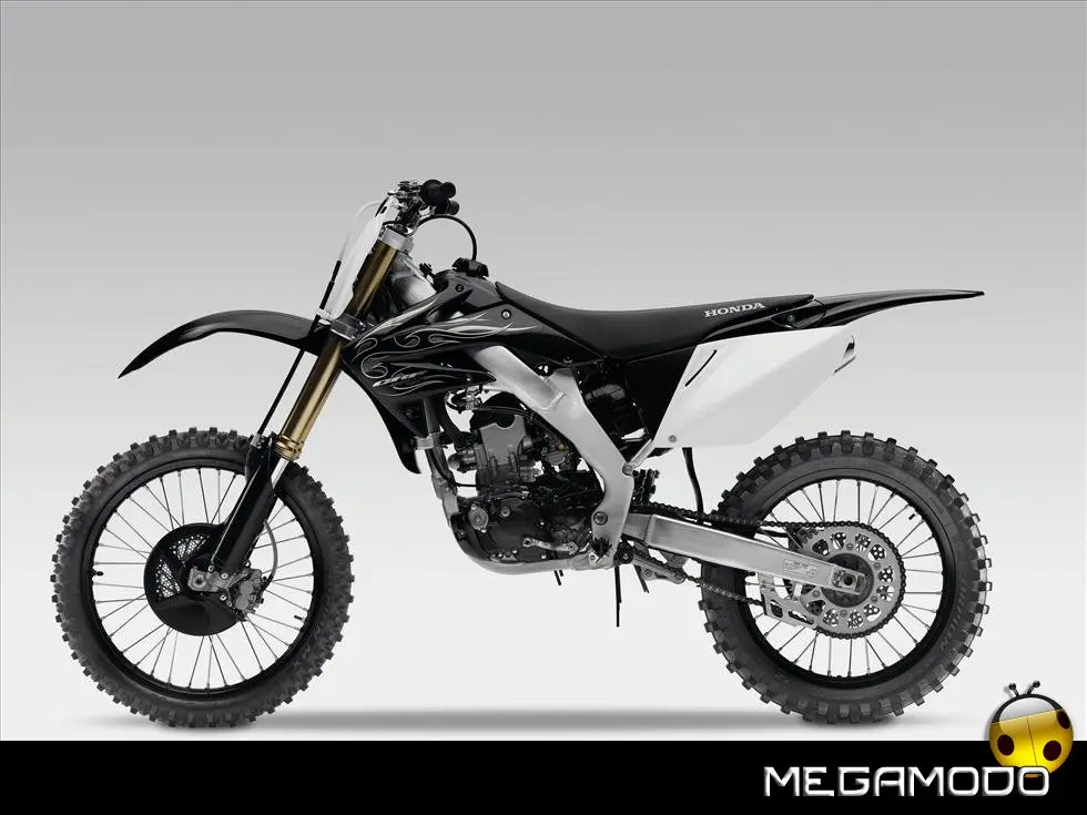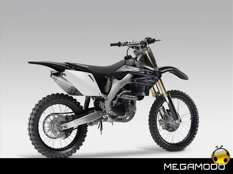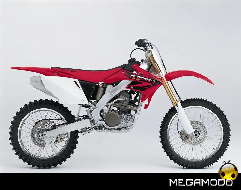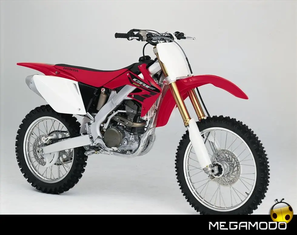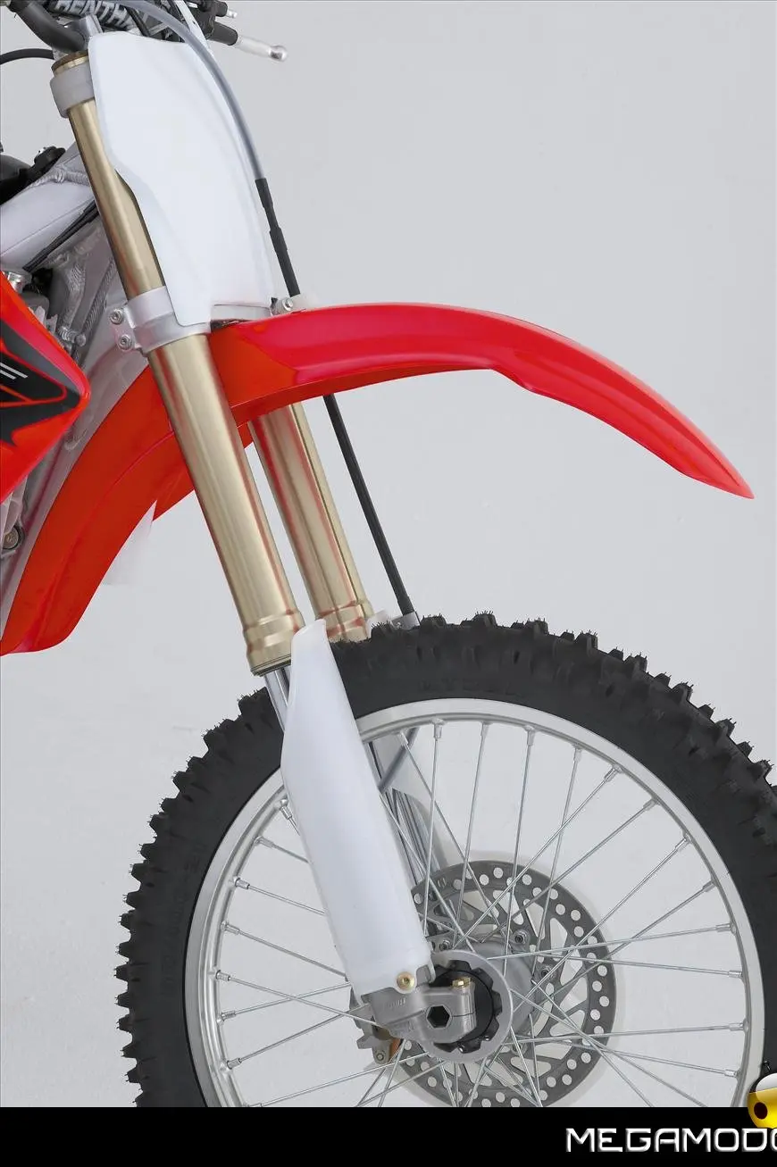 Telaio/Sospensioni - Nuovo telaio di IV generazione a doppia trave in alluminio, con piastra di sterzo in alluminio forgiato e sezione rastremata del tubo discendente, per una ottimizzata rigidezza del telaio. Le (alte) piastre del perno del forcellone e le sottili travi del telaio formano una sezione incrociata che migliora il comfort del pilota e la maneggevolezza complessiva. - Forcellone a due bracci rastremati, con ampia struttura incrociata in alluminio pressofuso. - Cerchio anteriore e posteriore con raggi in alluminio derivati dalle competizioni (HRC), per ridurre le masse alternate. - L’asse posteriore (diametro 25 mm), con cuscinetti di grande diametro, assicura rigidità e robustezza ottimali sui tracciati tortuosi. - Forcella rovesciata Showa con doppia camera da 47 mm, cartuccia interna con trattamento Kashima e nuovo settaggio. Escursione da 315 mm, regolabile nel ritorno (16 posizioni) e nella compressione. - Sospensione posteriore Pro-Link con monoammortizzatore Showa interamente regolabile; nuovo assetto, escursione da 314 mm, regolazione della compressione separata per le basse velocità (13 posizioni) e le alte velocità (3,5 giri), regolazione del ritorno in 17 posizioni. - Pistone dell'ammortizzatore posteriore da 50 mm di diametro, per prestazioni sempre ottimali anche nelle condizioni più difficili. - Pompa del freno anteriore “link type” con disco alleggerito, per una grande efficacia dell’impianto. - Pinza del freno anteriore con due pistoncini in alluminio anodizzato. Il disco anteriore alleggerito riduce le masse alternate, migliorando la maneggevolezza del mezzo. - Freno posteriore derivato dalle competizioni (HRC); integra la pompa secondaria ed il serbatoio del fluido, eliminando il classico serbatoio esterno ed il manicotto. - Freno a disco anteriore e posteriore da 240mm - Piastra forcella con offset di 22 mm, per facilitare l’ingresso e la percorrenza in curva. - L’assetto del “mono” posteriore è stato adeguato alle modifiche effettuate sulla forcella.