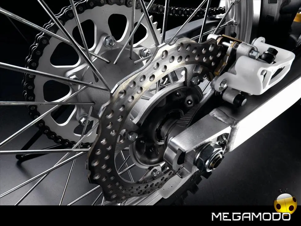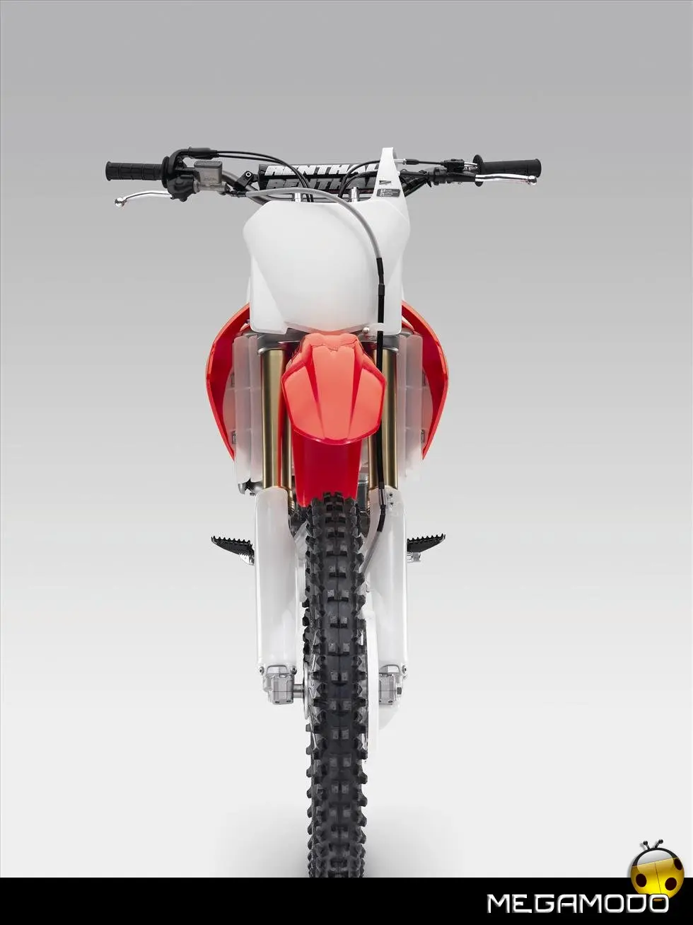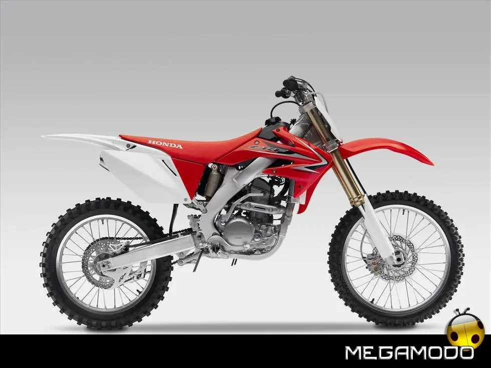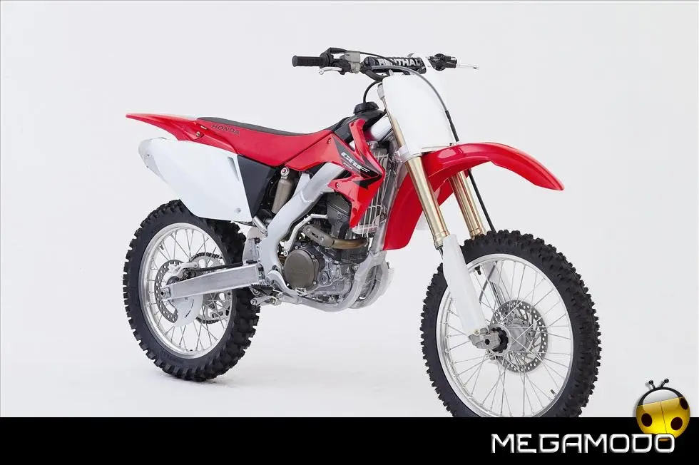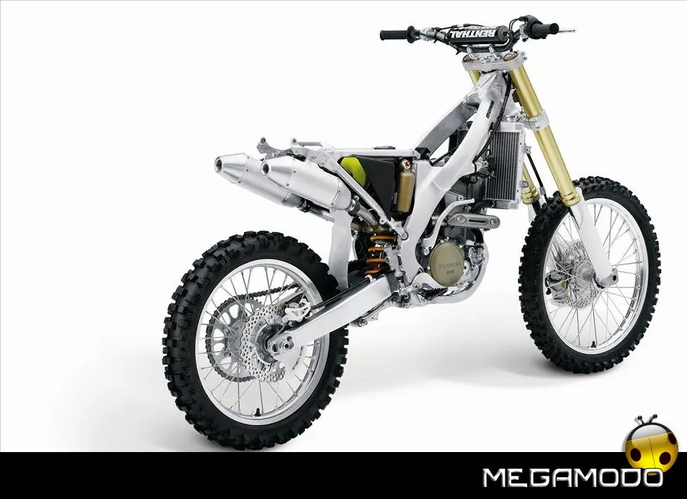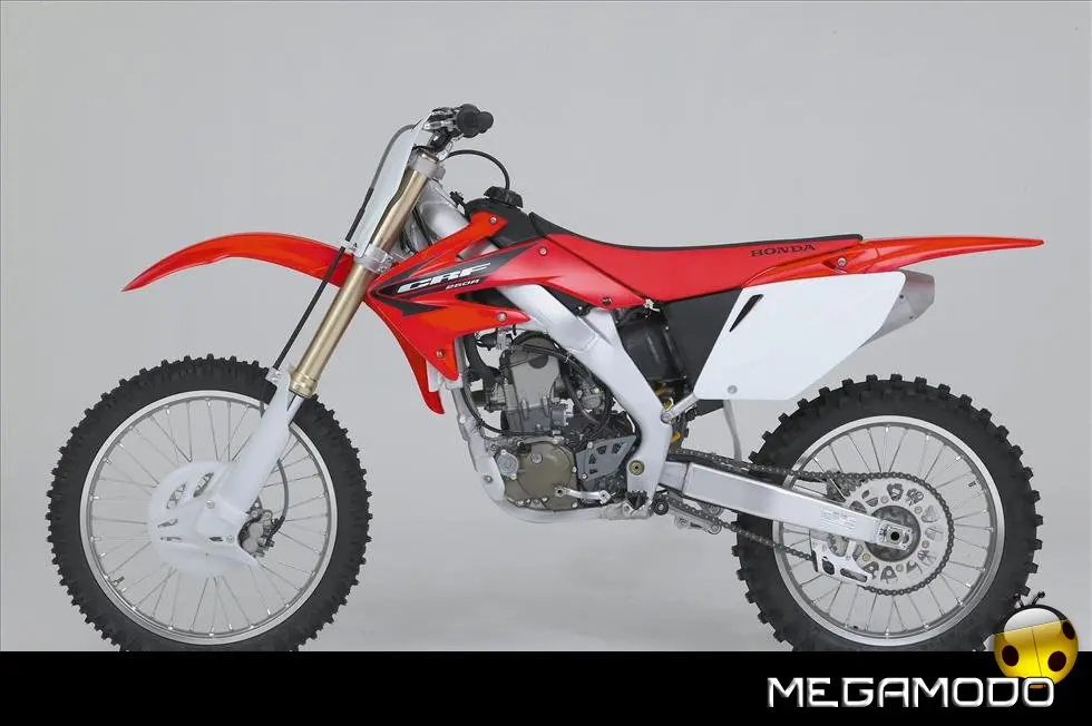Telaio/Sospensioni - Nuovo telaio di IV generazione a doppia trave in alluminio, con piastra di sterzo in alluminio forgiato e sezione rastremata del tubo discendente, per una ottimizzata rigidezza del telaio. Le (alte) piastre del perno del forcellone e le sottili travi del telaio formano una sezione incrociata che migliora il comfort del pilota e la maneggevolezza complessiva. - Forcellone a due bracci rastremati, con ampia struttura incrociata in alluminio pressofuso. - Cerchio anteriore e posteriore con raggi in alluminio derivati dalle competizioni (HRC), per ridurre le masse alternate. - L’asse posteriore (diametro 25 mm), con cuscinetti di grande diametro, assicura rigidità e robustezza ottimali sui tracciati tortuosi. - Forcella rovesciata Showa con doppia camera da 47 mm, cartuccia interna con trattamento Kashima e nuovo settaggio. Escursione da 315 mm, regolabile nel ritorno (16 posizioni) e nella compressione. - Sospensione posteriore Pro-Link con monoammortizzatore Showa interamente regolabile; nuovo assetto, escursione da 314 mm, regolazione della compressione separata per le basse velocità (13 posizioni) e le alte velocità (3,5 giri), regolazione del ritorno in 17 posizioni. - Pistone dell'ammortizzatore posteriore da 50 mm di diametro, per prestazioni sempre ottimali anche nelle condizioni più difficili. - Pompa del freno anteriore “link type” con disco alleggerito, per una grande efficacia dell’impianto. - Pinza del freno anteriore con due pistoncini in alluminio anodizzato. Il disco anteriore alleggerito riduce le masse alternate, migliorando la maneggevolezza del mezzo. - Freno posteriore derivato dalle competizioni (HRC); integra la pompa secondaria ed il serbatoio del fluido, eliminando il classico serbatoio esterno ed il manicotto. - Freno a disco anteriore e posteriore da 240mm - Piastra forcella con offset di 22 mm, per facilitare l’ingresso e la percorrenza in curva. - L’assetto del “mono” posteriore è stato adeguato alle modifiche effettuate sulla forcella.